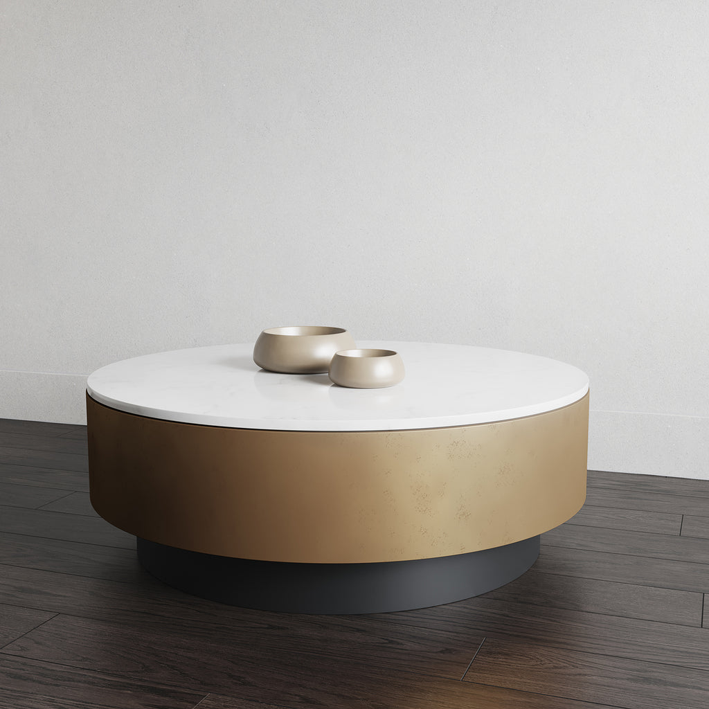 Exuding pure opulence, this splendid coffee table is designed to be noticed. Features a white marble top with a steel base in antique brass and black.