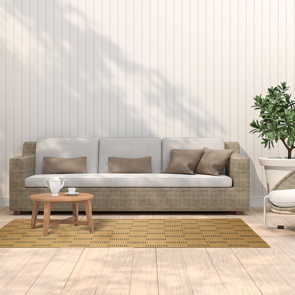 This reversible indoor/outdoor rug consists of 100% recycled polyester fibers. Featuring a double dash design in a natural colorway, this all-weather, fade resistant rug brings sumptuous style to high-traffic areas including hallways, outdoor patios, and more.