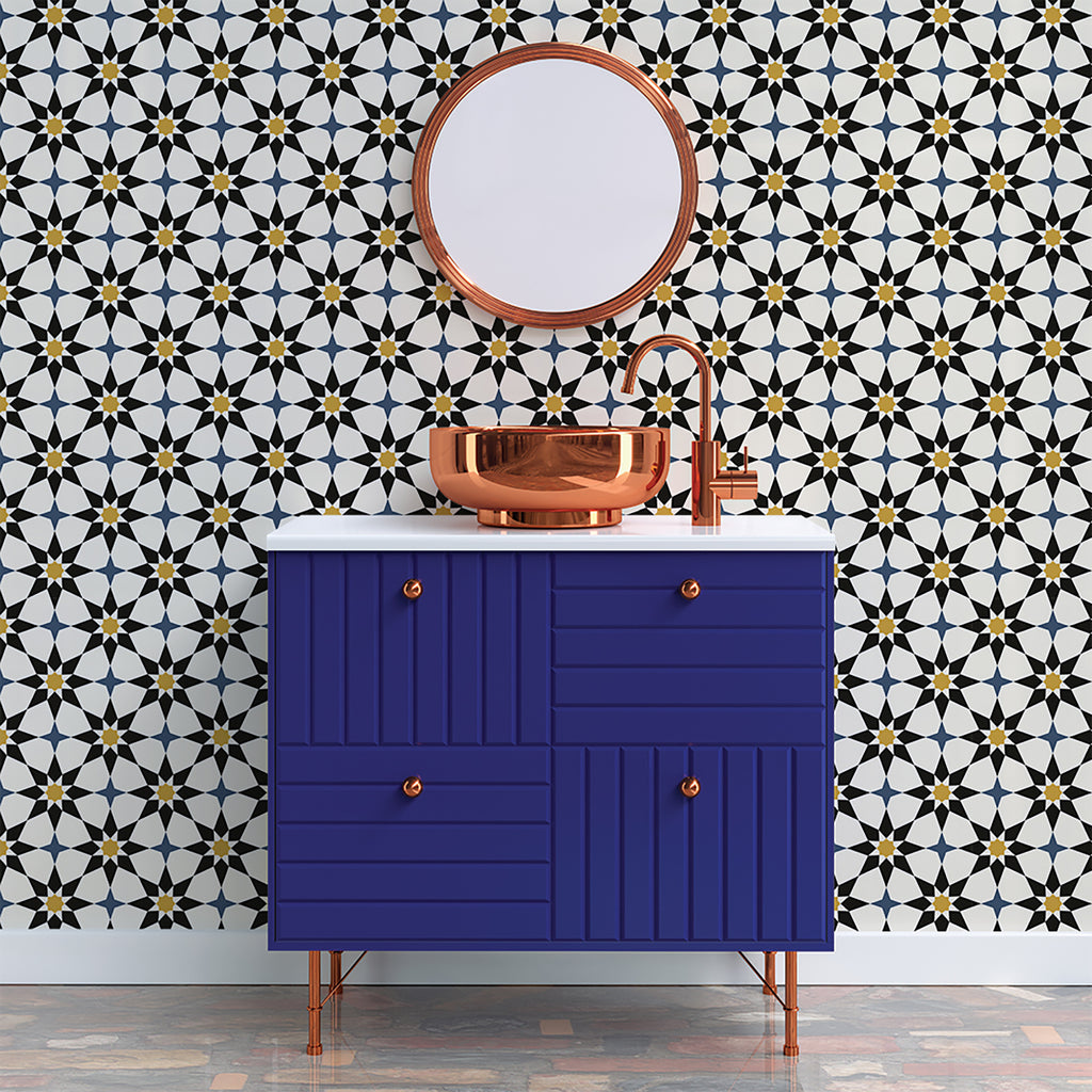 Golden starbursts inspired by Morocco’s colorful culture look like expensive imported tiles. Exotic? Definitely. We promise their graphic charm will make any space captivating. Here’s more to love about this black and cream mosaic tile print: Since it’s a removable wallpaper that’s simple to align, stick, and place—it’s sure to be one of the most enjoyable DIY projects ever. We love this look in bathrooms, kitchens, and unexpected places.