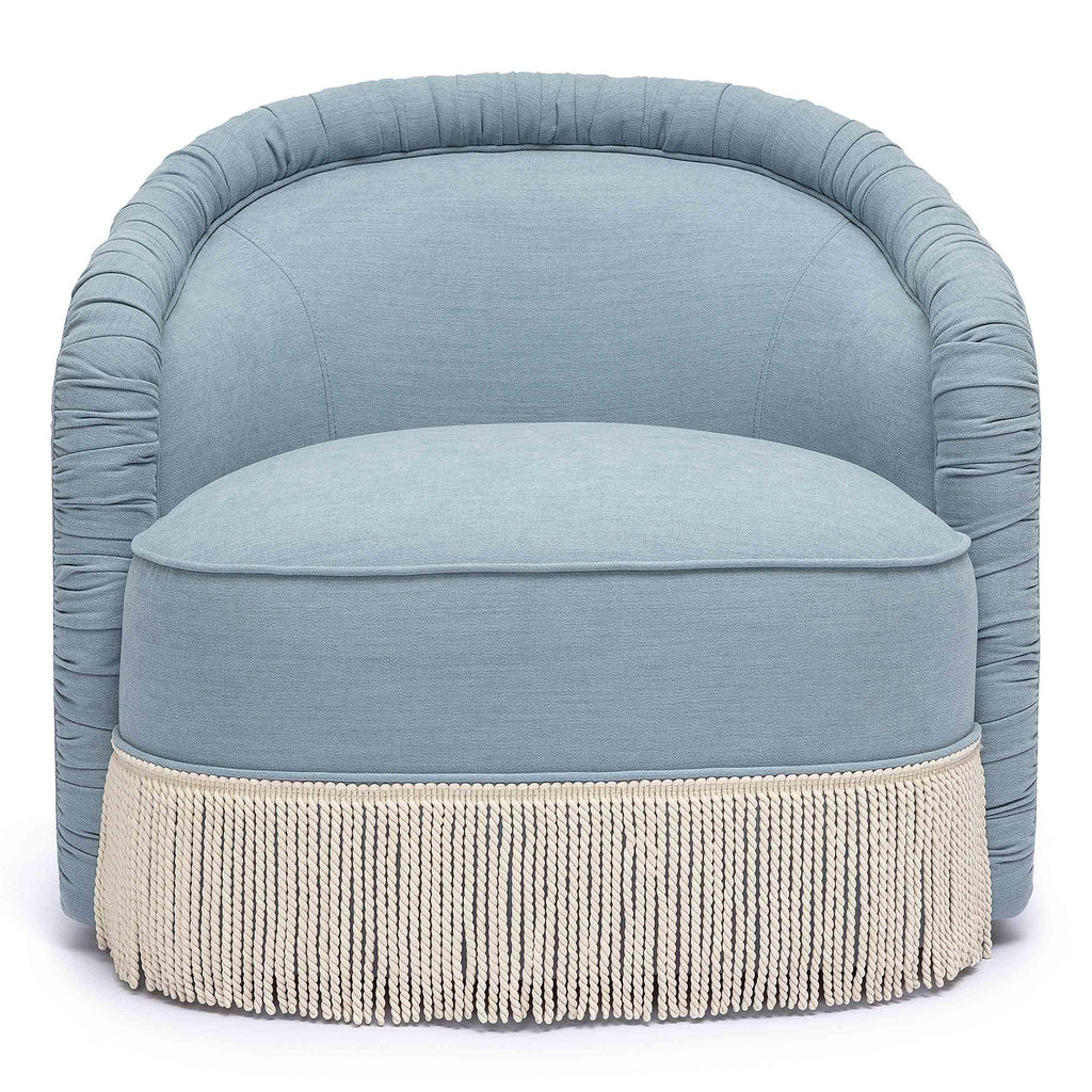 Introducing the TOV Furniture Pamela Tassel Lounge Chair, a grandmillennial dream come true, available in luxurious Cream Boucle or serene Faded Blue Recycled Fabric. This sumptuous armchair boasts exquisite English ruched pleating, accented with high-end tassels that add the perfect decorative element to your space. Its incredibly comfortable design beckons you to unwind and relax, reassured by the fact that its soft, textured appearance is crafted from commercial-grade, environmentally-friendly fabrics made from upcycled plastic bottles.