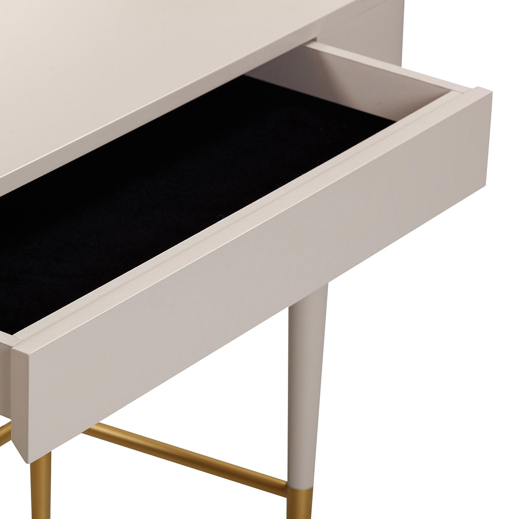 Indulge in the boutique hotel elegance of the TOV Furniture Penelope Vegan Leather Wrapped Vanity Desk. This piece oozes sophistication with its uber-chic design, while its velvet-lined drawer and convenient shelf provide a touch of luxury for all your beauty essentials. Complete with a glamorous attached mirror, it's the perfect companion for those "Get Ready with Me" moments, making your daily routine feel like a red-carpet event. Available in Cream or Taupe.