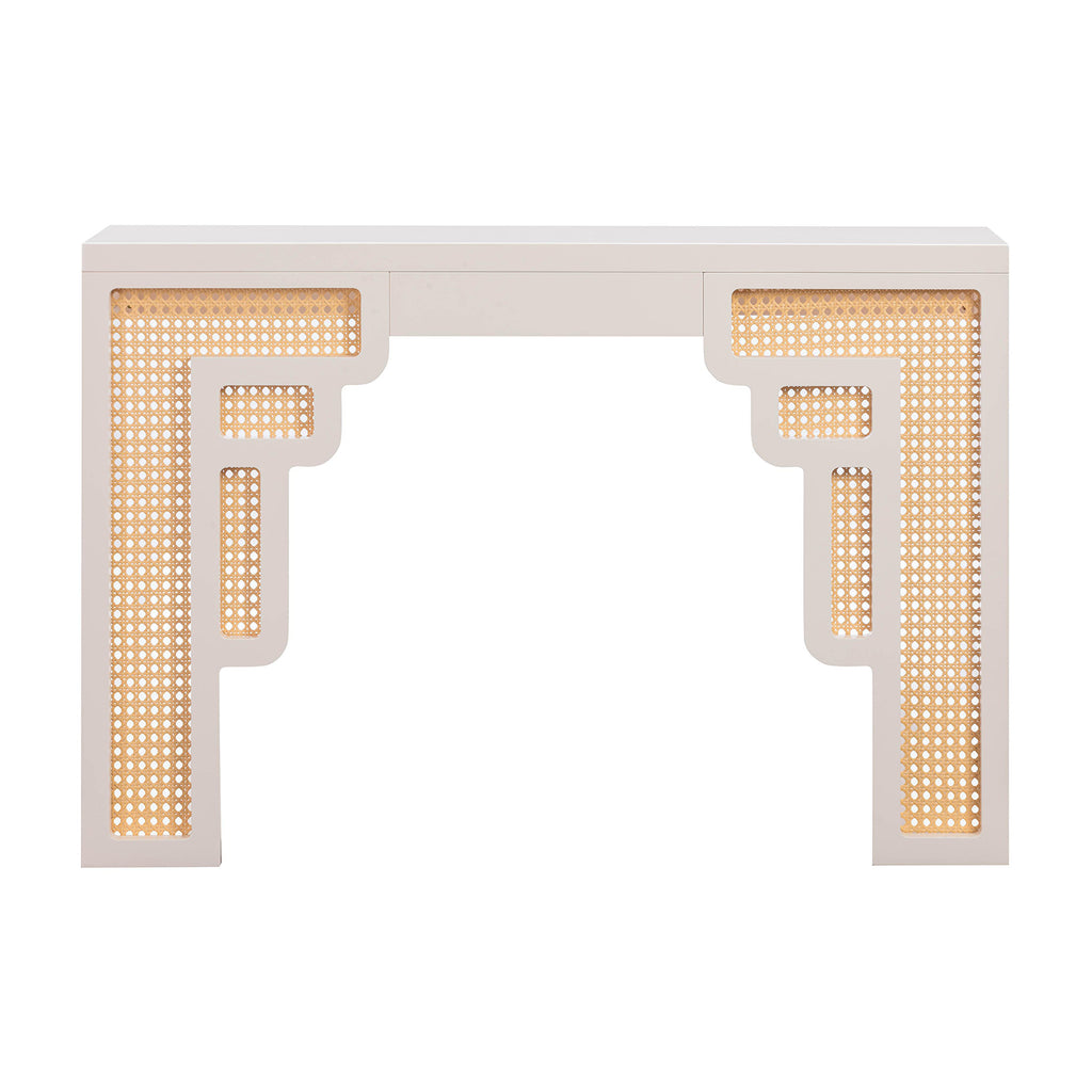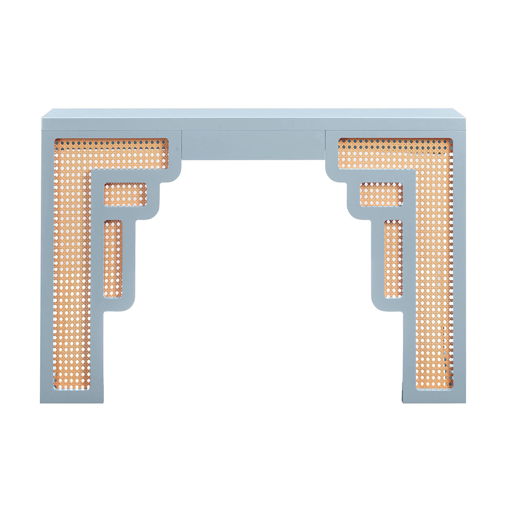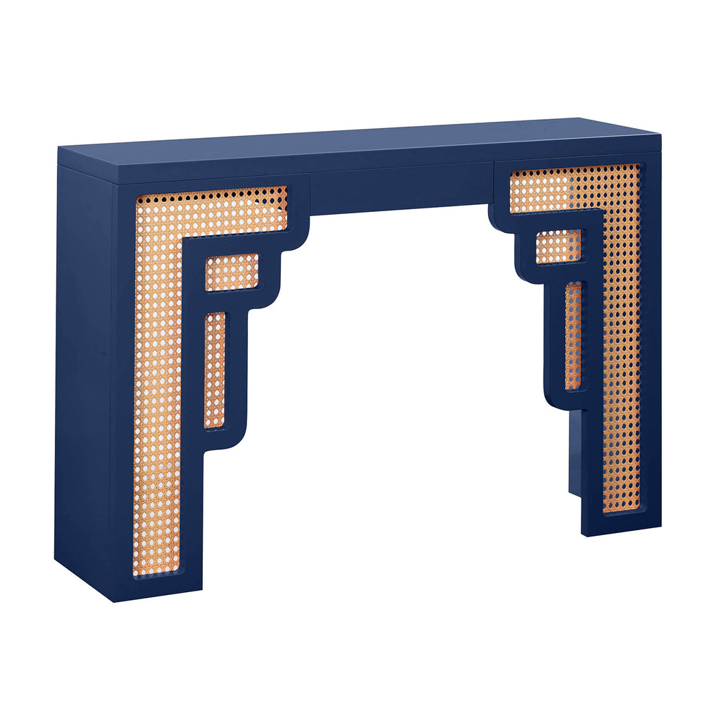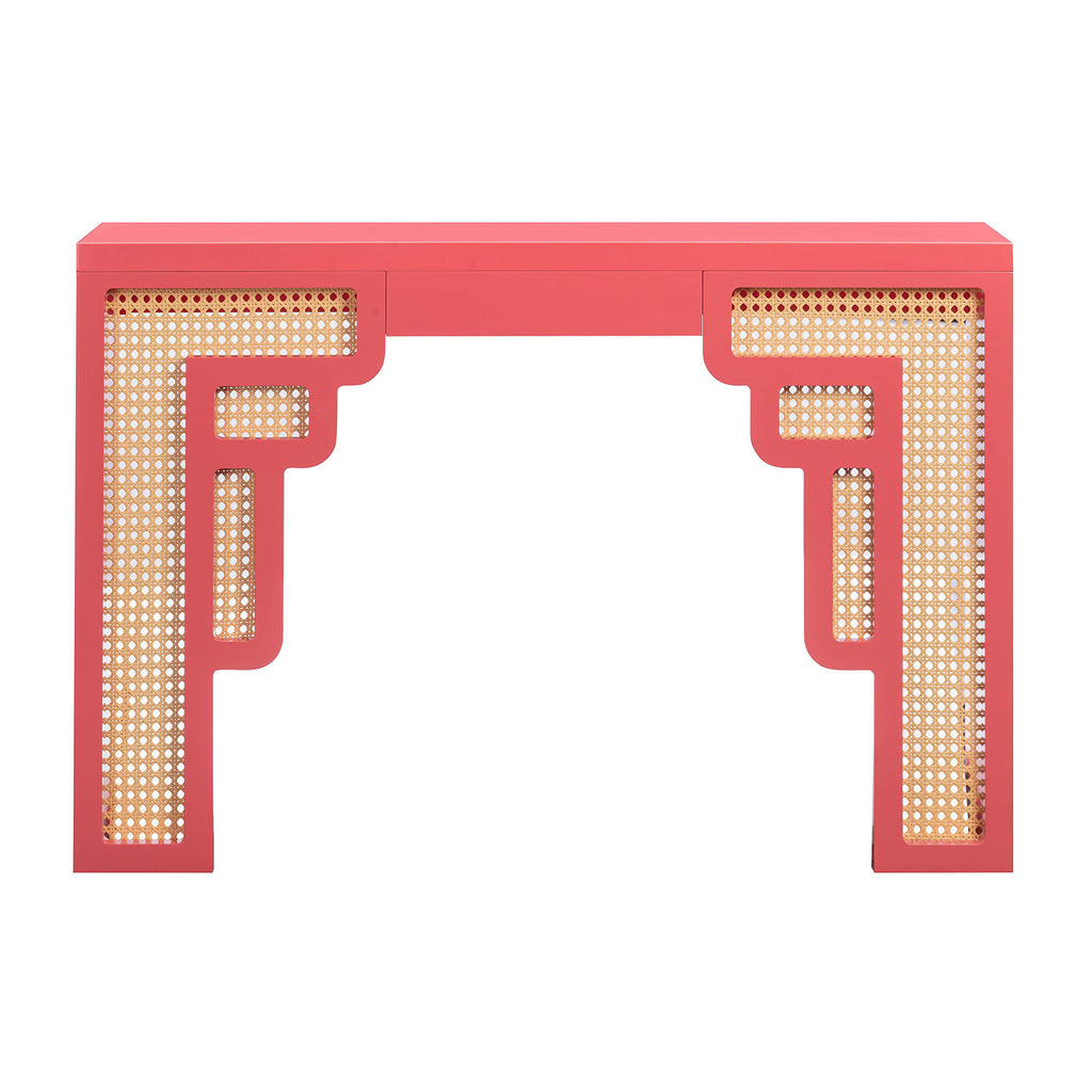 Inspired by the Art Moderne style, the Suzie console table alludes to Palm Springs' art-deco design through its bold colors and curvaceous form. This wooden console table is available in several exciting colors and its rounded edges and woven rattan details add a playful twist. The Suzie will cement itself as the perfect balance between contemporary living with a touch of glamour in your space!