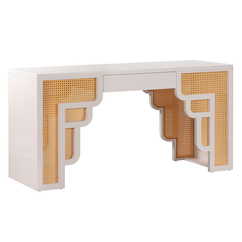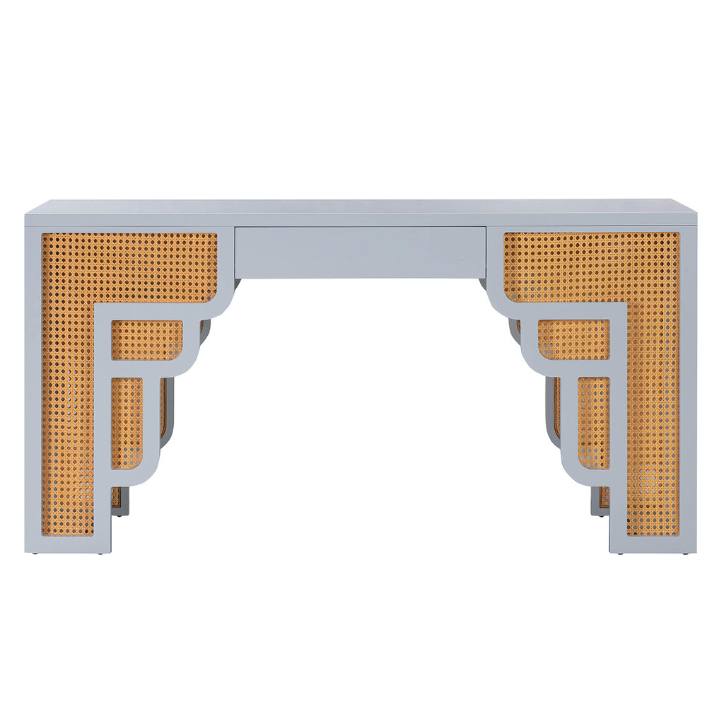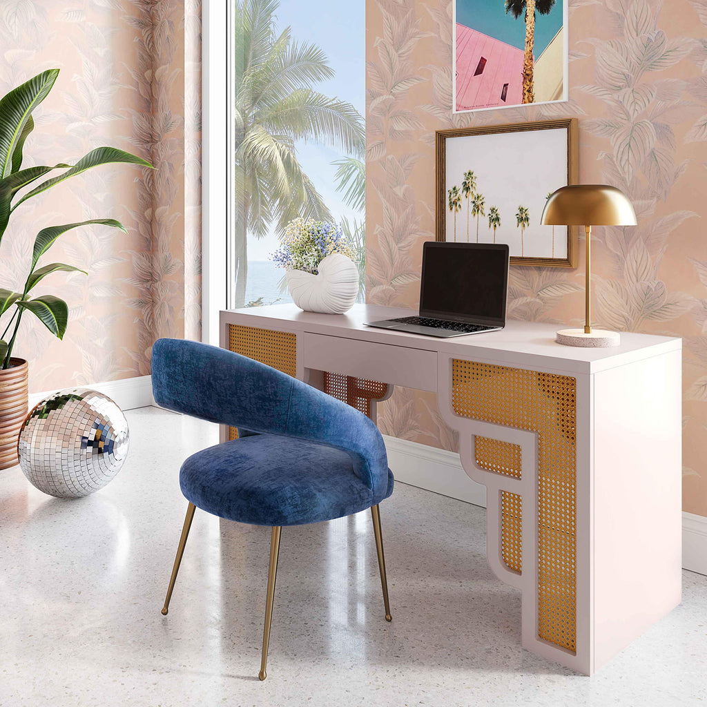Inspired by the Art Moderne style, the Suzie Desk alludes to Palm Springs art-deco design through its bold colors and curvaceous form. This wooden desk features a soft close drawer for practicality; while its rounded edges and woven rattan details add a playful twist. The Suzie will cement itself as the perfect balance between contemporary living with a touch of glamour in your space!