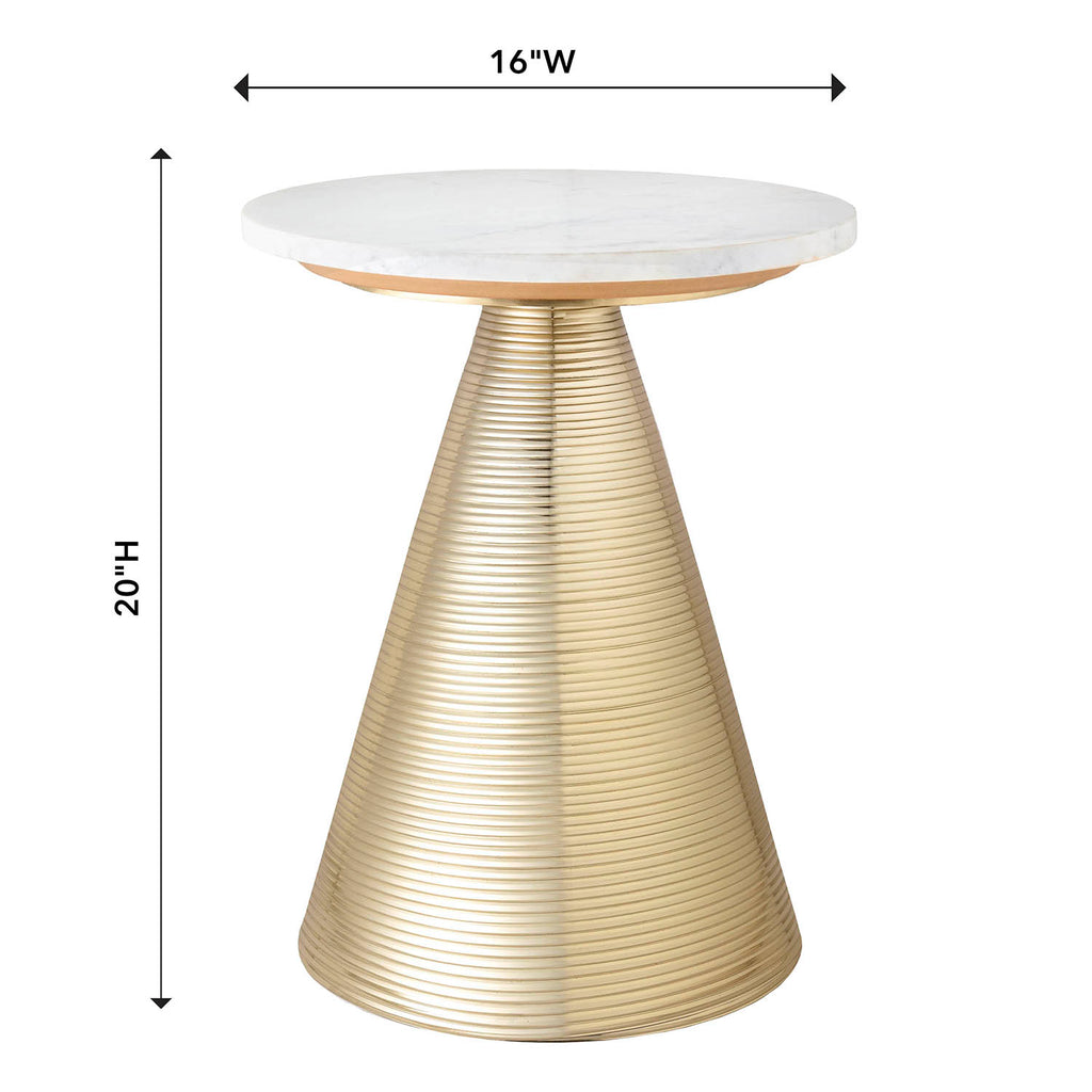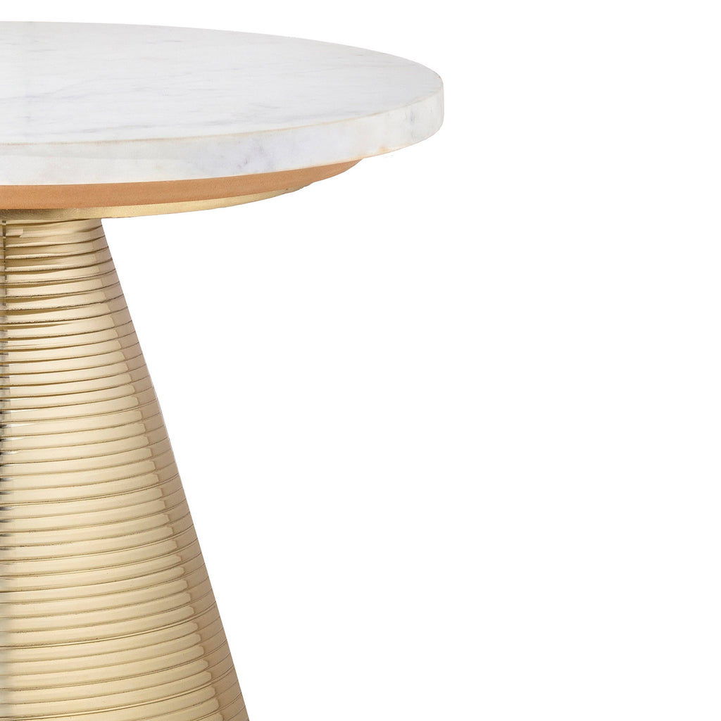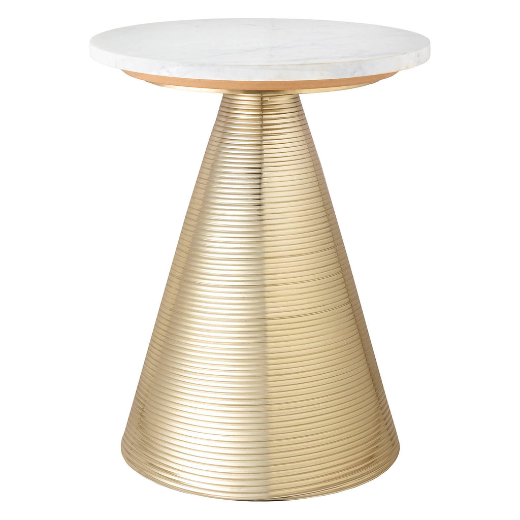 White marble perched upon a conical base, the Tempo cocktail table is brimming with refinement. Finished in glossy gold, this table will add glamorous style to any space. Combine with the Tempo side table for a standout set. As this is a handmade product, slight variations are to be expected and may result in small gaps between the marble and frame.