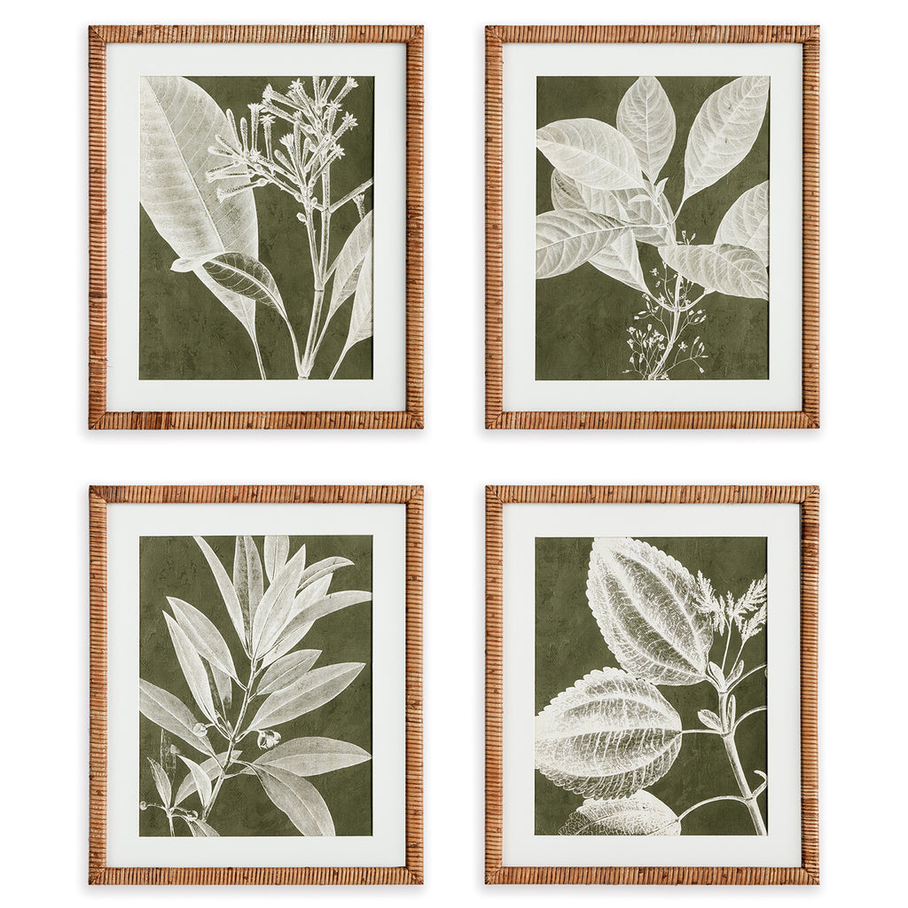 In a rich olive tone, these assorted stem prints are a play on positive and negative space. Bold in scale, with a contemporary composition, this set of prints is finished off with real mats and rattan wrapped frames.