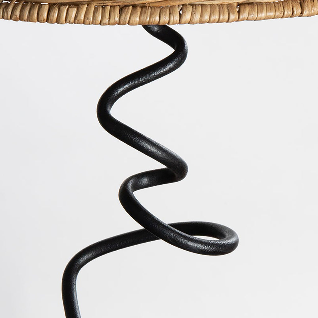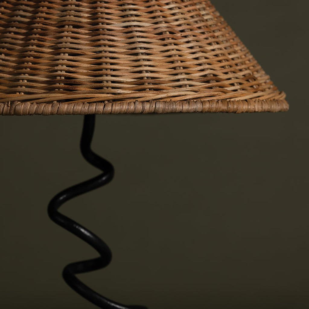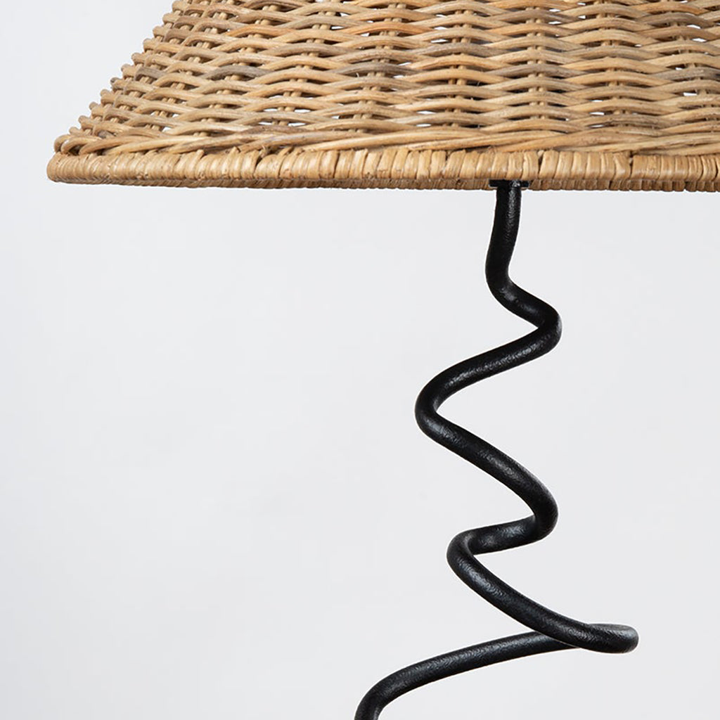 A slender Forged Iron stem twists and turns from the metal base up and through the tapered natural rattan shade for a whimsical form that still feels serious and sculptural. Place this lamp on surfaces throughout the home to add a playful, artful style.