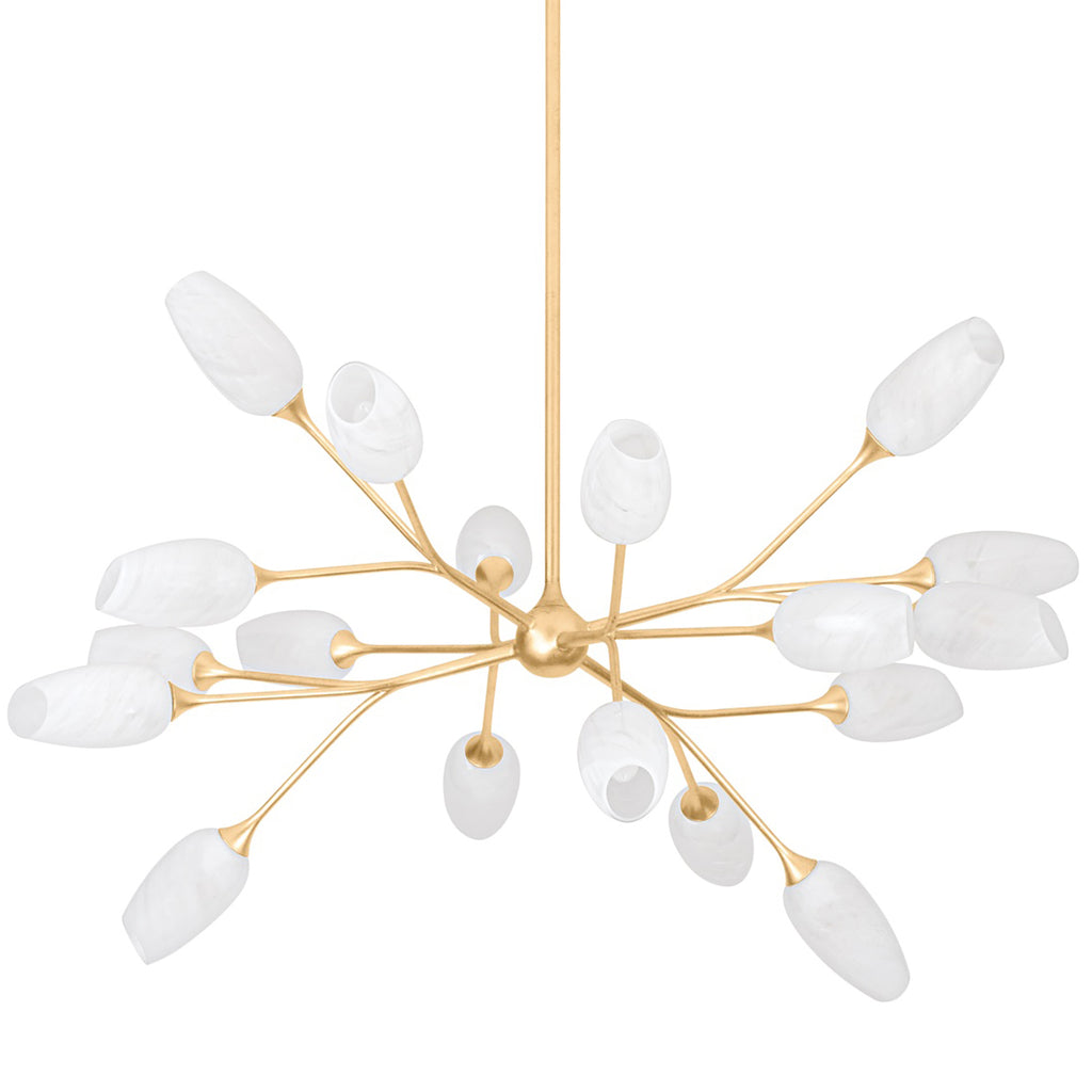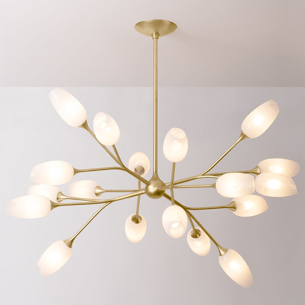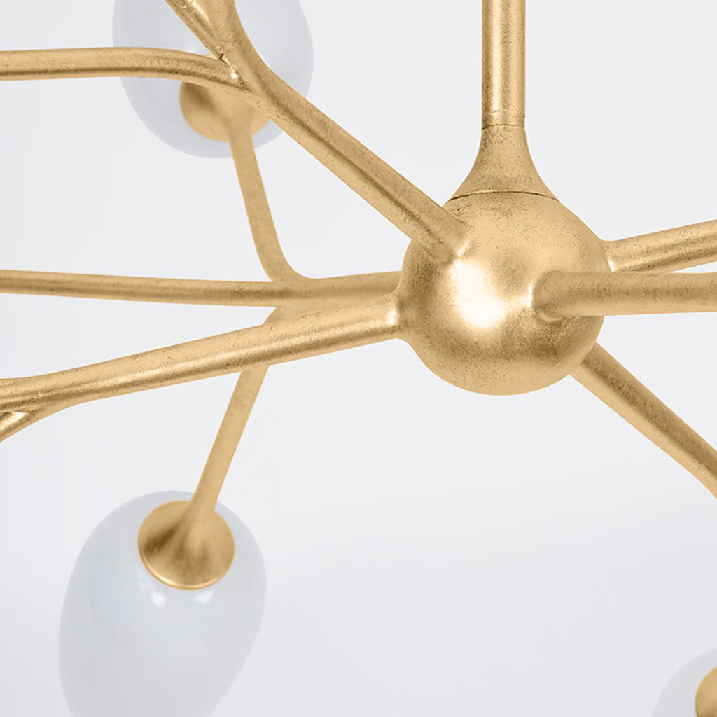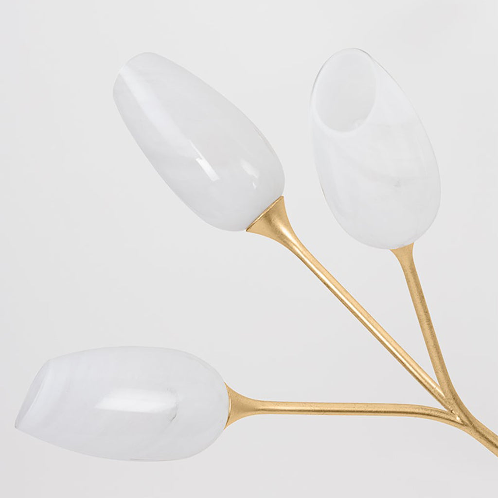Inspired by the sprightly buds of a dill plant, individual clusters of stems branch away from one another in the show-stopping Troy Aldean Chandelier. Each shade is handcrafted from Cloud Glass and supported by a framework finished in Vintage Gold Leaf. When illuminated, this fixture casts shadows on the ceiling, introducing drama to any space. Troy Aldean is available as a 3-light sconce and a 9-light or 18-light chandelier.