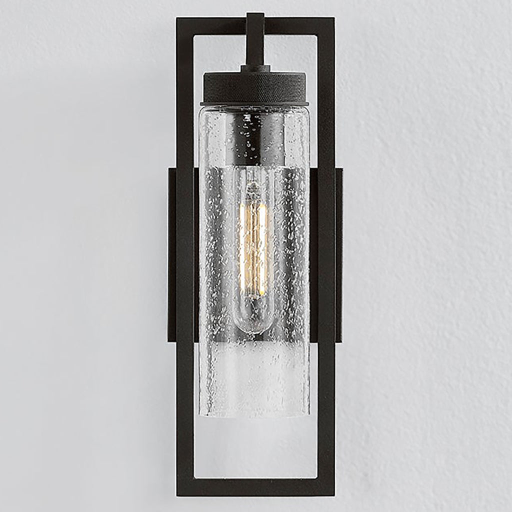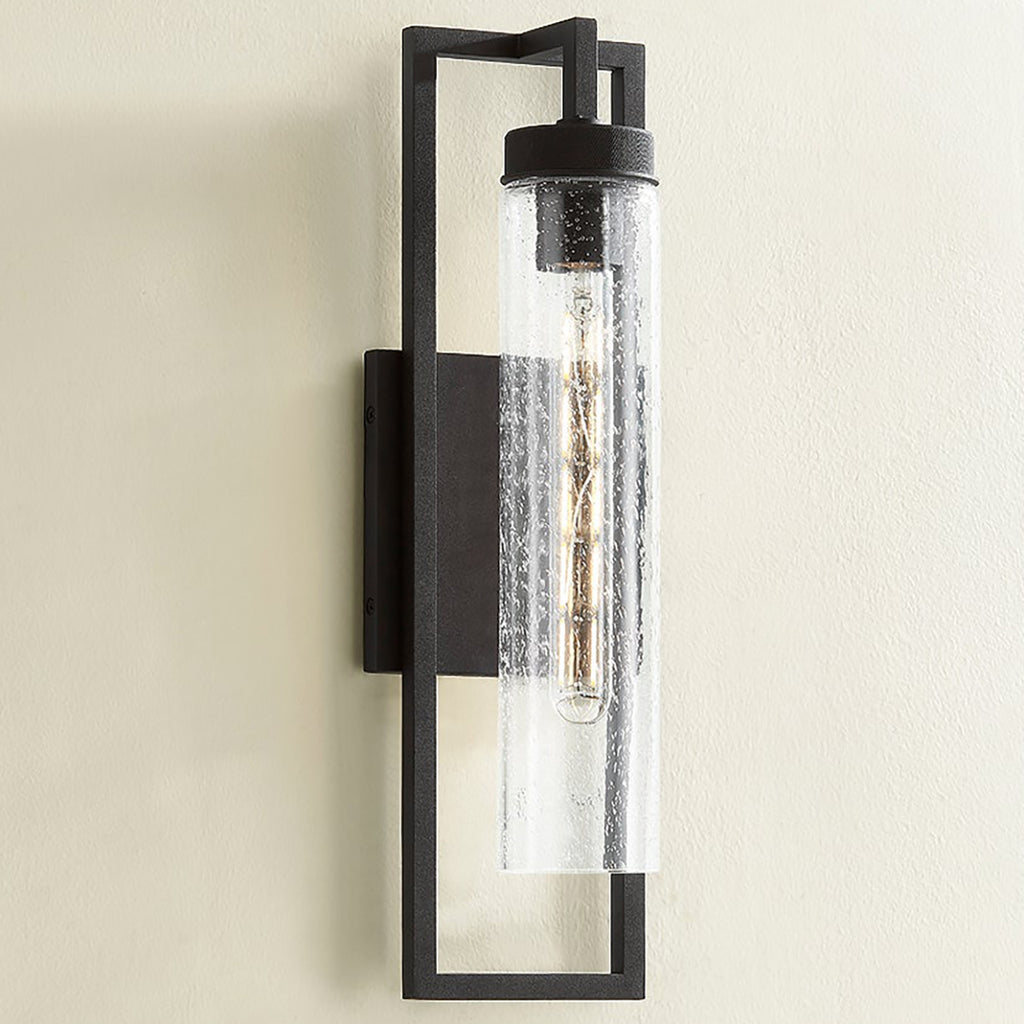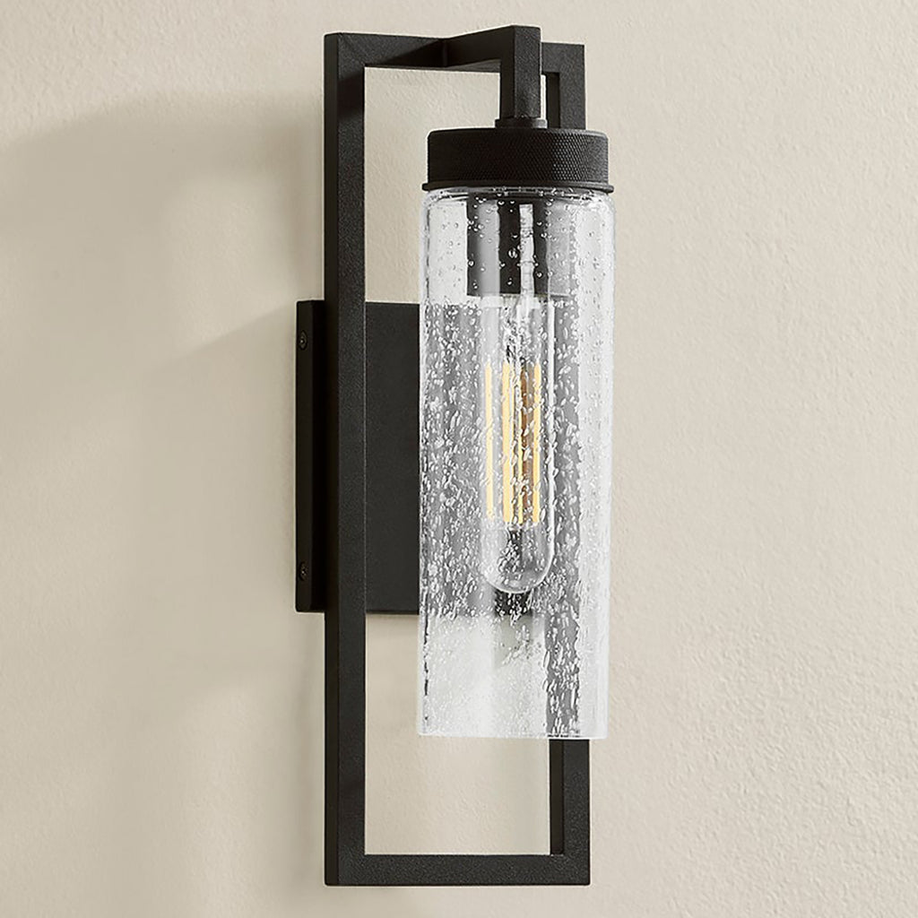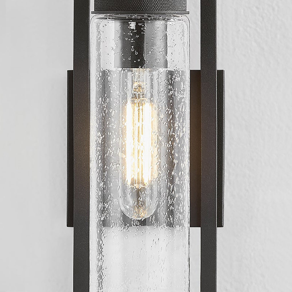 An expression of architectural geometry, Troy Chester Outdoor Wall Sconce features a graphic composition with a pared-back silhouette and clean, bold lines. The sleek, industrial quality of the Textured Black frame is balanced by a Clear Seeded Glass cylinder that serves as a shade for the light source. Available in two sizes, this sconce adds understated style to modern exteriors.