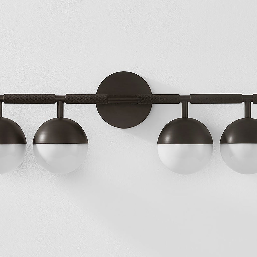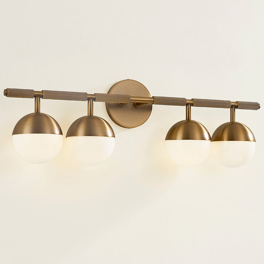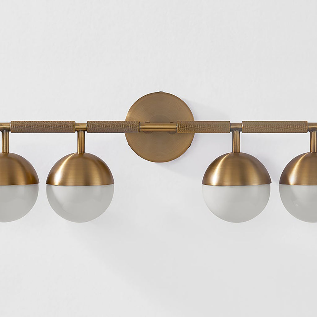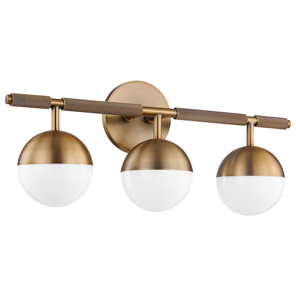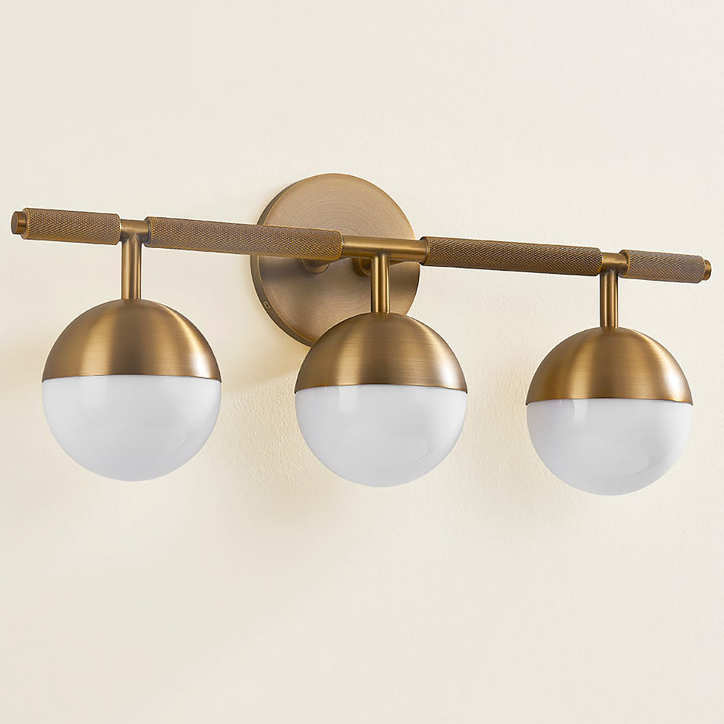 Taking inspiration from modern jewelry, Troy Enson Bath Light features architecturally suspended Opal Shiny Glass globes that lend a sophisticated feel to the piece. The silhouette is clean and modernist, but upon closer inspection, one notices the textural, knurled details. Available as a 3 or 4- light wall fixture, Troy Enson is finished in warm, reflective Patina Brass or dark Bronze.