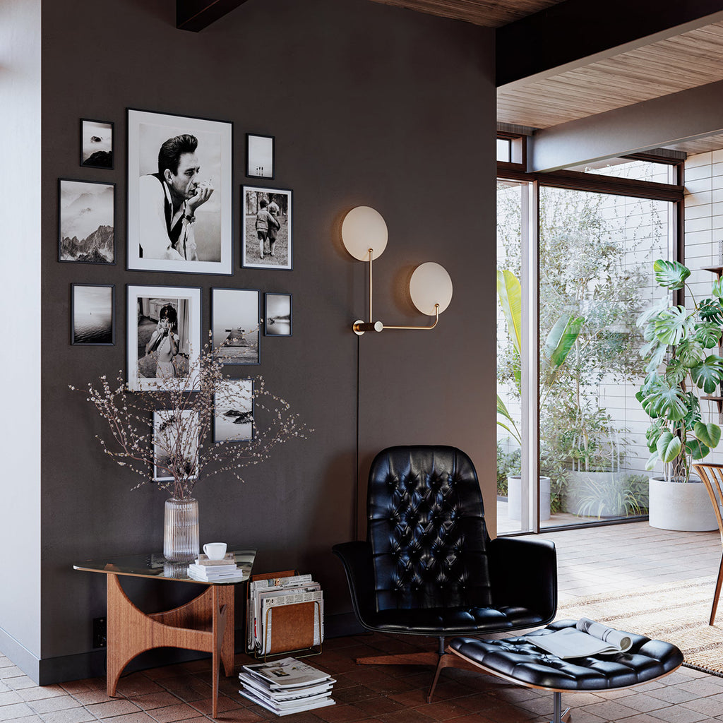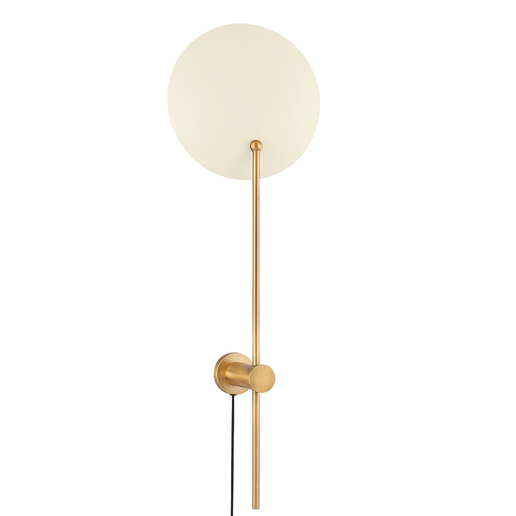Influenced by Bauhaus and later mid-century aesthetics, Troy Leif Plug In Wall Sconce captures both form and function. The circular shade projects ample light on the wall behind it and gives this plug-in wall sconce a graphic element that makes it feel like artwork. The muted tones of the patina brass and soft sand give the piece an earthy vibe. The bottom arm of the two-light sconce rotates for added versatility.