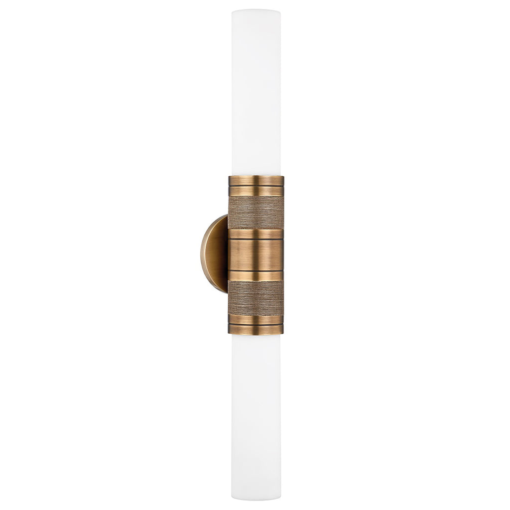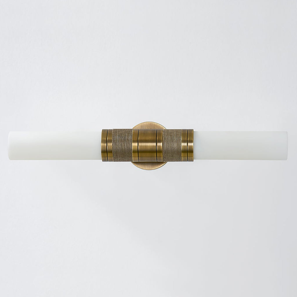 Detailed metalwork and unique natural materials make this familiar sconce silhouette feel fresh. An opal matte glass tube sconce is banded at the middle in layers of machine-detailed Patina Brass and grass cloth, giving it a soft organic look with a clean modern edge. Troy Liam Wall Sconce works well solo or in multiples and can be mounted horizontally or vertically.