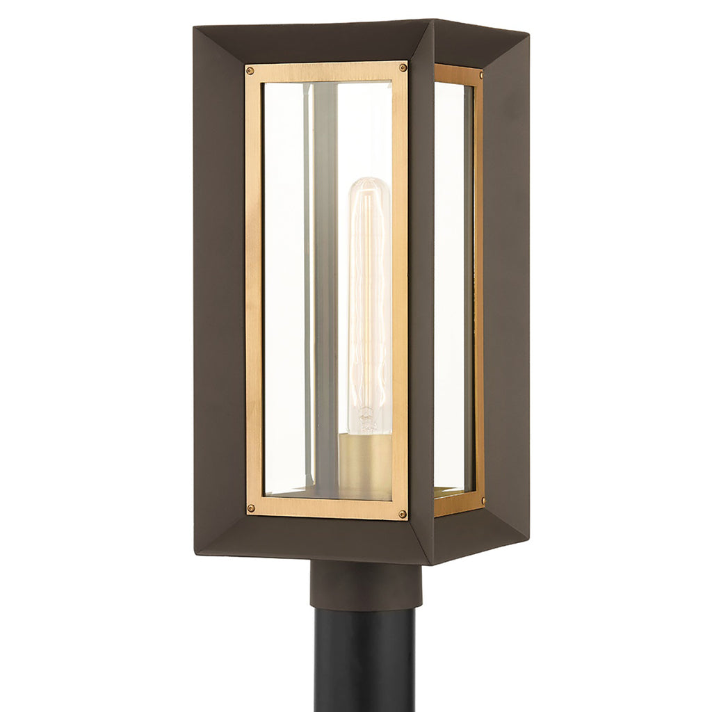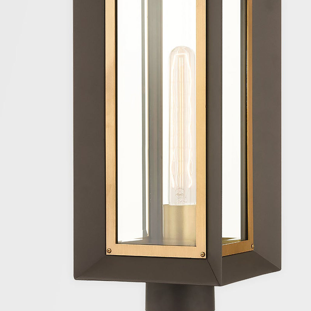A design feat, Troy Lowry combines impeccable metalwork with design-driven style. The inverted cube features a material mix of bronze-finished aluminum and patina brass paired with clear beveled glass for an added layer of finesse. Complex in theory, Lowry is undeniably effortless, adding instant glamour to any exterior. Available as a wall sconce in multiple sizes and post.