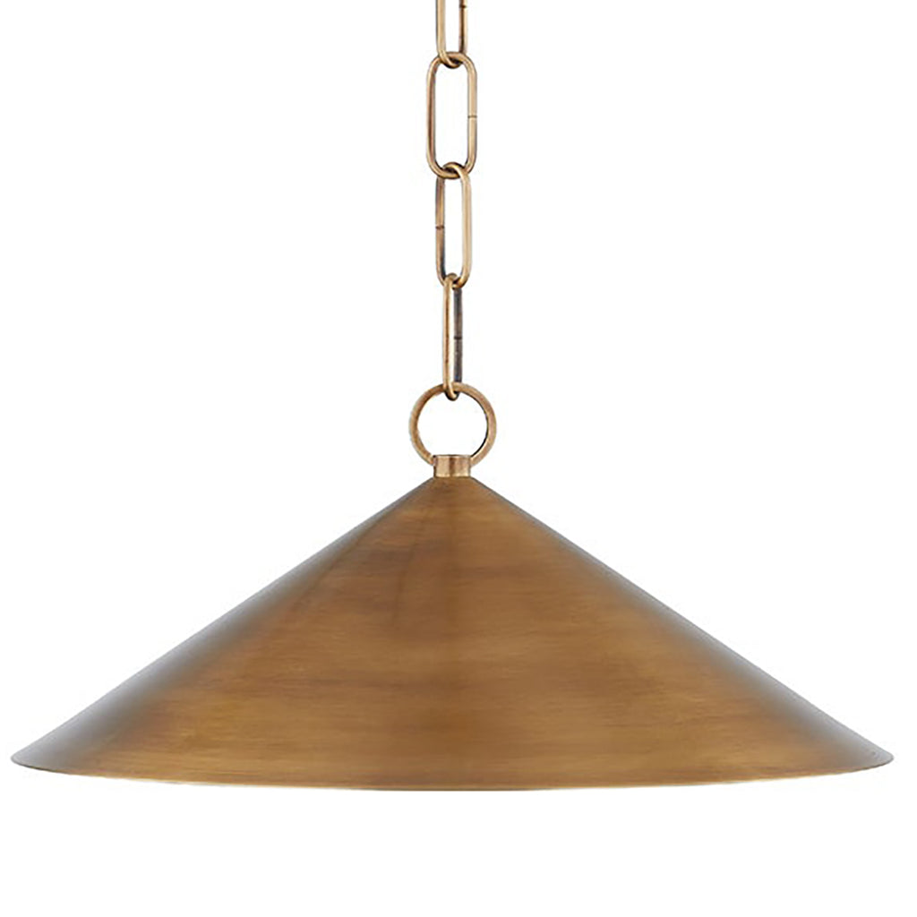 A straightforward conical shade is complemented by a similarly shaped canopy or backplate. The hard lines of the cones are broken up by graceful linked metalwork that draws the eye and makes the fixture feel unique. Both the pendant and wall sconce are lit from within by a single small bulb for a beautiful, soft lighting effect. The familiar silhouette and gorgeous warm tones of the Patina Brass make Troy Midvale feel comfortable in just about any interior.