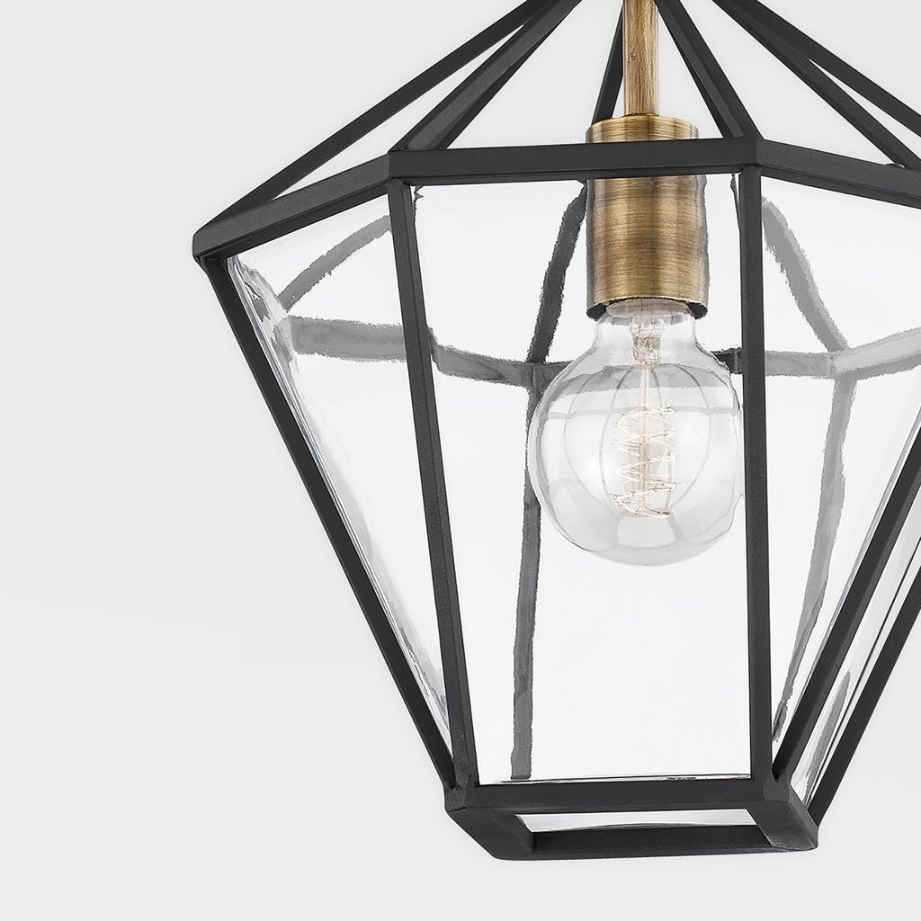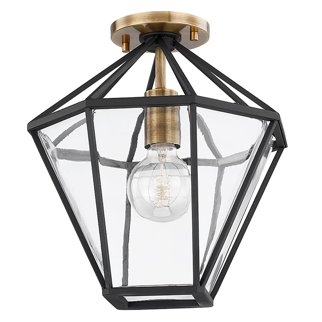 Troy Moss Semi Flush Mount is a fresh take on traditional lanterns. A series of glass panels are held in place by textured black metal to form a unique hex silhouette. Wavy clear glass breaks apart and refracts the light beautifully. A clear bulb in a patina brass socket floats within the frame and fills it with a stunning glow. Whether kept close to the ceiling as a flush mount or hanging lower as a pendant, Moss will add a graceful elegance to any space.