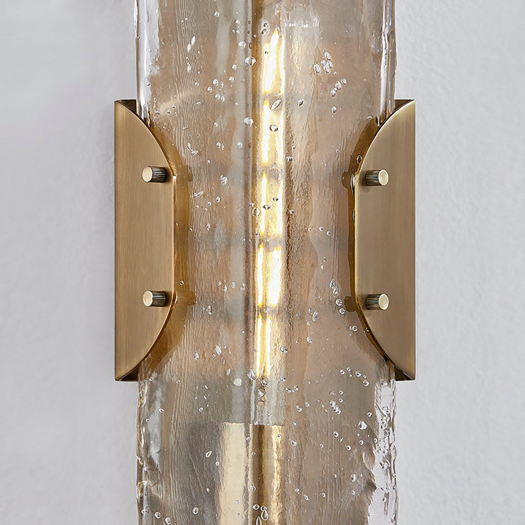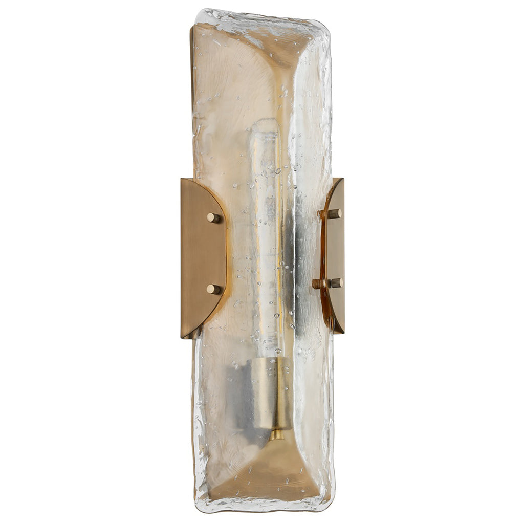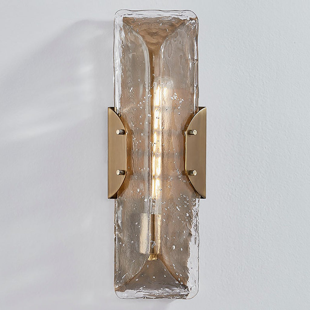 An architectural design with an ice-like sheet of glass, Troy Nordic Wall Sconce creates an immediate pop of interest in a space. When illuminated the delicate bubbles in the thick, cast glass sparkle. Supported by a Patina Brass framework, the minimal silhouette emits a luminous glow.