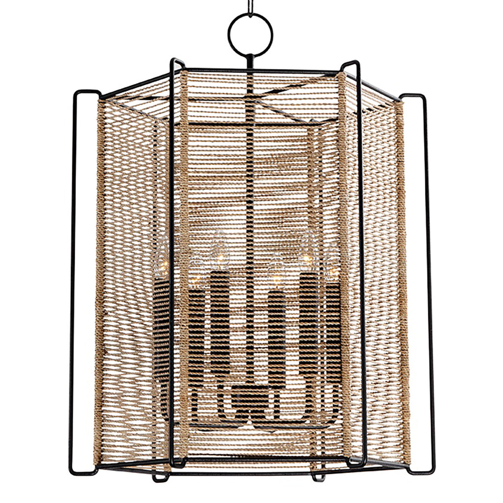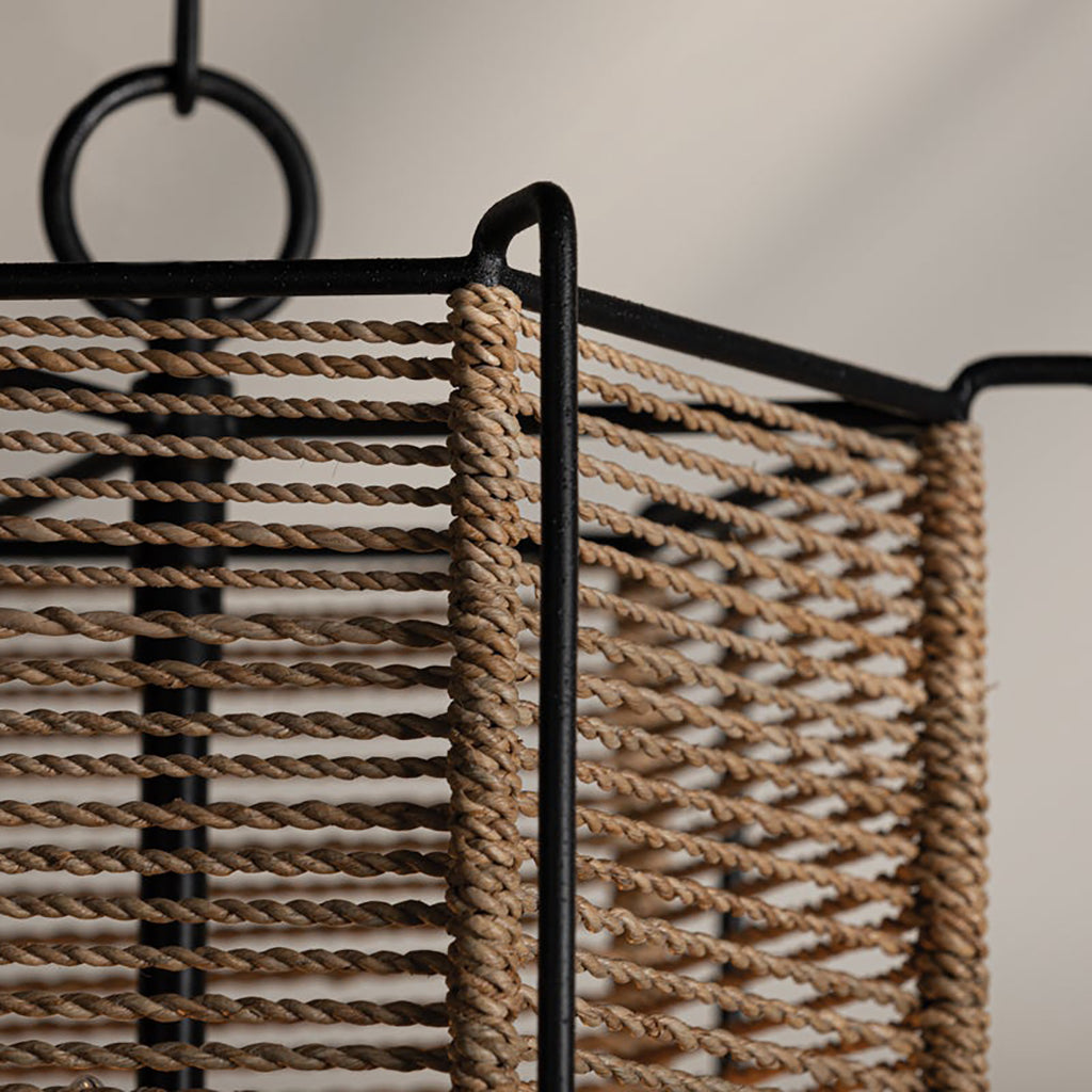 A textured black framework is wrapped in natural jute on the interior to create a modern industrial style that looks rustic yet elevated. The metal frame is vertical and the rope detail runs horizontal forming a dynamic silhouette that feels fresh. The lantern is available in three different sizes to suit any space.