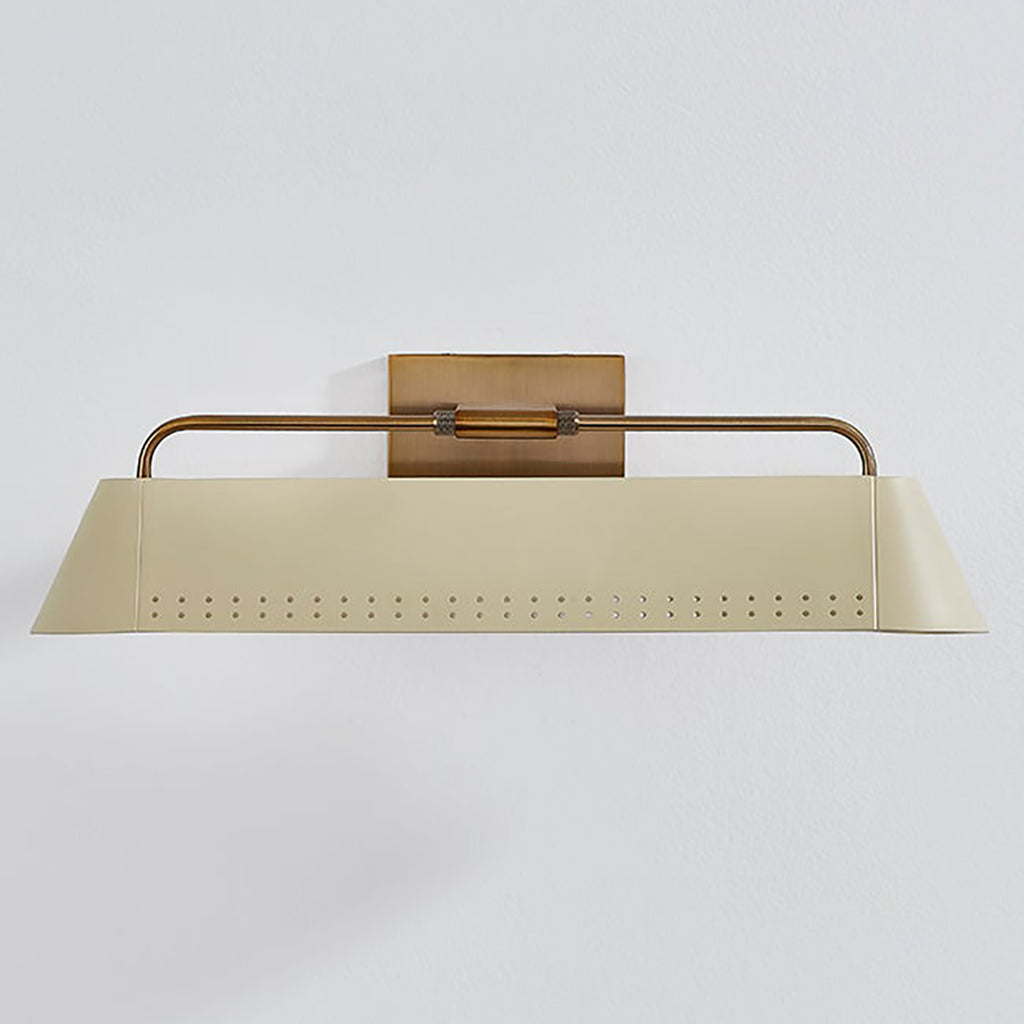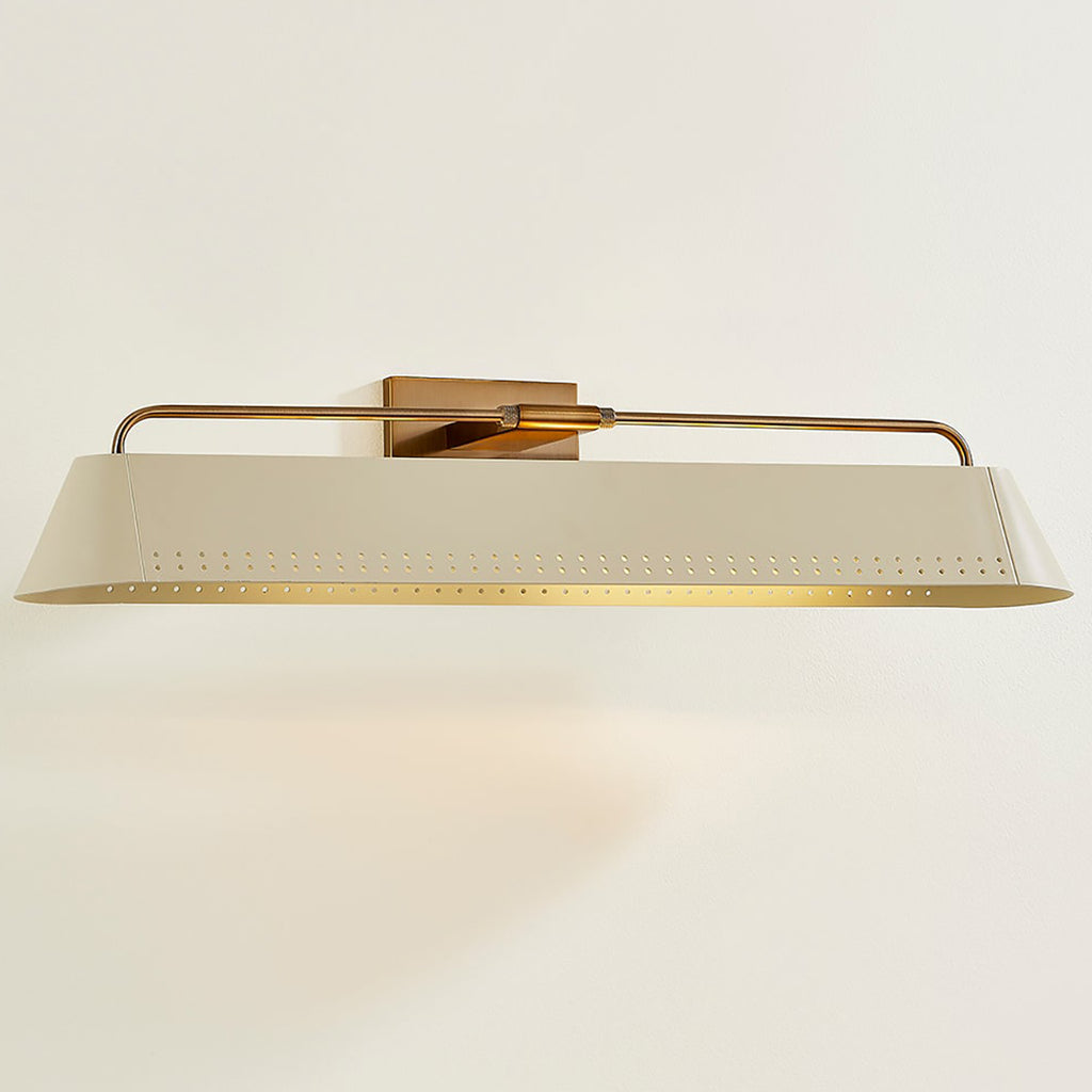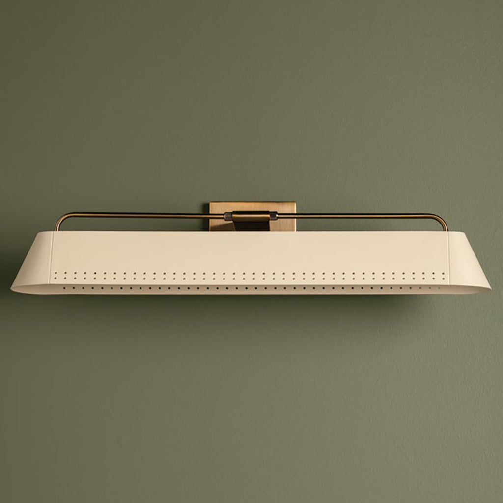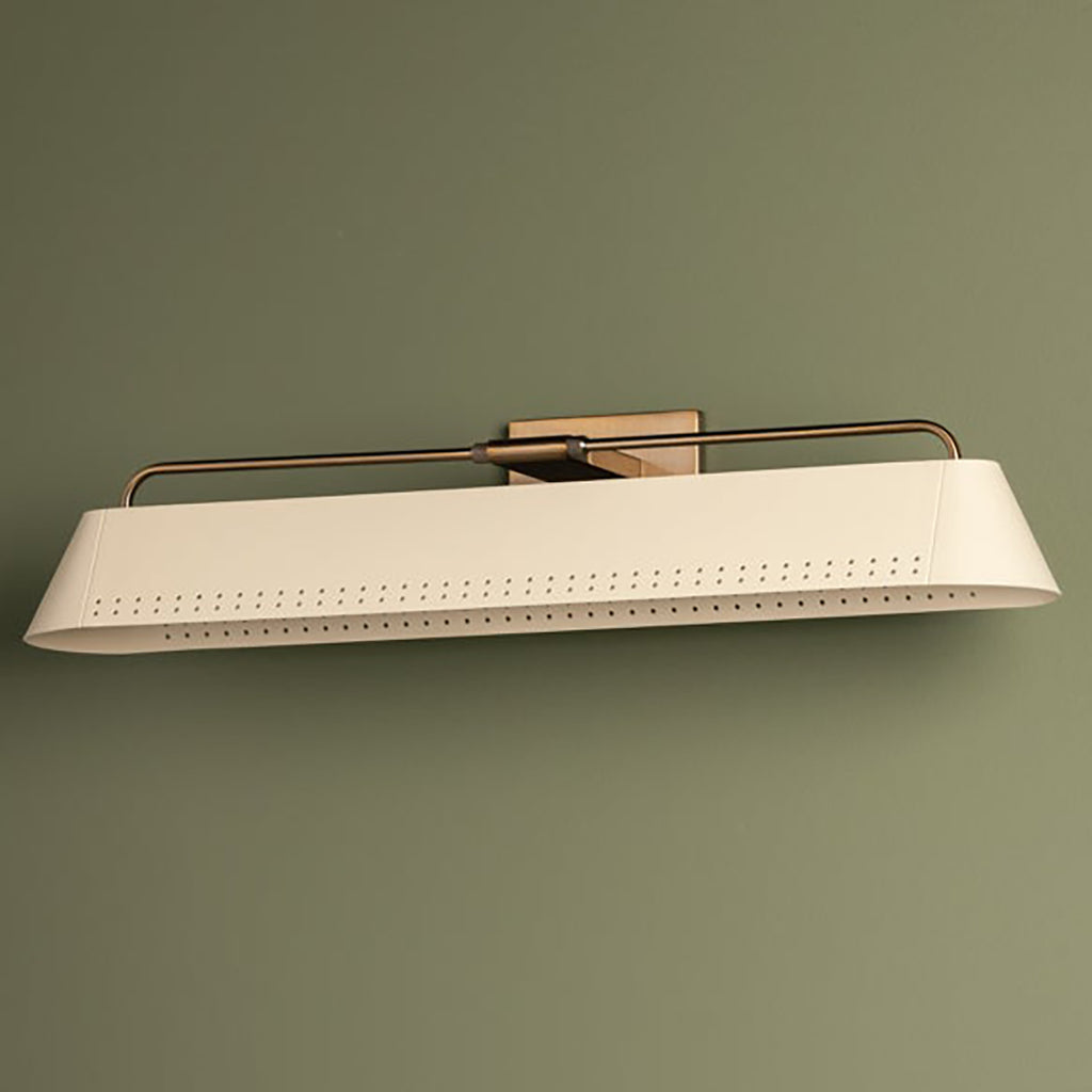 In a tapered racetrack shape, Troy Rowan Picture Light provides a sleek option for lighting a wall or picture. Small perforations along the shade enable an increased wash of light while also adding a decorative accent to the Soft Sand shade. Rowan is available in two sizes with a Patina Brass finish.