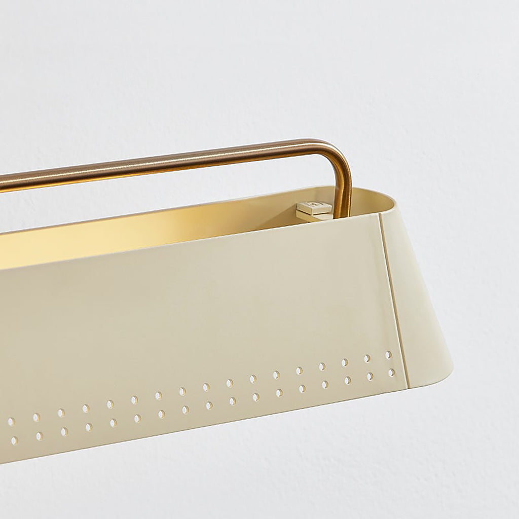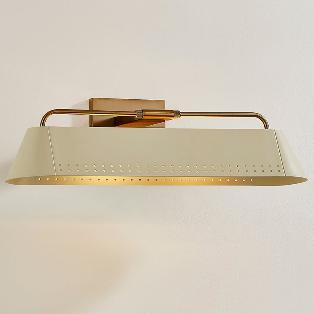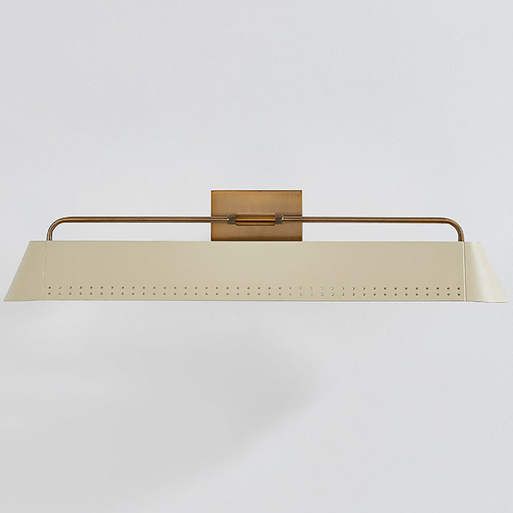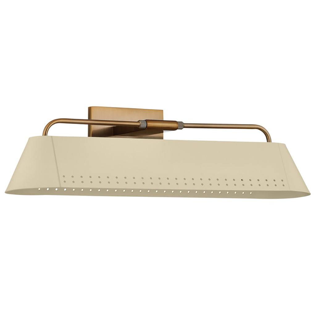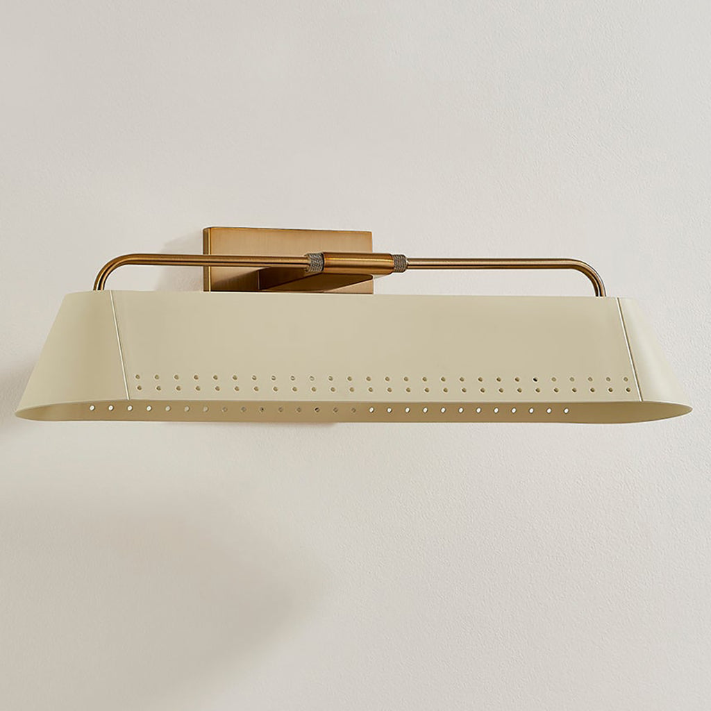 In a tapered racetrack shape, Troy Rowan Picture Light provides a sleek option for lighting a wall or picture. Small perforations along the shade enable an increased wash of light while also adding a decorative accent to the Soft Sand shade. Rowan is available in two sizes with a Patina Brass finish.