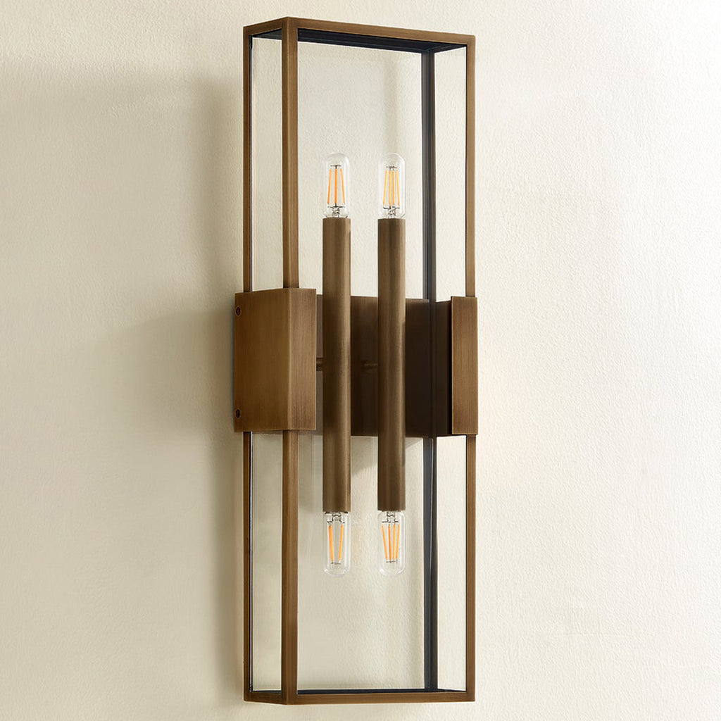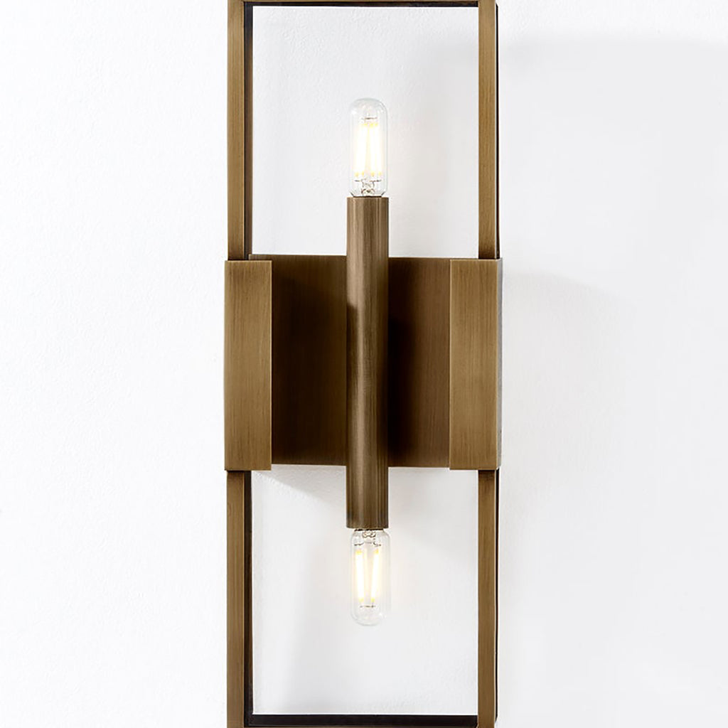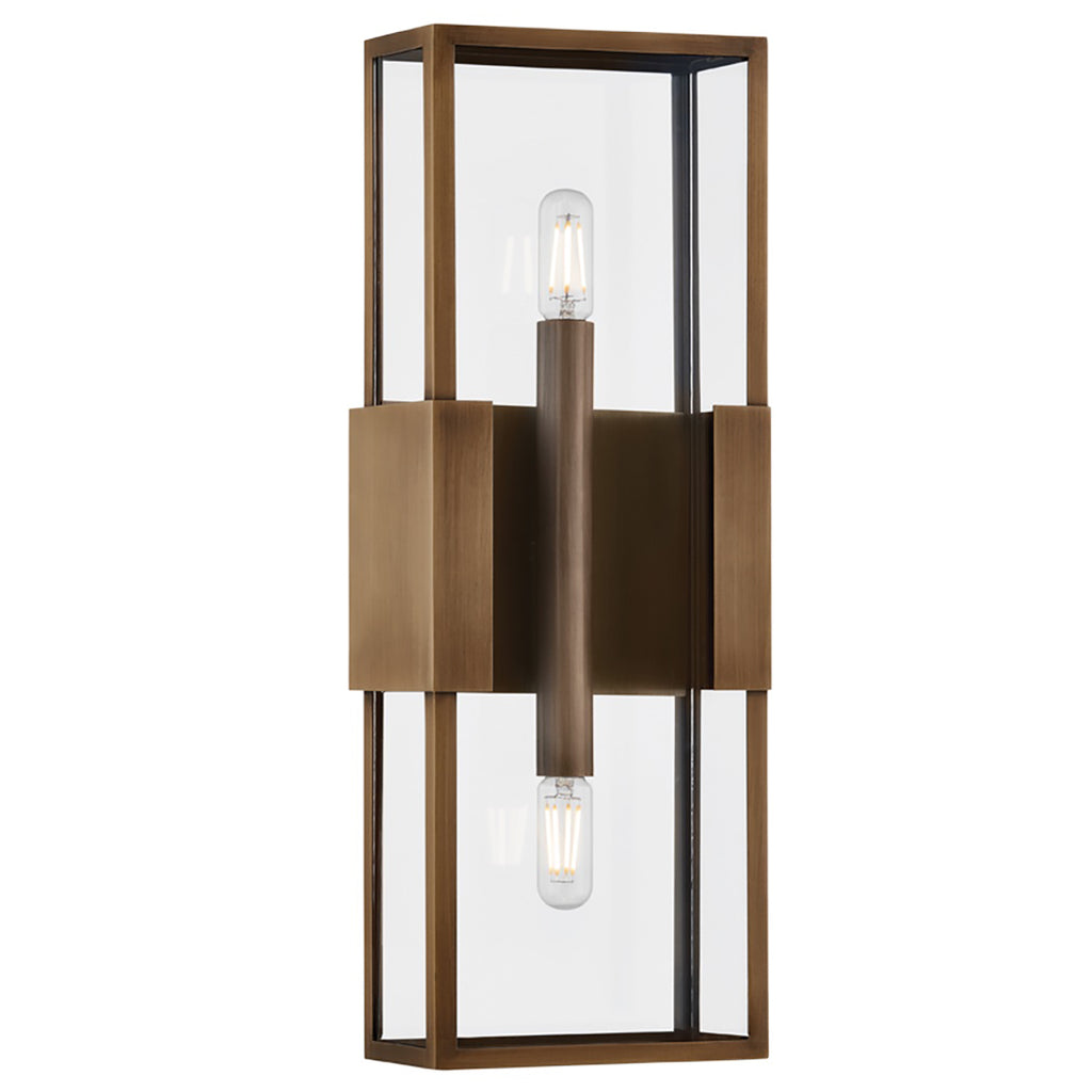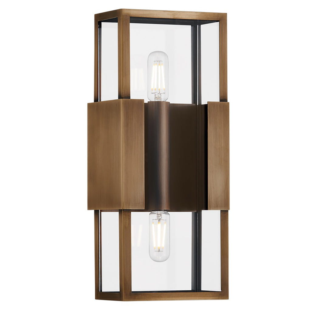 A refined interpretation of a vintage box lantern, Troy Santa Clara Outdoor Wall Sconce focuses on maximizing the light and transparent feel of this piece while also celebrating the minimal Patina Brass metalwork. The flanges that extend from the backplate support the minimal glass box-like jewelry clasps. Available in two sizes featuring 2 lights each, as well as a 4-light version, this exterior wall light provides a warm welcome home.