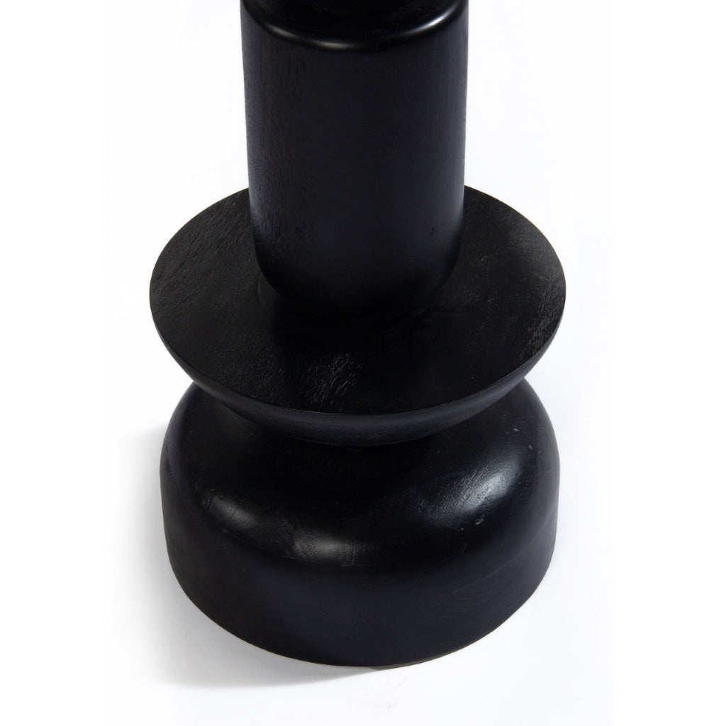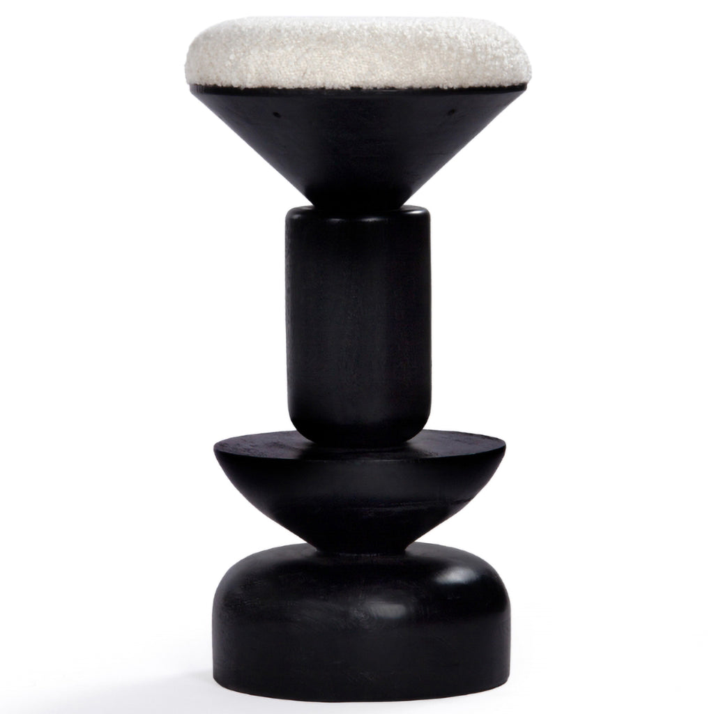 Playful in form, the Kebab bar stool makes a bold, geometric statement. A turned, solid wood upright with an integrated footrest, is topped by a plush, boucle upholstered seat cushion.
