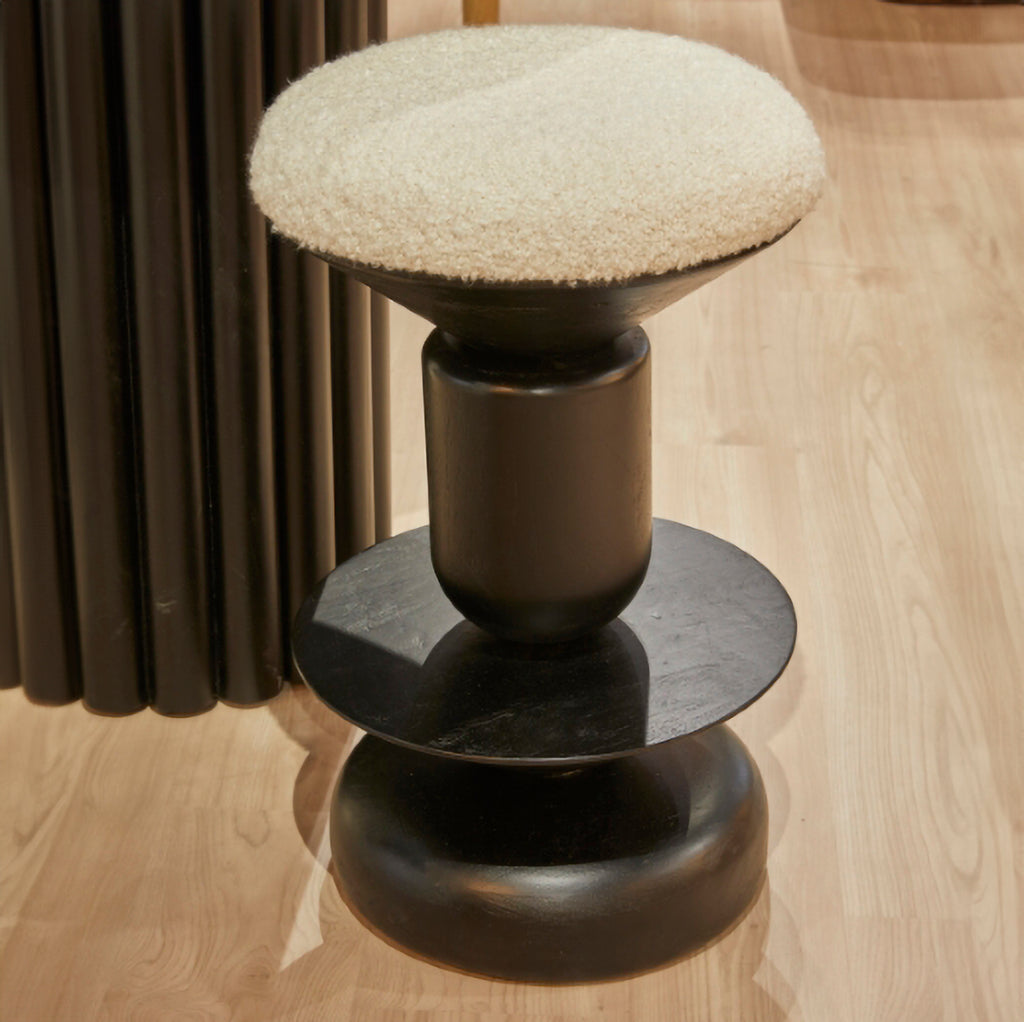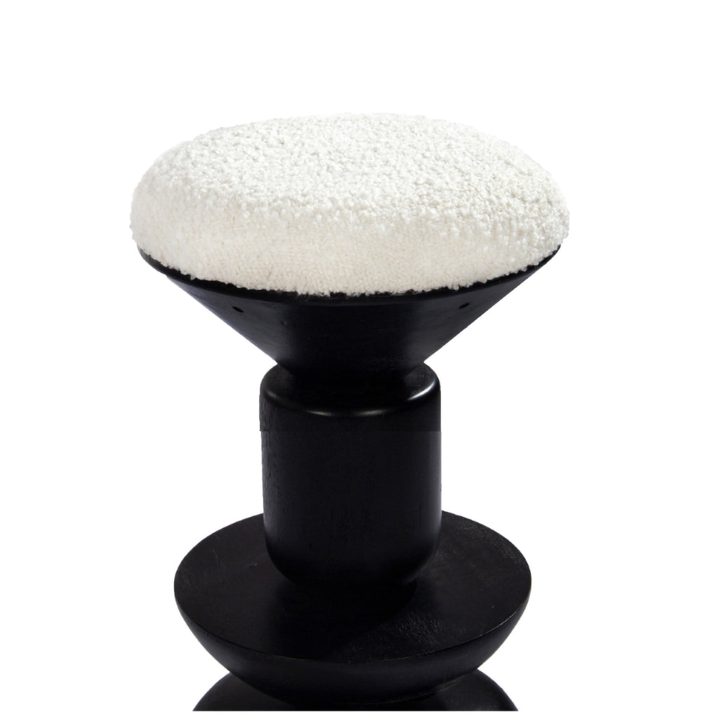 Playful in form, the Kebab Counter Stool makes a bold, geometric statement. A turned, solid wood pedestal with a subtle wire brushed finish supports a plush, boucle upholstered seat.