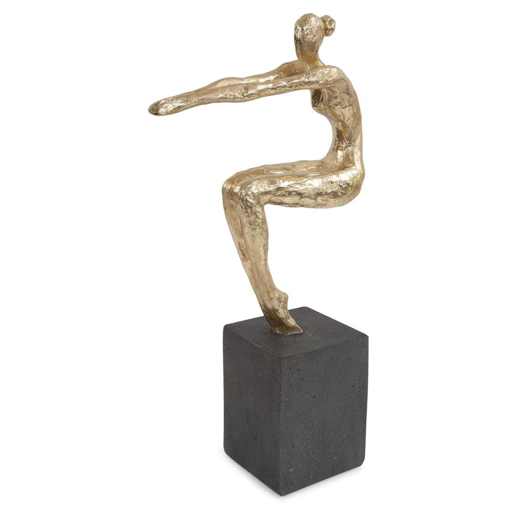 For centuries yoga has been an instrumental part of peoples health regimes. One such pose is the Utkatasana with its graceful lines from outstretched arms to slightly angled knees. Cast in resin this beautiful and graceful sculpture is captured in brilliant gold with a graphite finished base.