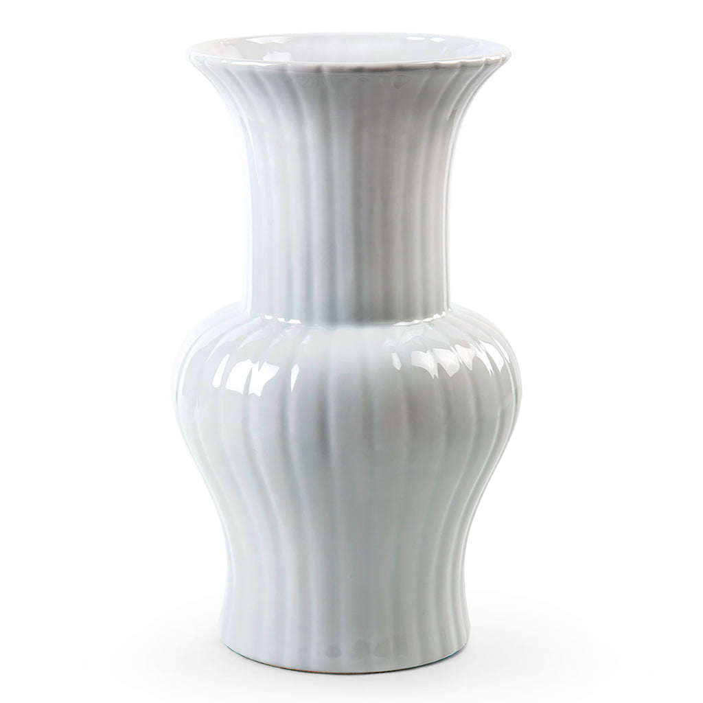 The Villa and House Amoy Vase, crafted from glazed porcelain, showcases a classic fluted design with vertical ribbing, a bulbous body, and a flared neck. Its flowing, organic contours evoke a sense of elegance and timelessness, making it a sophisticated addition to any decor.