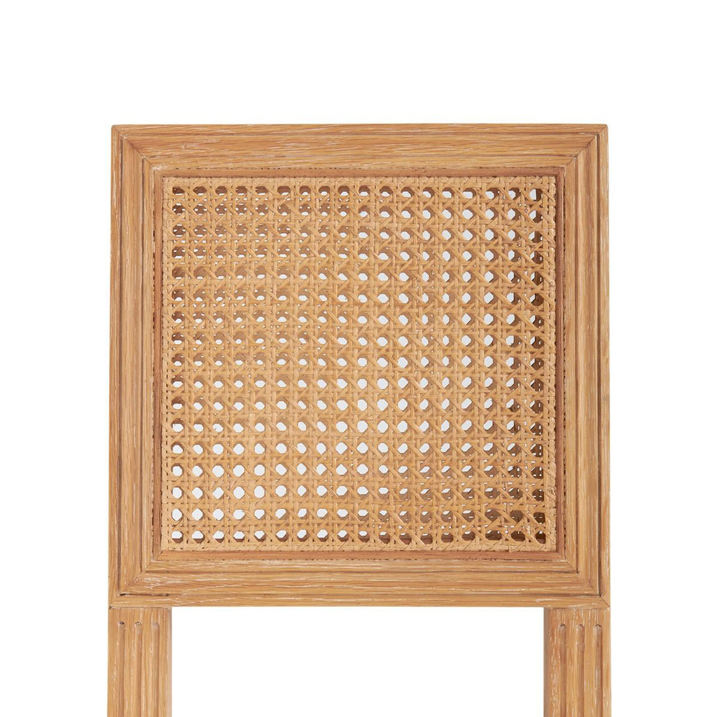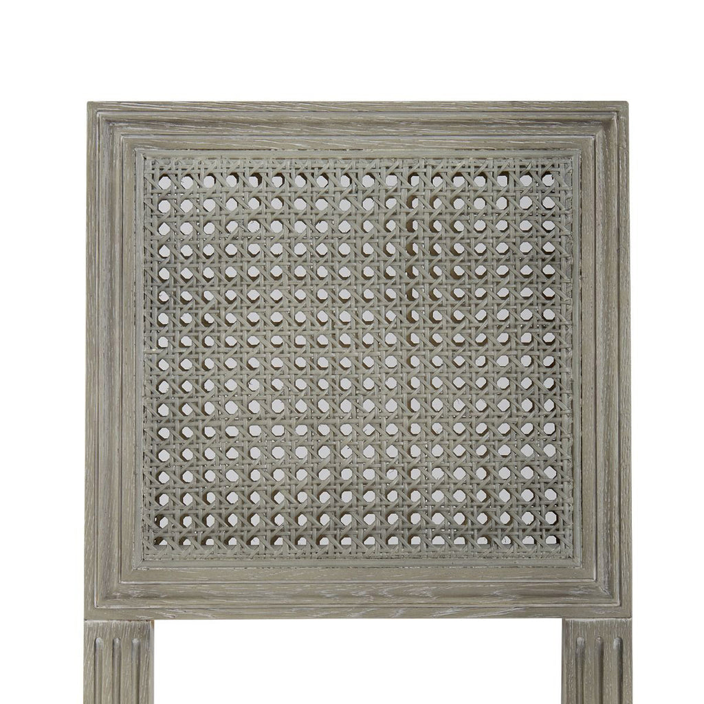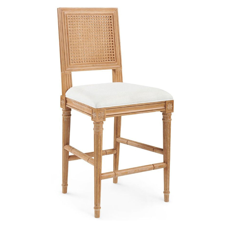 The cerused oak and cane V&H Annette Counter Stool from is inspired by traditional French neoclassical design elements of Louis XVI, with hand-carved paterae rosettes and many grooves. Though emulating details of that time, the Annette transcends styles and is an incredibly versatile design. V&H's signature cerused oak process adds a white contrast to the fine details of a wood's grain, enhancing the beauty and delicate natural patterns of lumber. The cane—after being handwoven by skilled artisans—is finished to exactly match the cerused oak color, be it natural or gray. The natural linen seat can be professionally reupholstered. Drawing from romantic, old-world design, the Annette Counter Stool is equally appropriate in a coastal pied-à-terre, southern home, or a New York City loft.