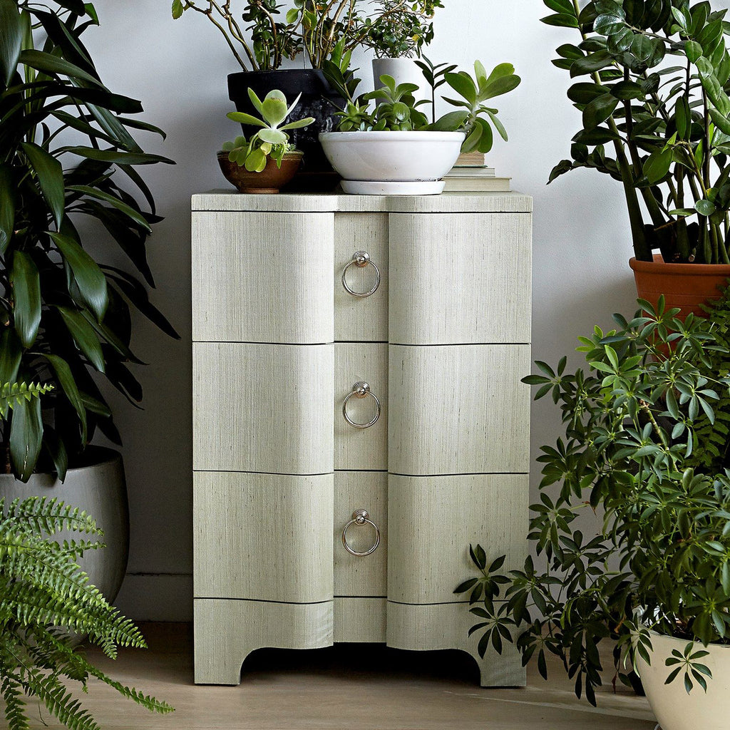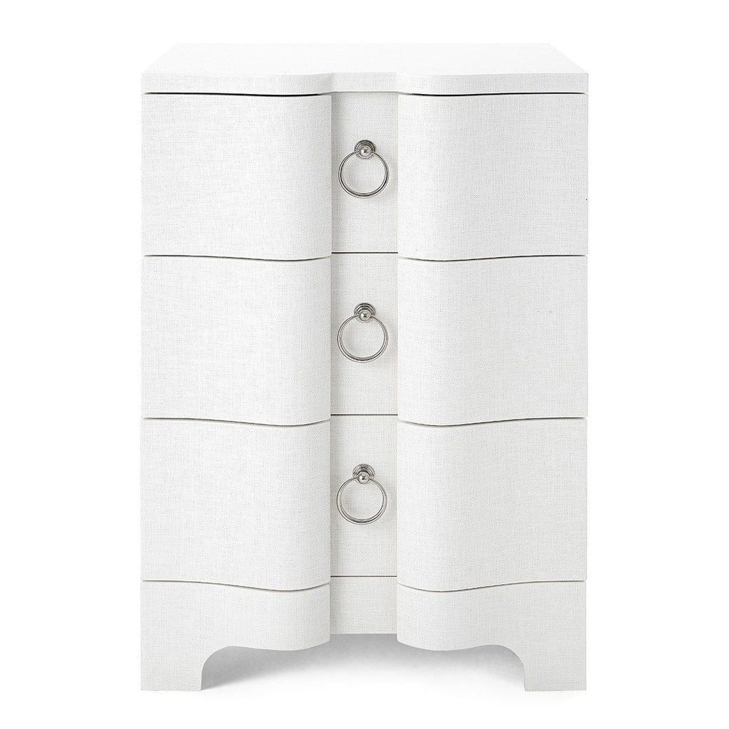 The V&H Bardot Collection is a curvy, Art Deco-inspired design with a serpentine-front profile that imparts a sense of movement and fluidity. The lacquered grasscloth has been expertly applied by our skilled artisans so that it flows seamlessly over each cresting drawer front and around each corner. This piece appeals to those who want polished, decorated rooms.
