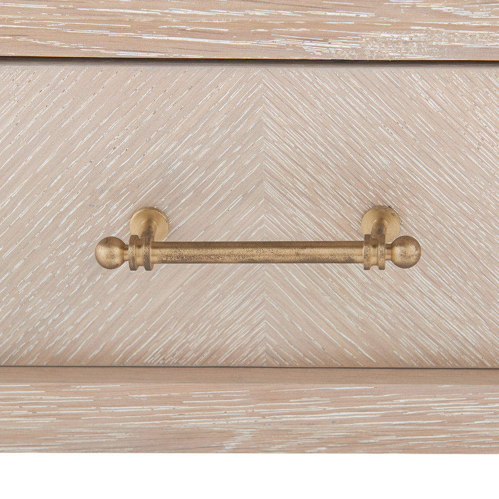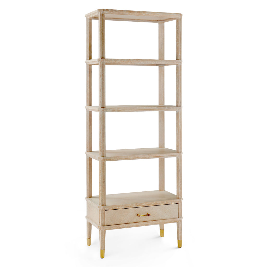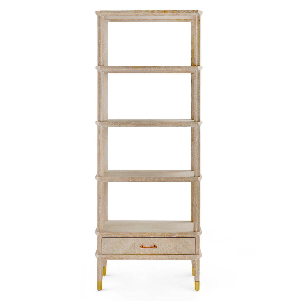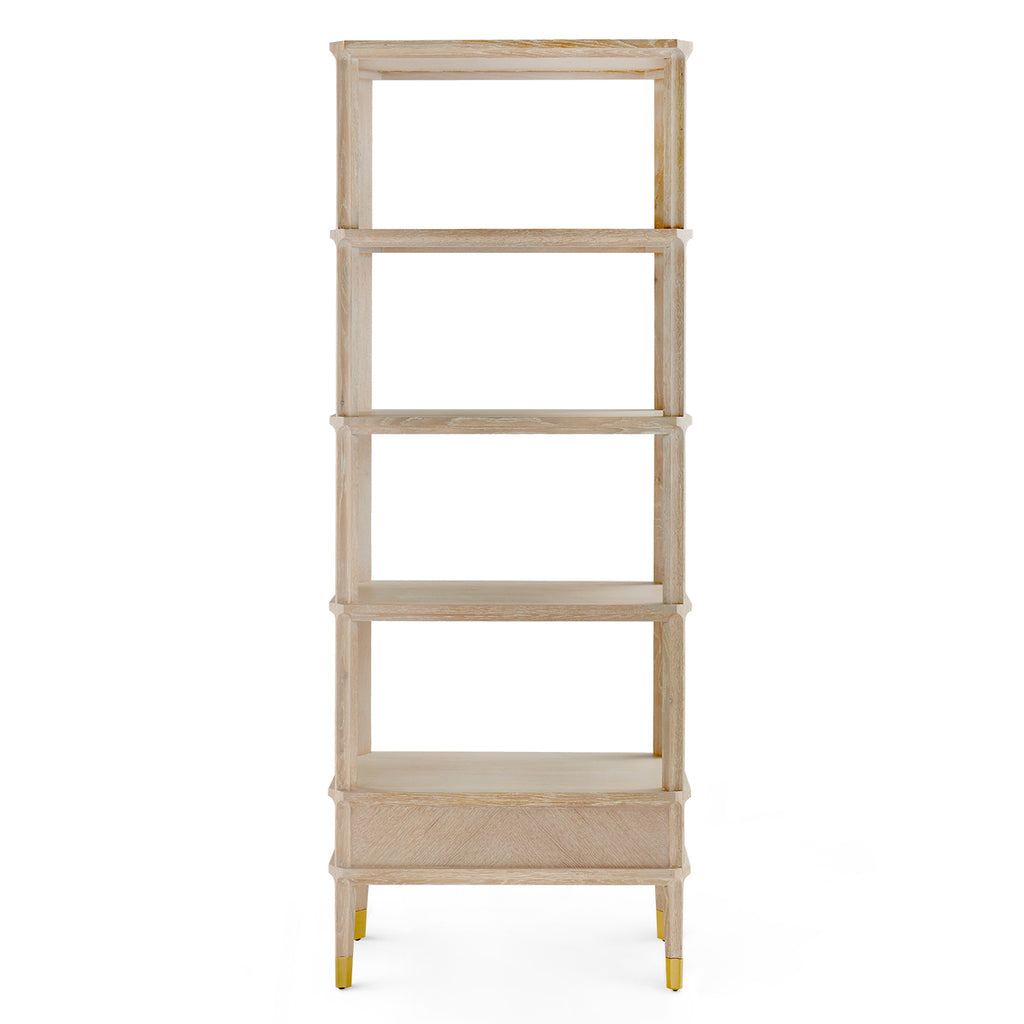 An ultimately elegant piece, the V&H Bertram Etagere, comes in a light gray straight grain cerused oak or a natural bleached cerused oak with one hand-cast brushed brass drawer pull and sabot details. The shelving unit has one drawer for hidden storage and four open shelves for displaying decorative objects or books. Each shelf’s veneer top is chevron-patterned: carefully selected and laid by hand to highlight the oak grain’s intricate markings. The posts are hand-carved, made of quarter-sawn solid oak, and expertly sanded to taper with double-sided coving. Notice the coving detail carried to the bottom of each shelf. Float it in a room—as all sides of V&H furniture are finished—or nestle it up against a wall with decorative bookends to act as a library. The delicate craftsmanship in the Bertram Collection—like the chevron-pattern oak grain or the coved details—give each piece a light, elegant presence.