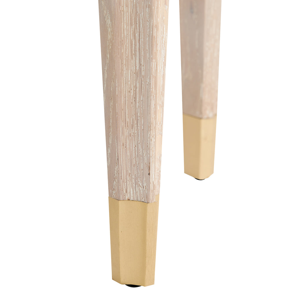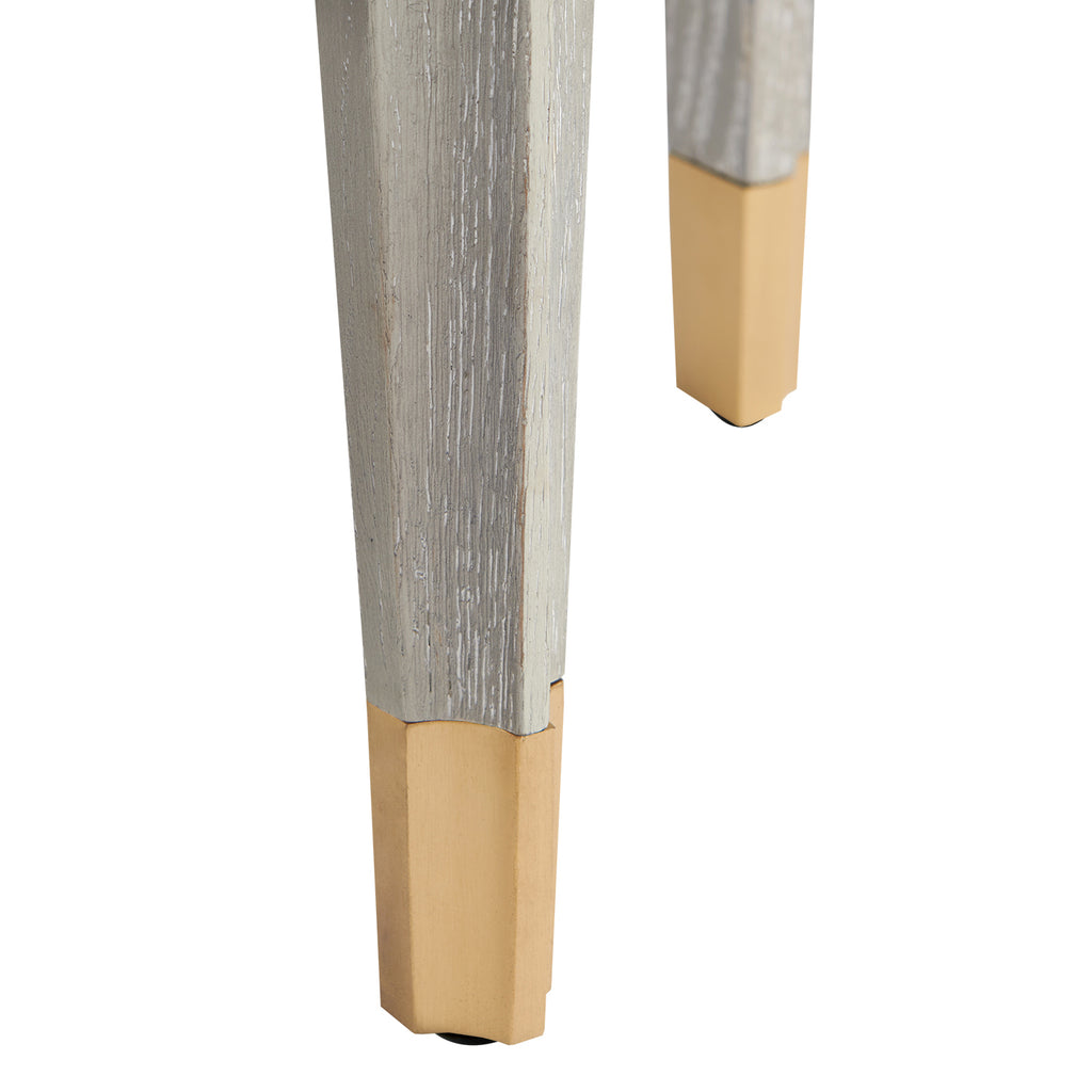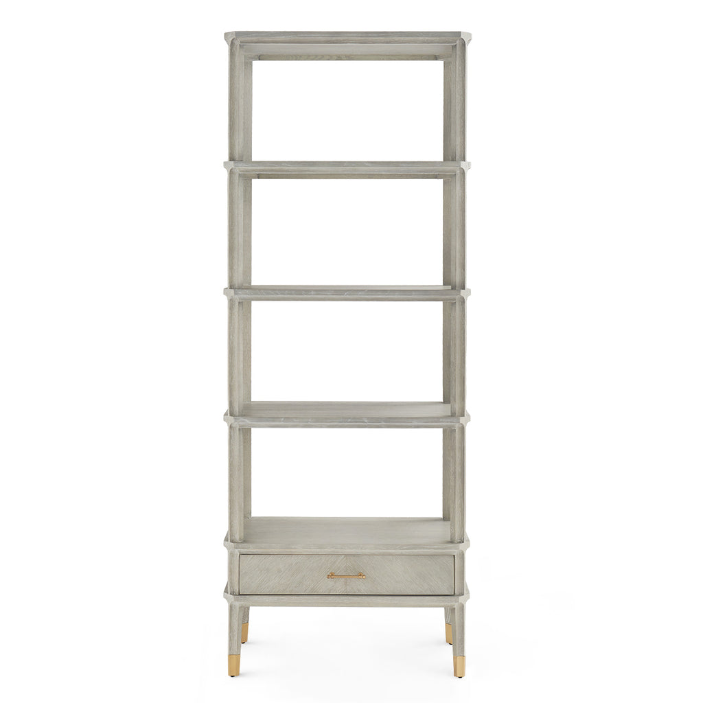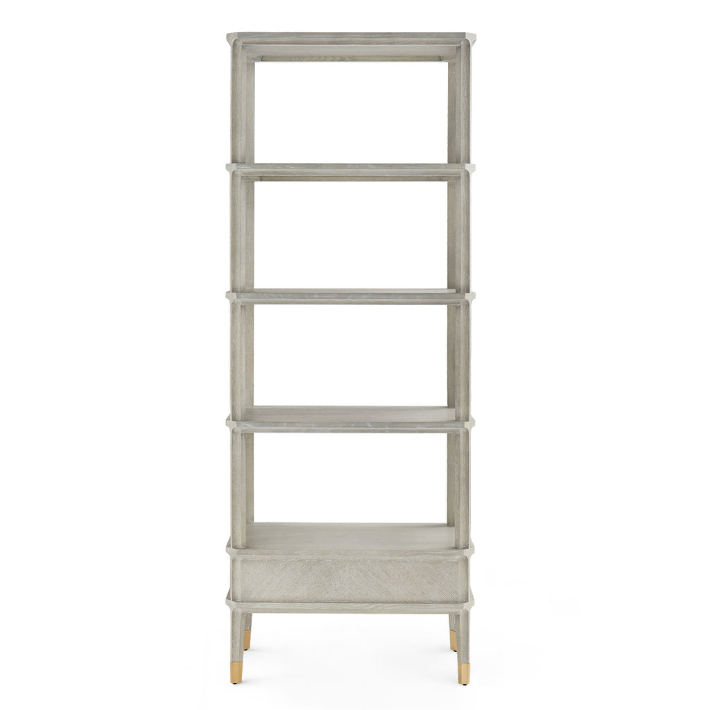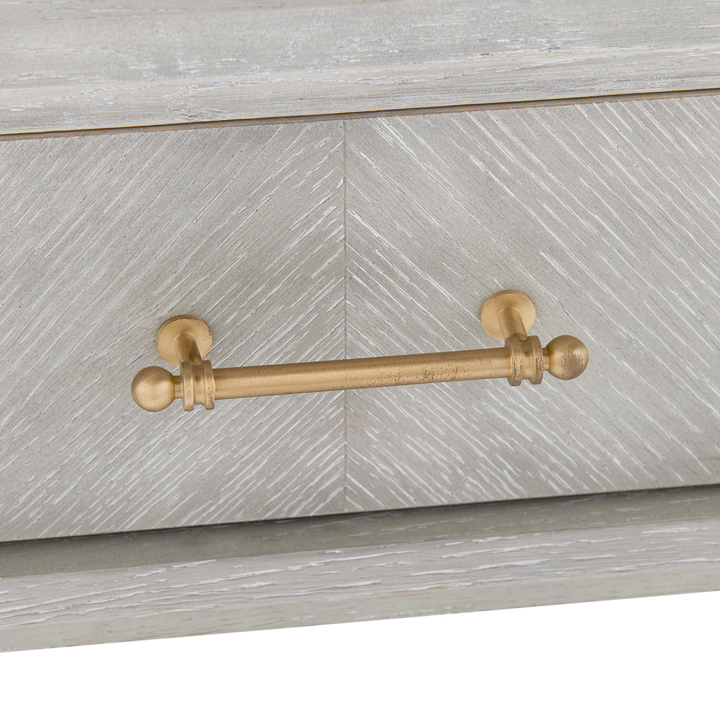 An ultimately elegant piece, the V&H Bertram Etagere, comes in a light gray straight grain cerused oak or a natural bleached cerused oak with one hand-cast brushed brass drawer pull and sabot details. The shelving unit has one drawer for hidden storage and four open shelves for displaying decorative objects or books. Each shelf’s veneer top is chevron-patterned: carefully selected and laid by hand to highlight the oak grain’s intricate markings. The posts are hand-carved, made of quarter-sawn solid oak, and expertly sanded to taper with double-sided coving. Notice the coving detail carried to the bottom of each shelf. Float it in a room—as all sides of V&H furniture are finished—or nestle it up against a wall with decorative bookends to act as a library. The delicate craftsmanship in the Bertram Collection—like the chevron-pattern oak grain or the coved details—give each piece a light, elegant presence.
