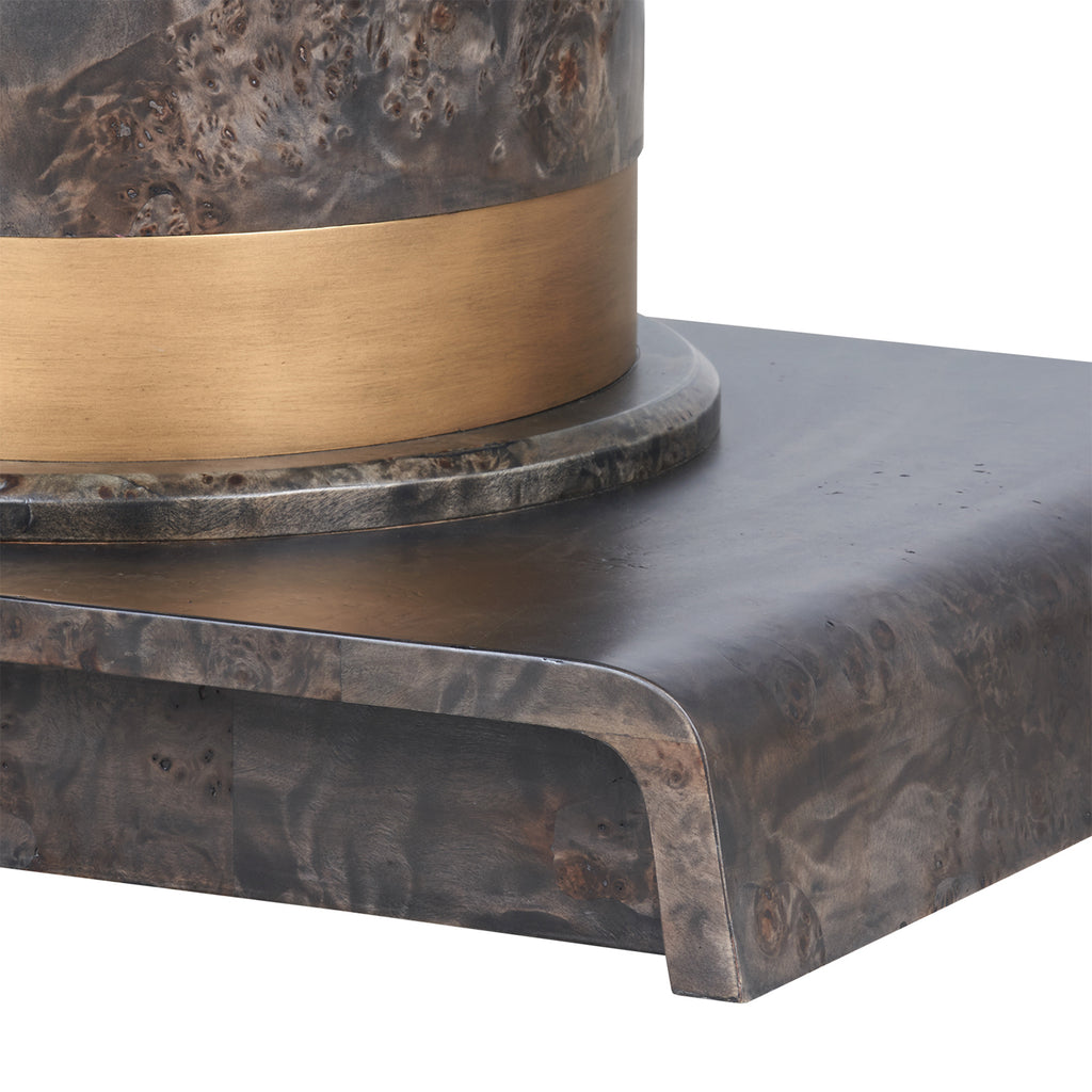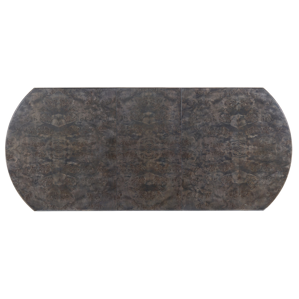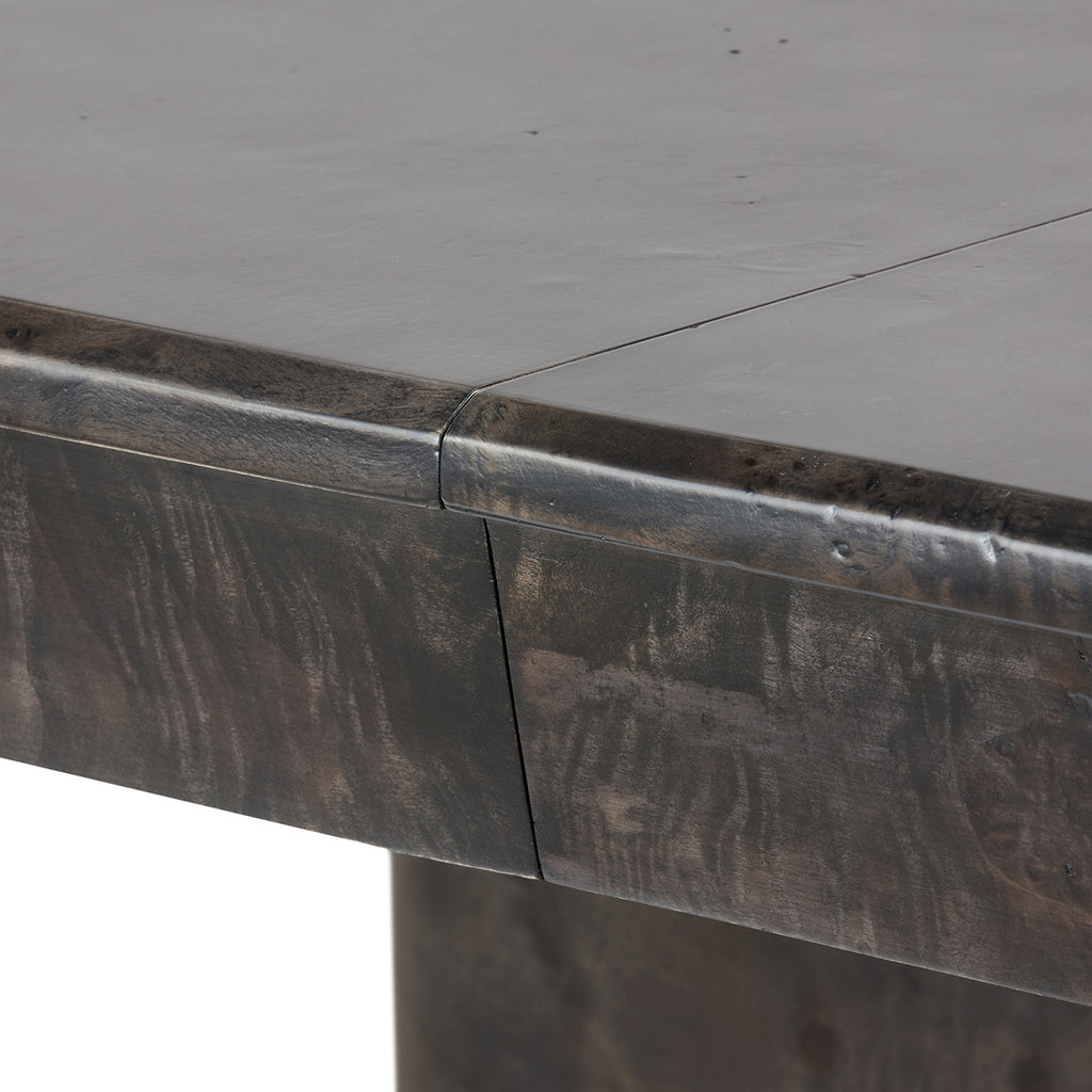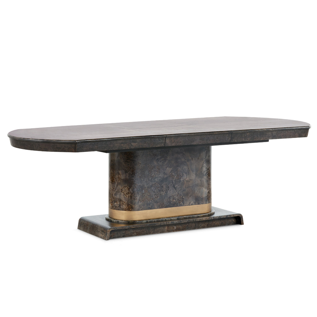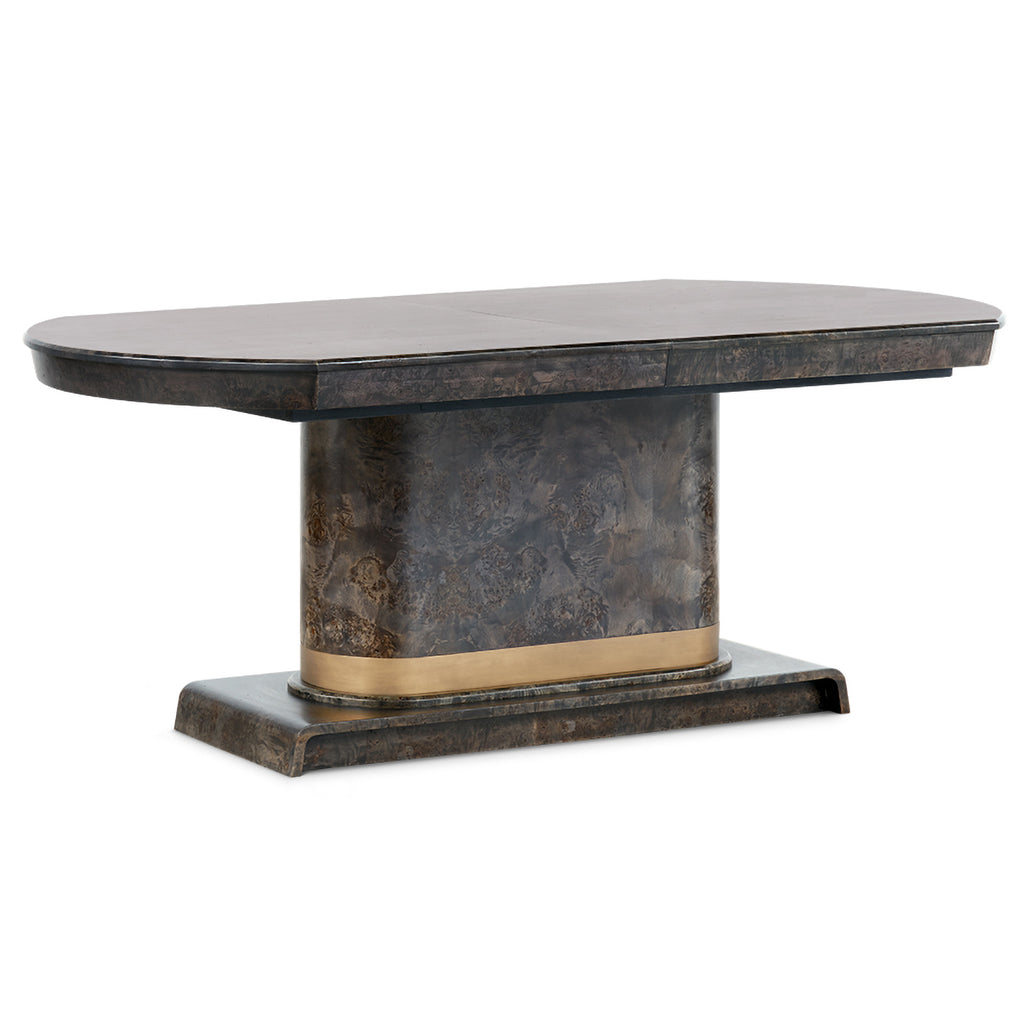 With its strong presence, the Harriet Dining Table commands attention in any space. Featuring moody arabica finish and accented with a glimmering brass sash at the base of its center column, the piece exudes sophistication. It comes with an extension leaf, which stores in the base, to effortlessly accommodates more guests. Chic, simple, and undeniably swoon worthy, The Harriet Dining Table is the epitome of modern elegance.