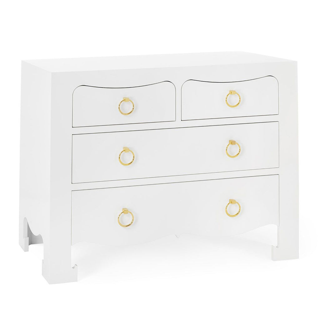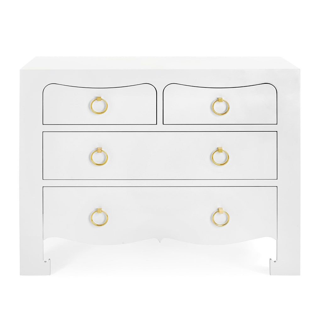 The Jacqui Collection is a V&H classic that we update from time to time. We add reflectivity, color and unexpected details to traditional Georgian and Regency furniture for a young, fresh, glamorous take on Hollywood Regency design. The Jacqui 4-Drawer Dresser is made of shaped wood and manufactured wood cutouts with great details like graduated drawers, Chow-style feet, simple round pulls, and softly burnished lacquer finish. The piece looks deceptively simple. In reality the seamless joinery is extremely difficult to achieve. And is a technique which virtually no other lacquer manufacturer attempts.