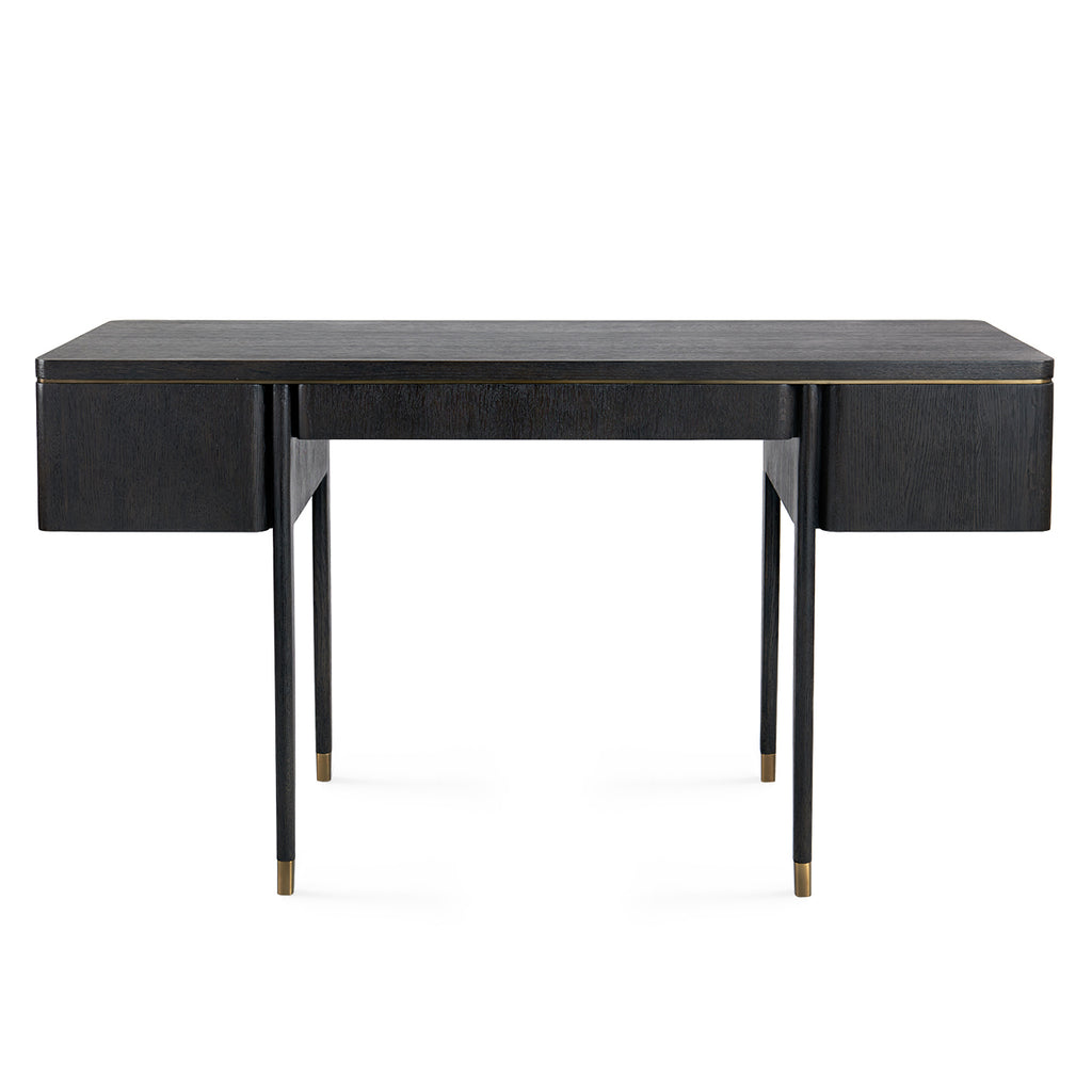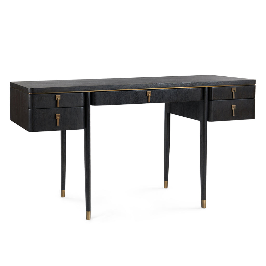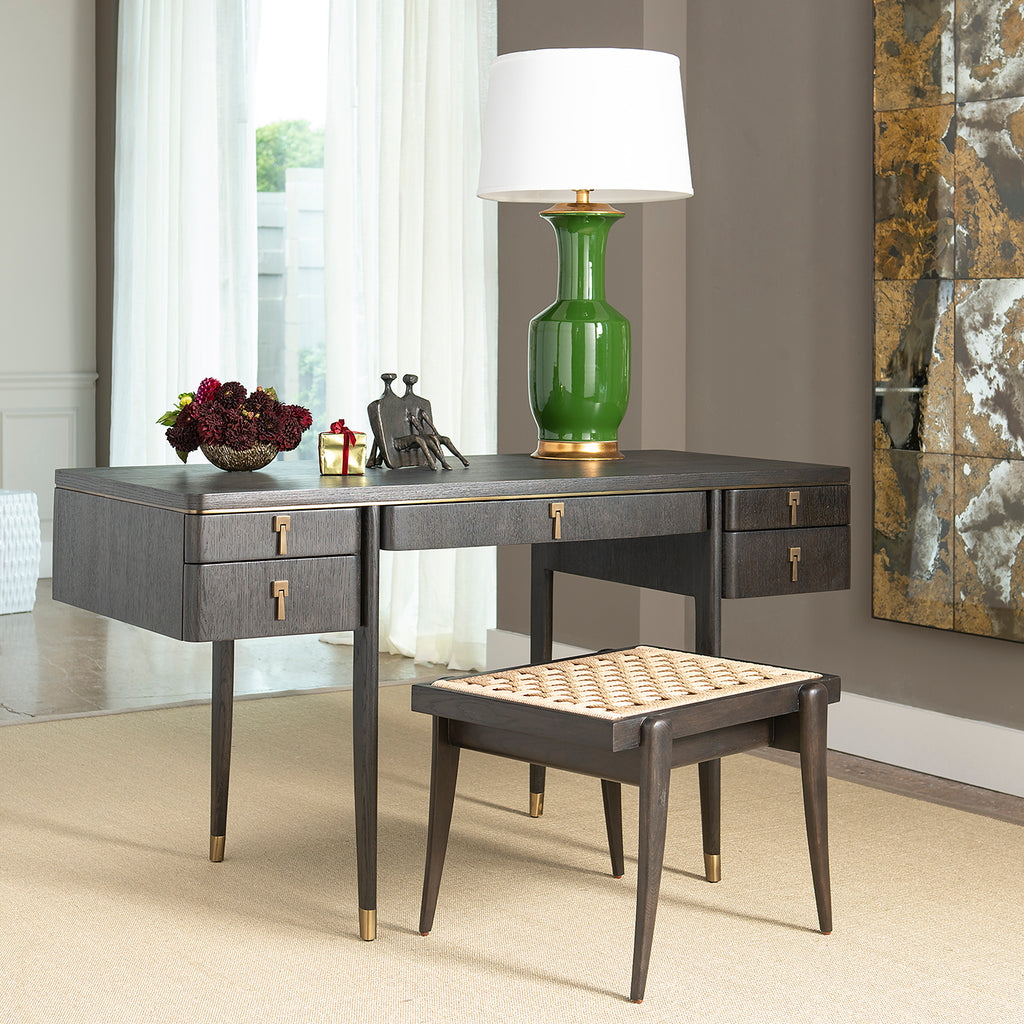The V&H Lanna Collection, offered in a deep espresso or sand, is a very modern desk. The rich straight-grain oak —rather than cathedral grain— lends a more modern and refined aesthetic. The white variant is a bleached, cerused oak, and the espresso finish is a very dark, almost black color that really highlights the bronze accents. The custom bronze elements, like the tassel pulls that are reminiscent of medieval bronze combined with antique French tassels known as Passementerie, make the desk more subtle and masculine. Our hardware is custom-cast and exclusive to V&H. Notice the inset metal reveal, a V&H signature design element, set into the groove of the desk’s top, skimming the perimeter of your writing surface. The overall shape of the Lanna is architectural, light, sculptural and modern. The workspace is quite large—like an augmented writing desk, providing a significant surface with ample space for a monitor, laptop, or many documents. The result is subtle glamour, putting high-end materials on display, but not in a flashy way. Reminiscent of a historical, archival piece of furniture, the modern oak Lanna desk will undoubtedly be an heirloom item.