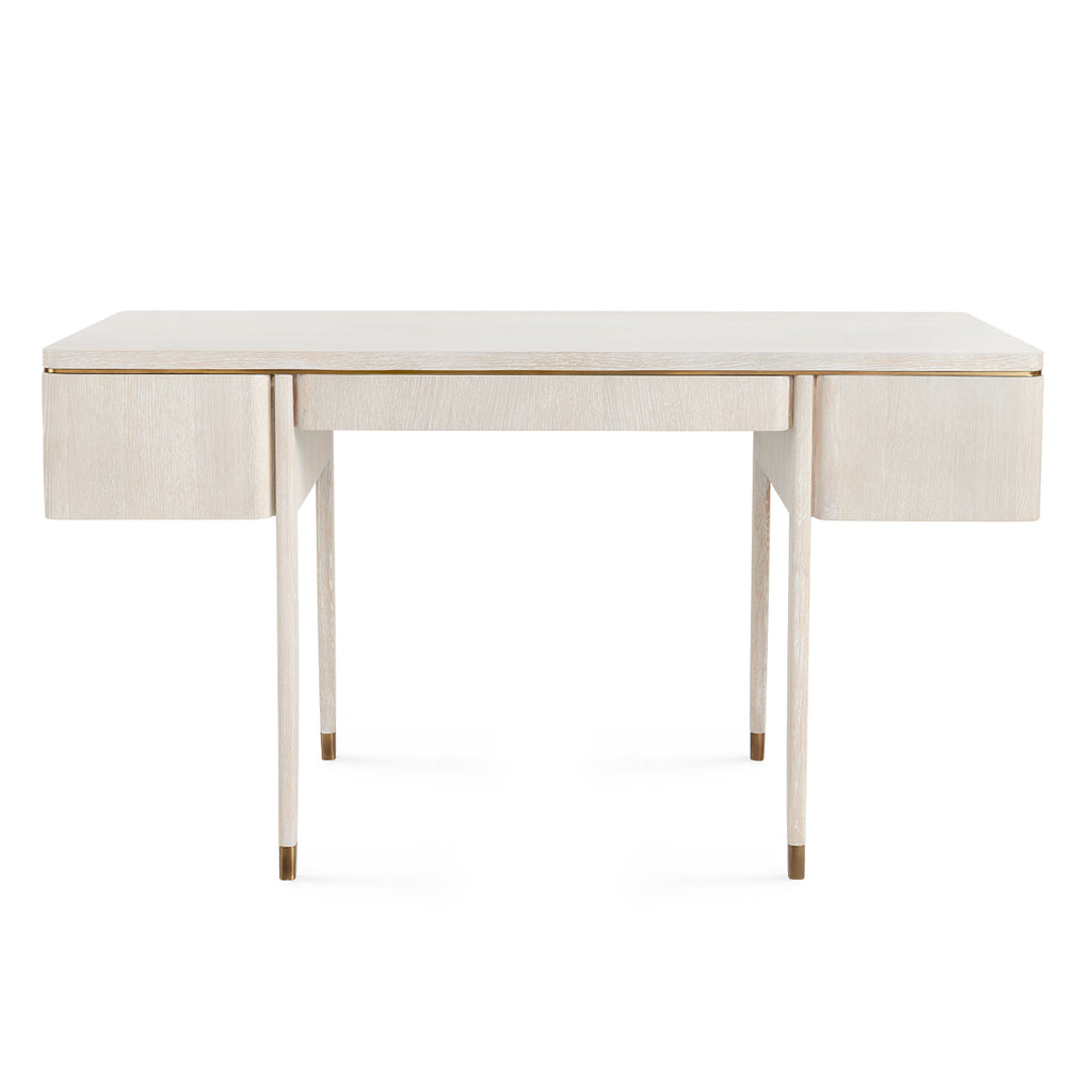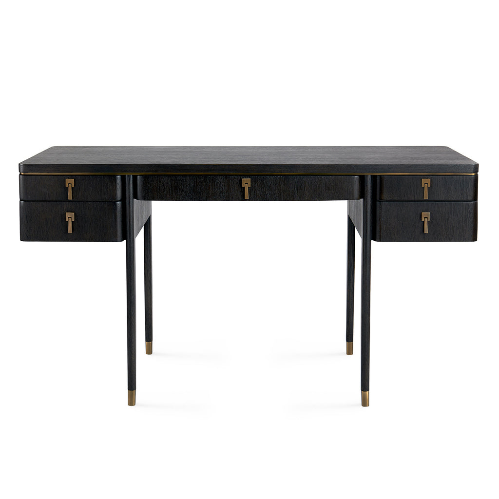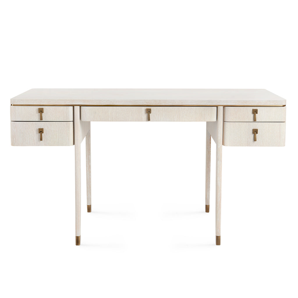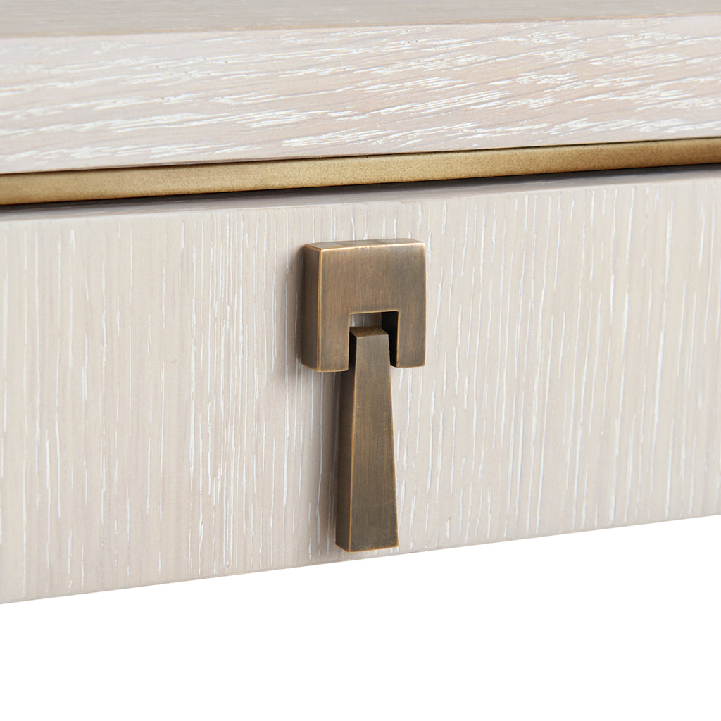 The V&H Lanna Collection, offered in a deep espresso or sand, is a very modern desk. The rich straight-grain oak —rather than cathedral grain— lends a more modern and refined aesthetic. The white variant is a bleached, cerused oak, and the espresso finish is a very dark, almost black color that really highlights the bronze accents. The custom bronze elements, like the tassel pulls that are reminiscent of medieval bronze combined with antique French tassels known as Passementerie, make the desk more subtle and masculine. Our hardware is custom-cast and exclusive to V&H. Notice the inset metal reveal, a V&H signature design element, set into the groove of the desk’s top, skimming the perimeter of your writing surface. The overall shape of the Lanna is architectural, light, sculptural and modern. The workspace is quite large—like an augmented writing desk, providing a significant surface with ample space for a monitor, laptop, or many documents. The result is subtle glamour, putting high-end materials on display, but not in a flashy way. Reminiscent of a historical, archival piece of furniture, the modern oak Lanna desk will undoubtedly be an heirloom item.