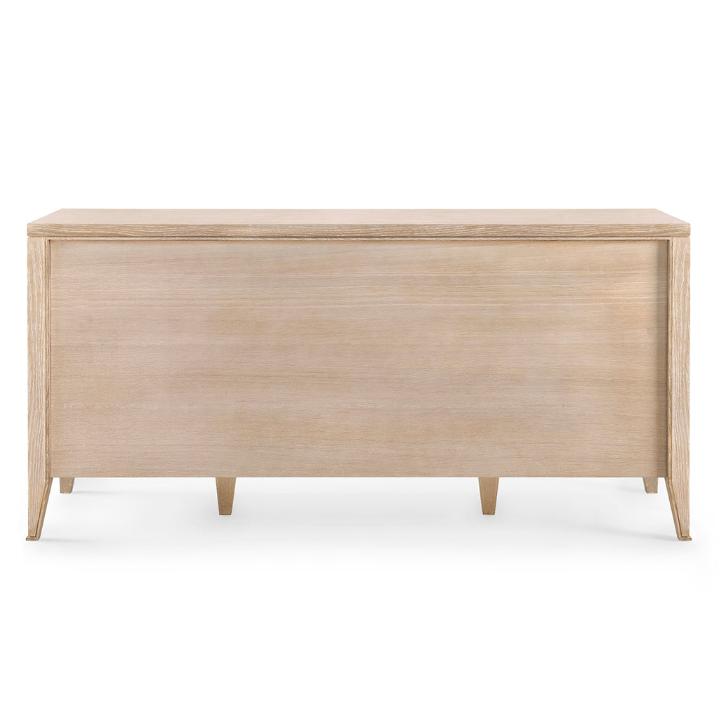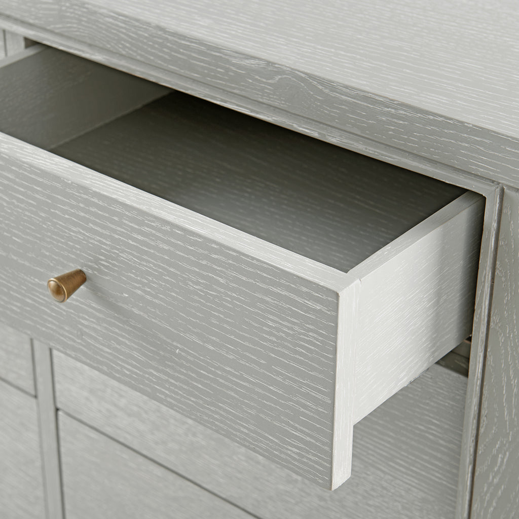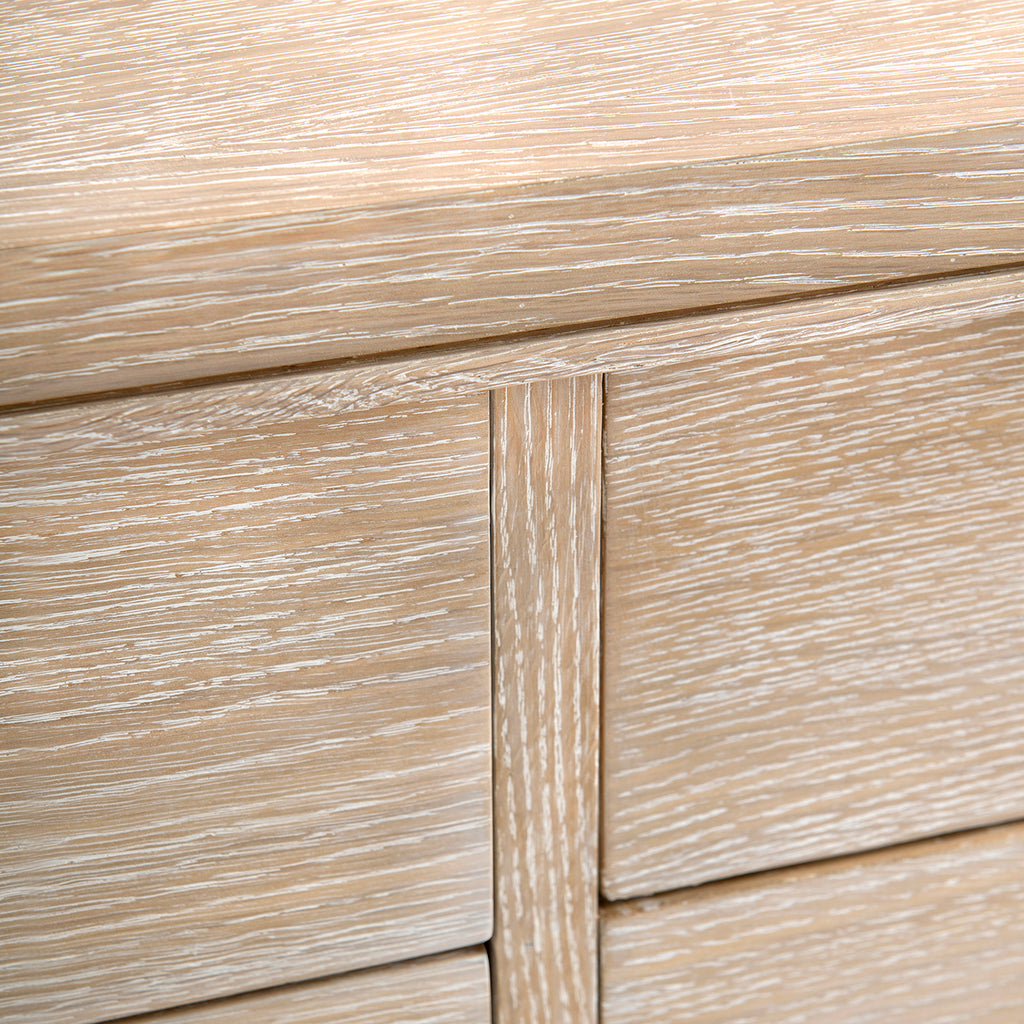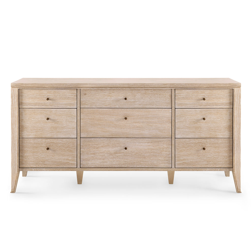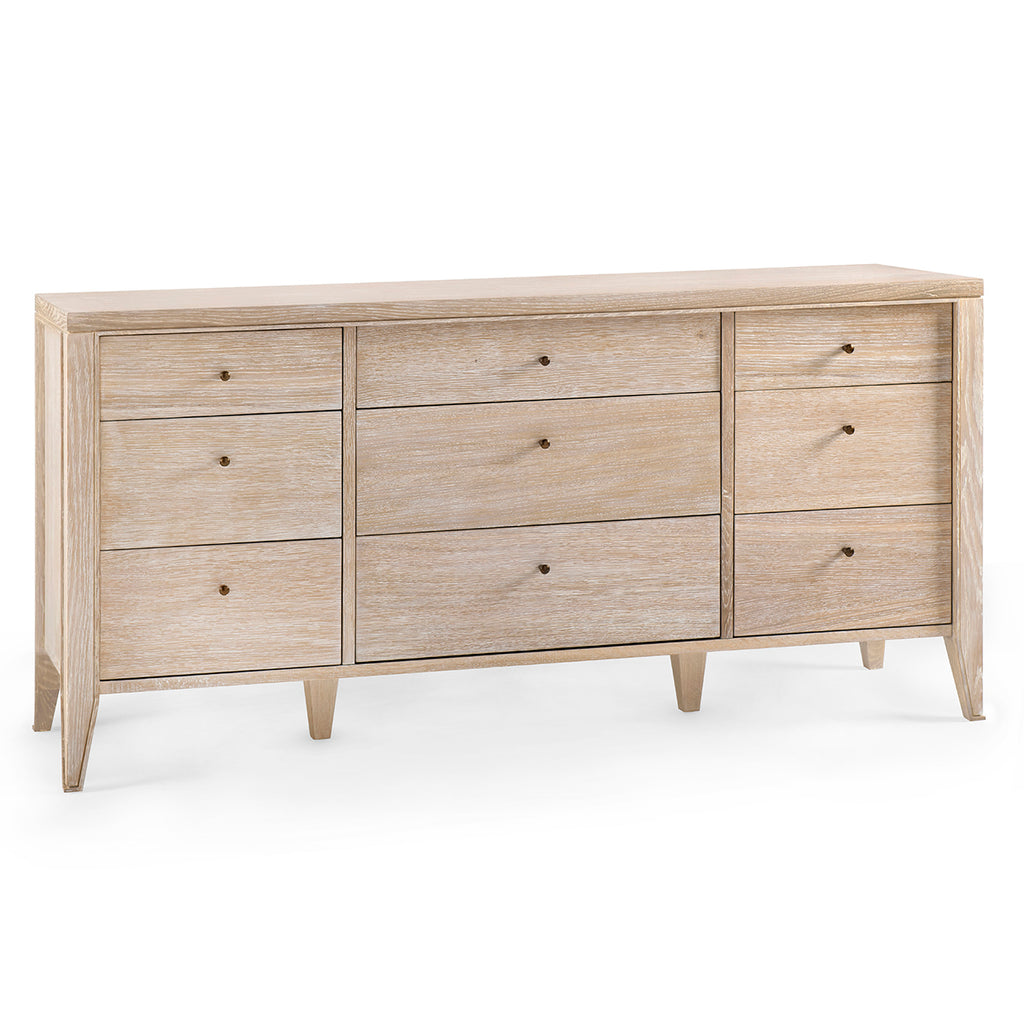 The V&H Paola 9-Drawer Extra Large Dresser features oak veneer interior, soft closing glides, and bronze pulls. The straight, parallel lines use shadow to affect the appearance of a piece and amplify the furniture's reveals. As a light-colored wooden side table, there is a hint of something almost Scandinavian, but the overall impression is chic and French. The Paola Collection features V&H's signature process of cerused oak, drawing out the complexities of the wood grain.