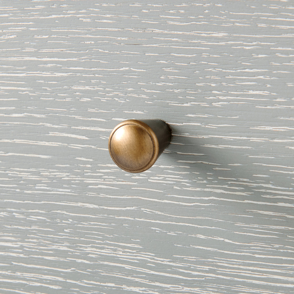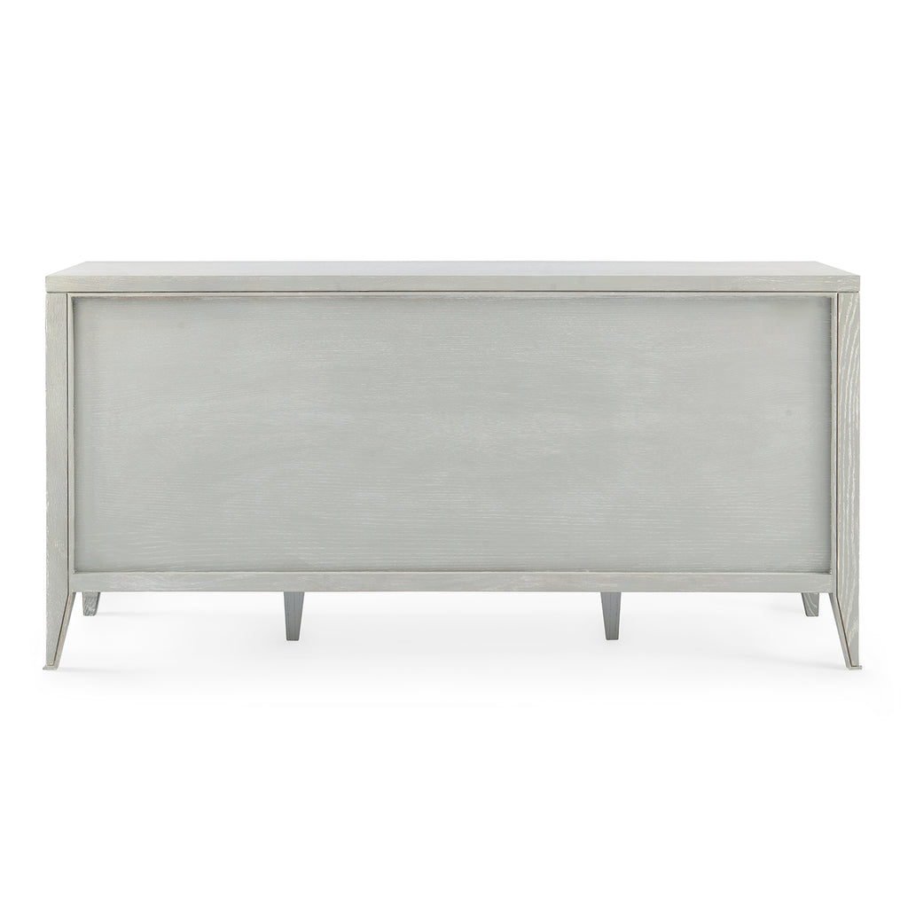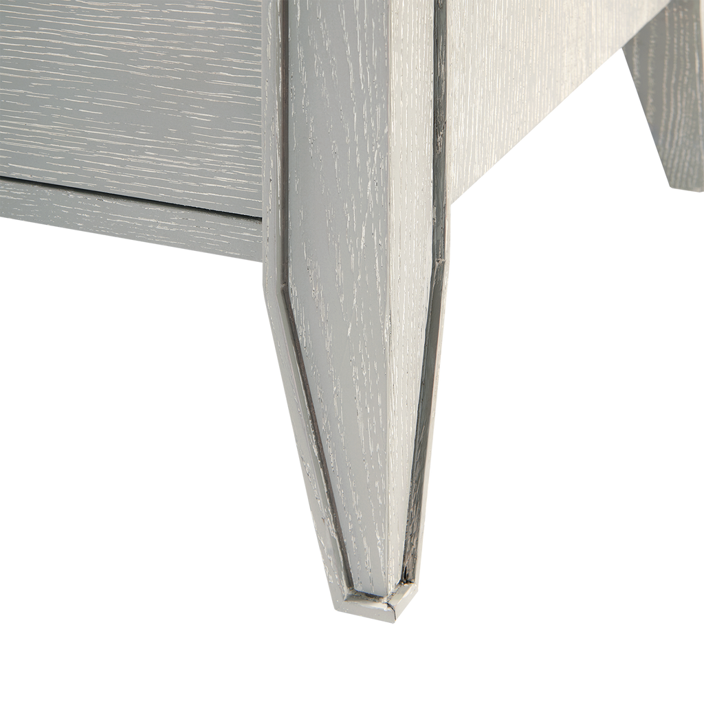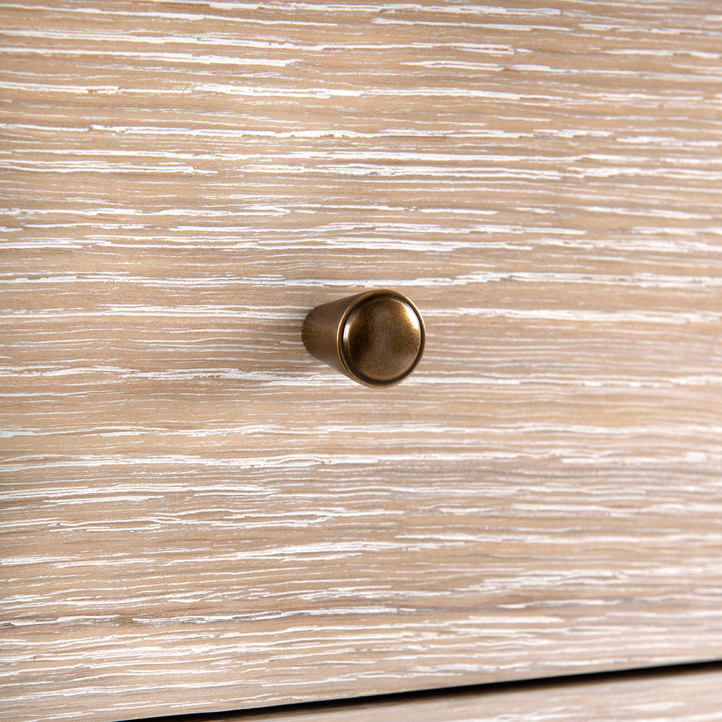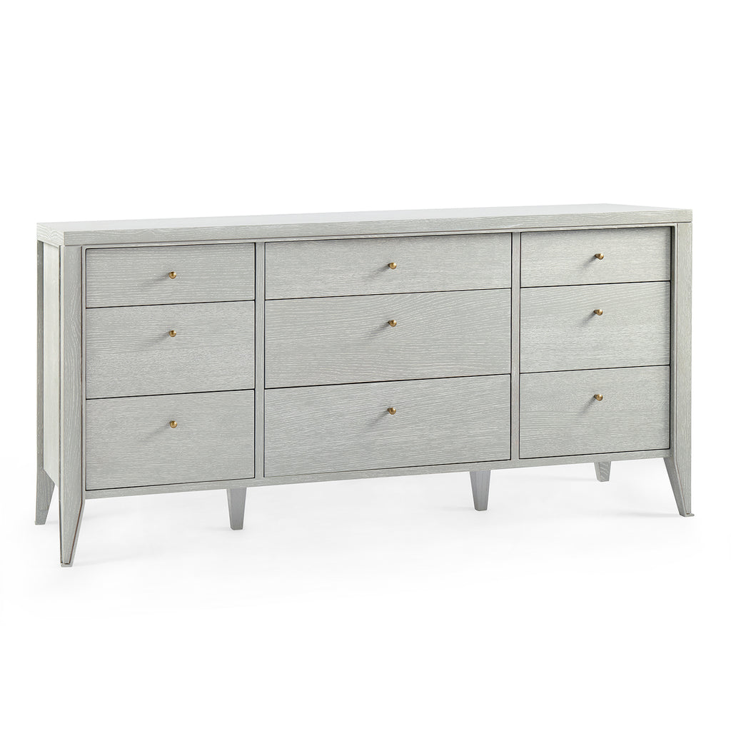 The V&H Paola 9-Drawer Extra Large Dresser features oak veneer interior, soft closing glides, and bronze pulls. The straight, parallel lines use shadow to affect the appearance of a piece and amplify the furniture's reveals. As a light-colored wooden side table, there is a hint of something almost Scandinavian, but the overall impression is chic and French. The Paola Collection features V&H's signature process of cerused oak, drawing out the complexities of the wood grain.