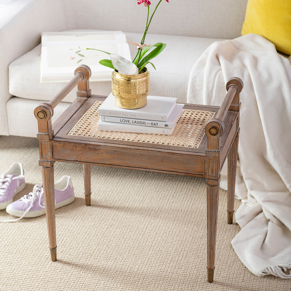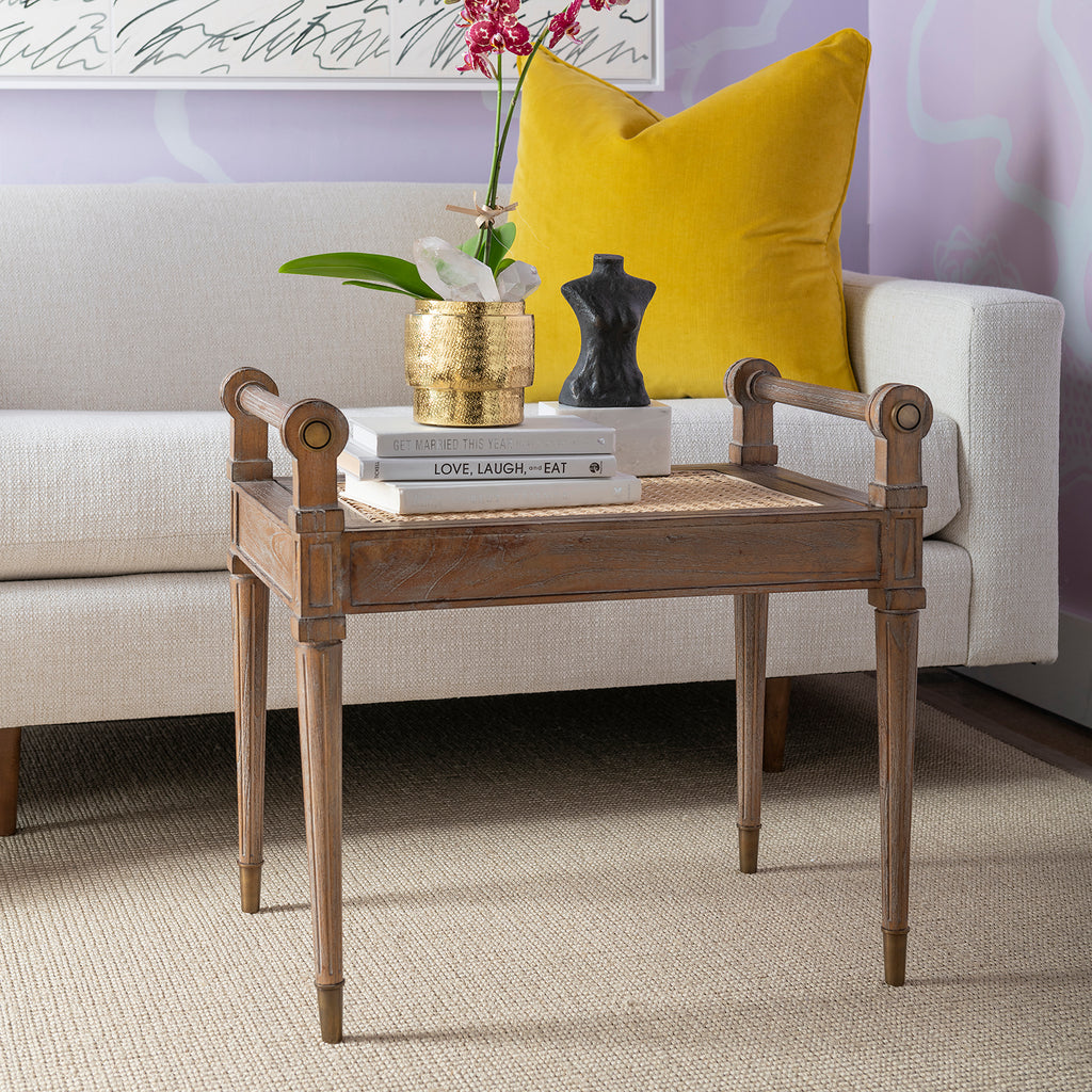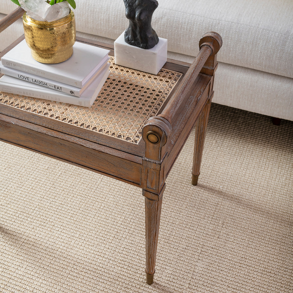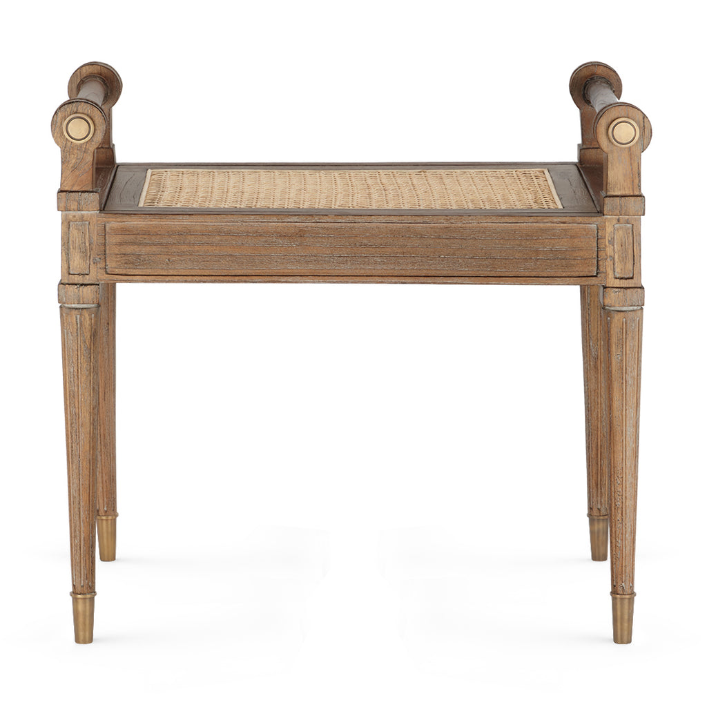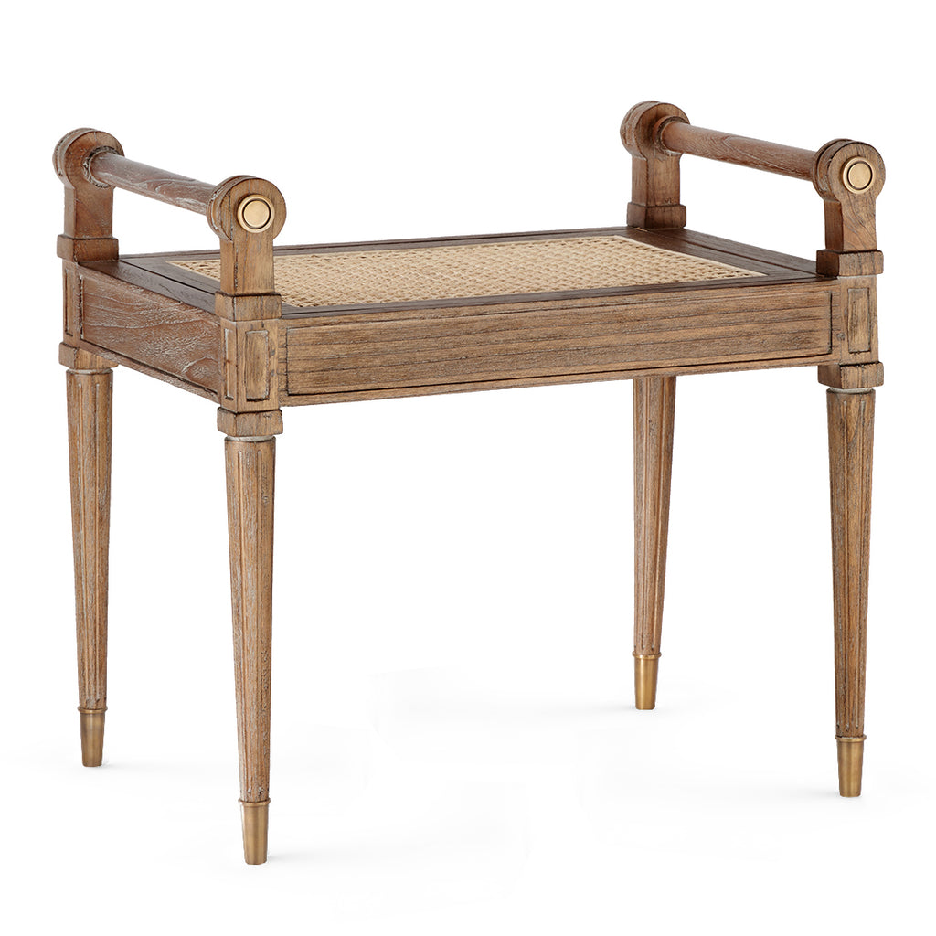 With hand-tied double-layered caning, intricate hand-carved features, and metal accents reminiscent of French antiques, the Paris Bench is ultimately timeless and classic. V&H's signature cerused oak process adds a white contrast to the fine details of a wood's grain, enhancing the beauty and delicate natural patterns of lumber. The bench is available in two different sizes: a smaller version most appropriate for tucking under a bathroom vanity or styling as a pair under an entryway console and a larger version best at the foot of a bed, flanking a dining table or as a convenient place to sit in a big entryway.