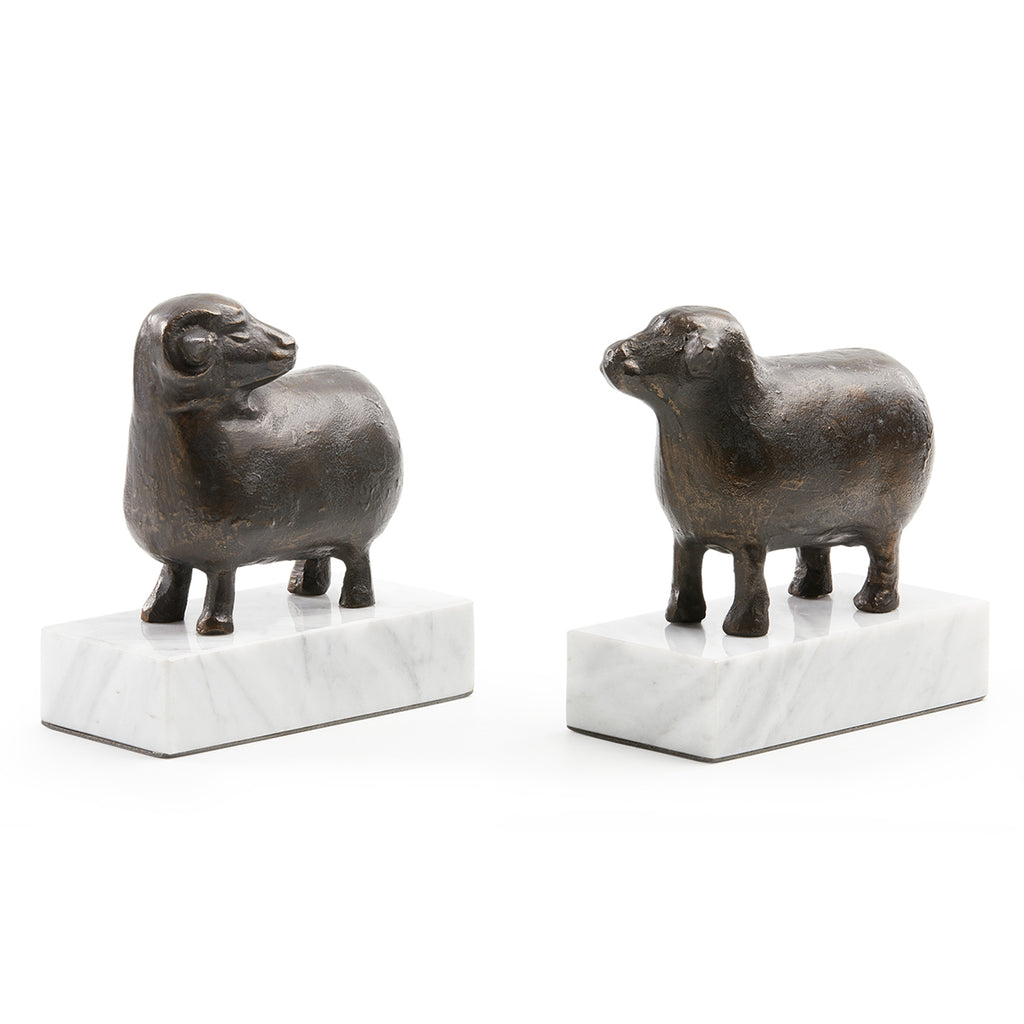 The Villa and House Sheep Bookends feature a delightful pair of a ram and ewe, available in bronze and gold leaf finishes, each sitting on a white marble base. Whether helping you count sheep in the bedroom, holding up cookbooks in the kitchen, or adding character to open shelves, this set combines fun and function effortlessly.