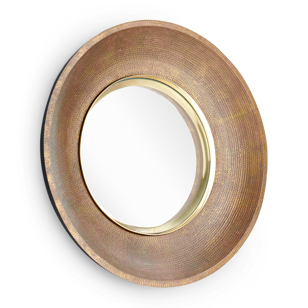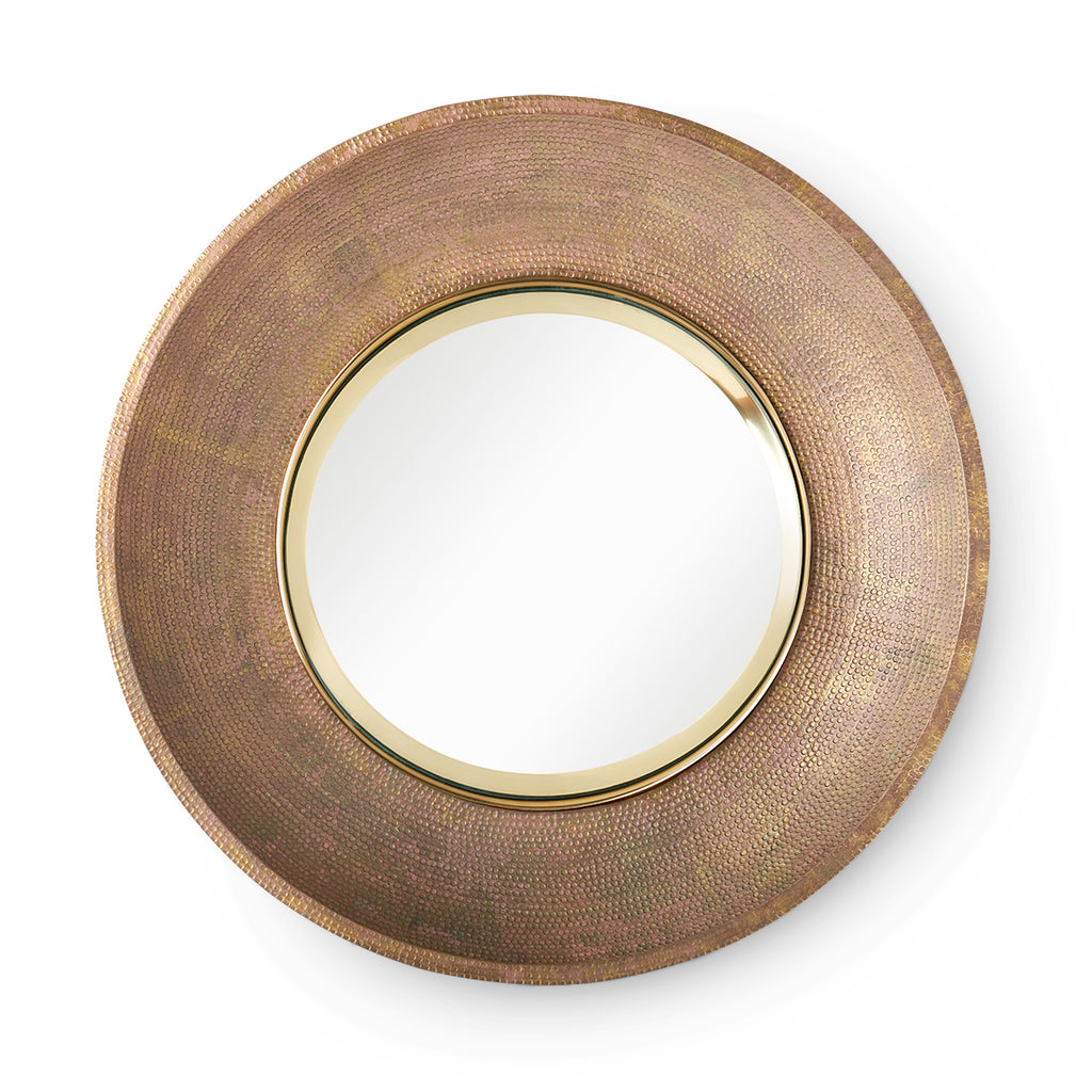 Meet the Stella Mirror: a round convex mirror with a thick textured antique brass frame and a polished brass edge. V&H’s mirrors begin as sheets of glass and are silvered by hand to achieve the optimal reflective quality we expect. The metal’s patina effect is akin to a Renaissance feel, with a rich, red gesso-like finish. The brass is hand-hammered in an intricate dot pattern, adding to the mirror’s luxurious attention to detail. As this piece is on the smaller side, it is most suitable collaged in an entryway or, perhaps, hung over a bed. Please note that there are D-rings installed for ease of hanging.