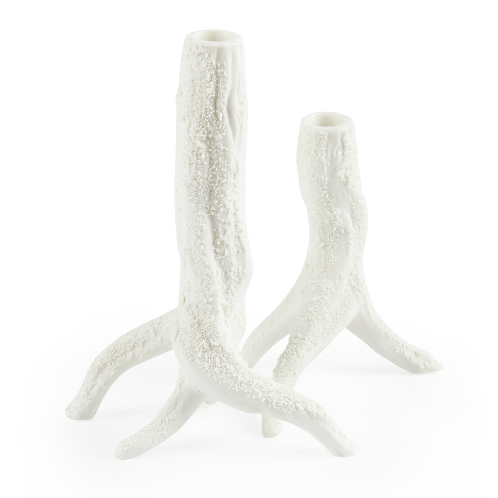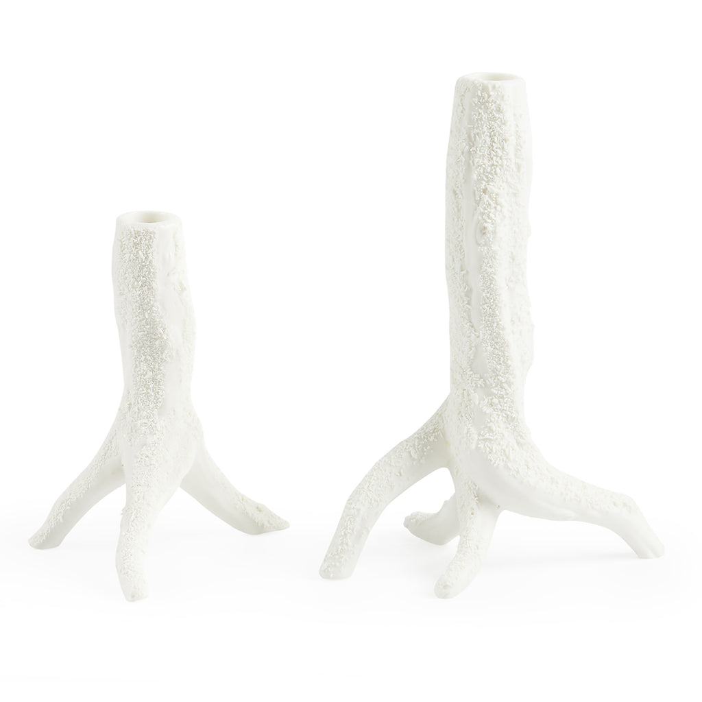 The Villa and House Vinyeron Candlesticks Pair capture the organic beauty of branching vine roots with their textured, sculptural design. Their irregular shape, featuring multiple arms rooted firmly at the base, creates a striking visual appeal. Its matte white finish echoes the rugged texture of branches, adding a tactile element. Ideal for those who appreciate unique, nature-inspired decor, the Vinyeron Candlesticks merge modern artistry with organic charm.