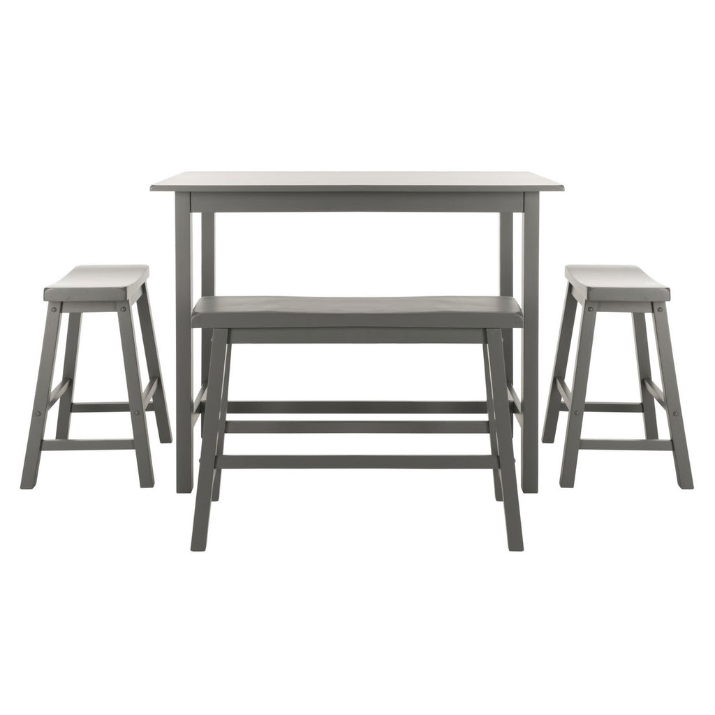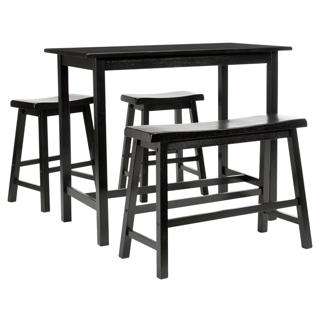 The transitional 4-piece pub table set is the ideal addition to kitchen, studio apartment, family room or entertainment room. Crafted from sturdy Malaysian Oak, it features a table, two low profile barstools and coordinating bench. As a bonus, use it for extra counter space for service during buffets and parties.