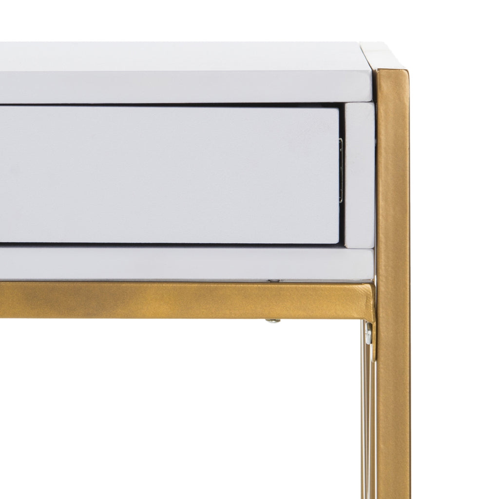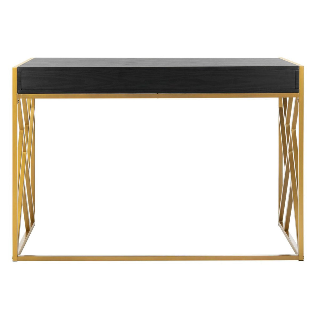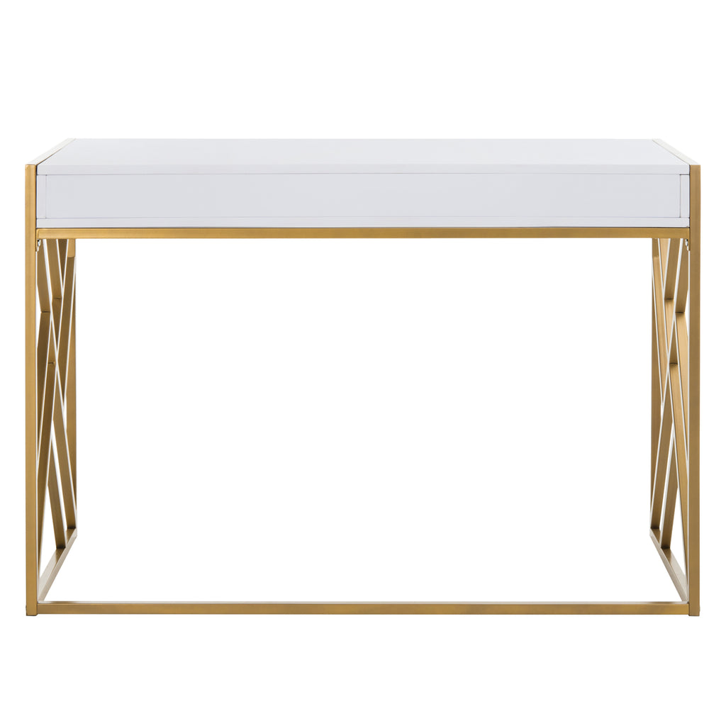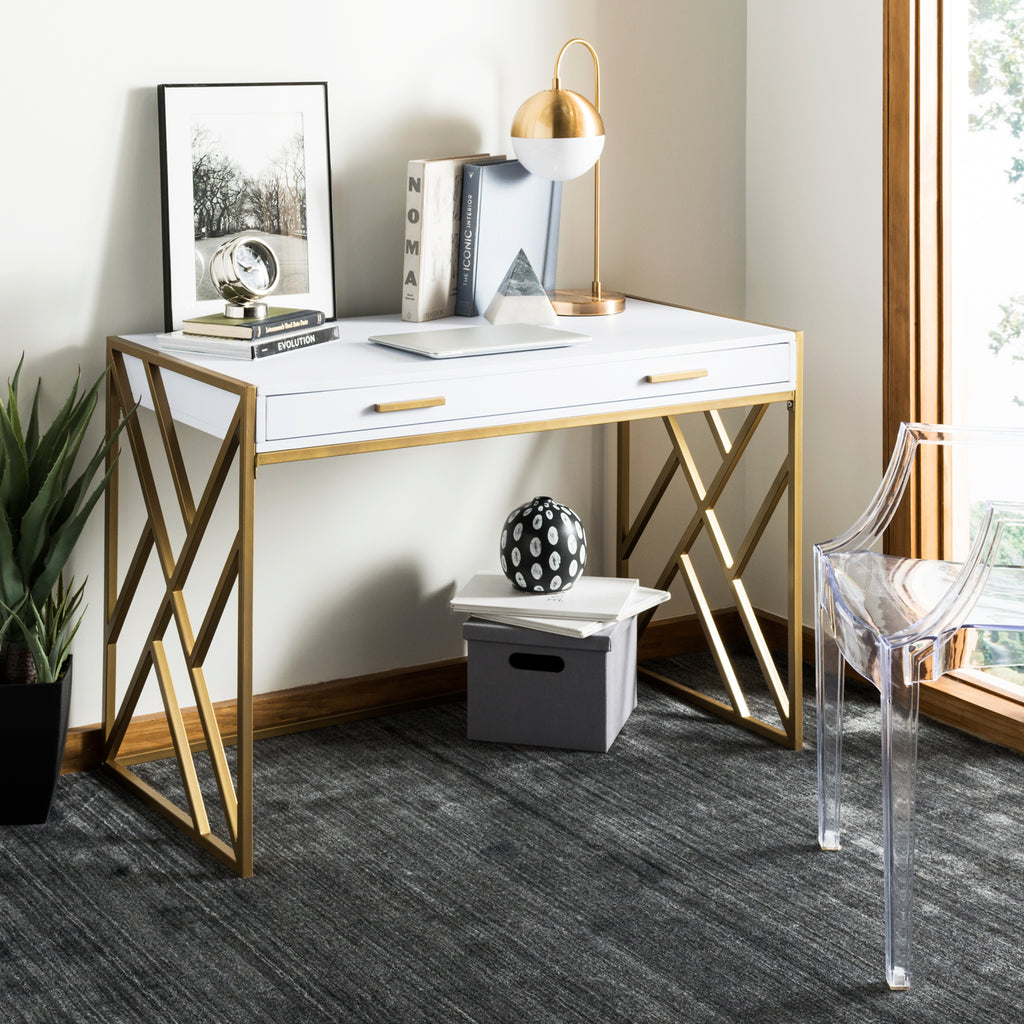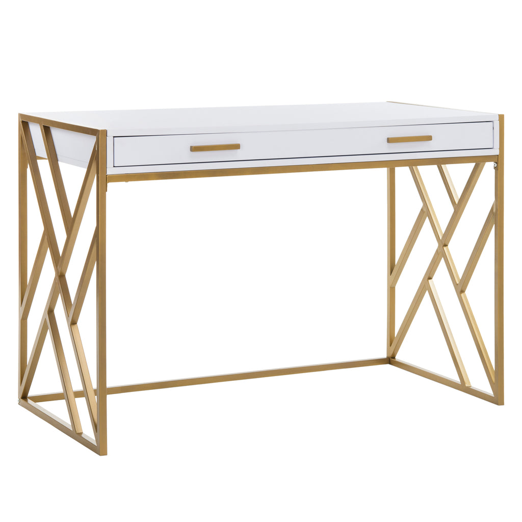 An instant promotion for any office design, this contemporary 1-drawer desk brings style and substance to the workplace. Its sleek white, black or natural finish is paired with a sculptural geometric frame finished in rich gold. Ample drawer space ensure organization.