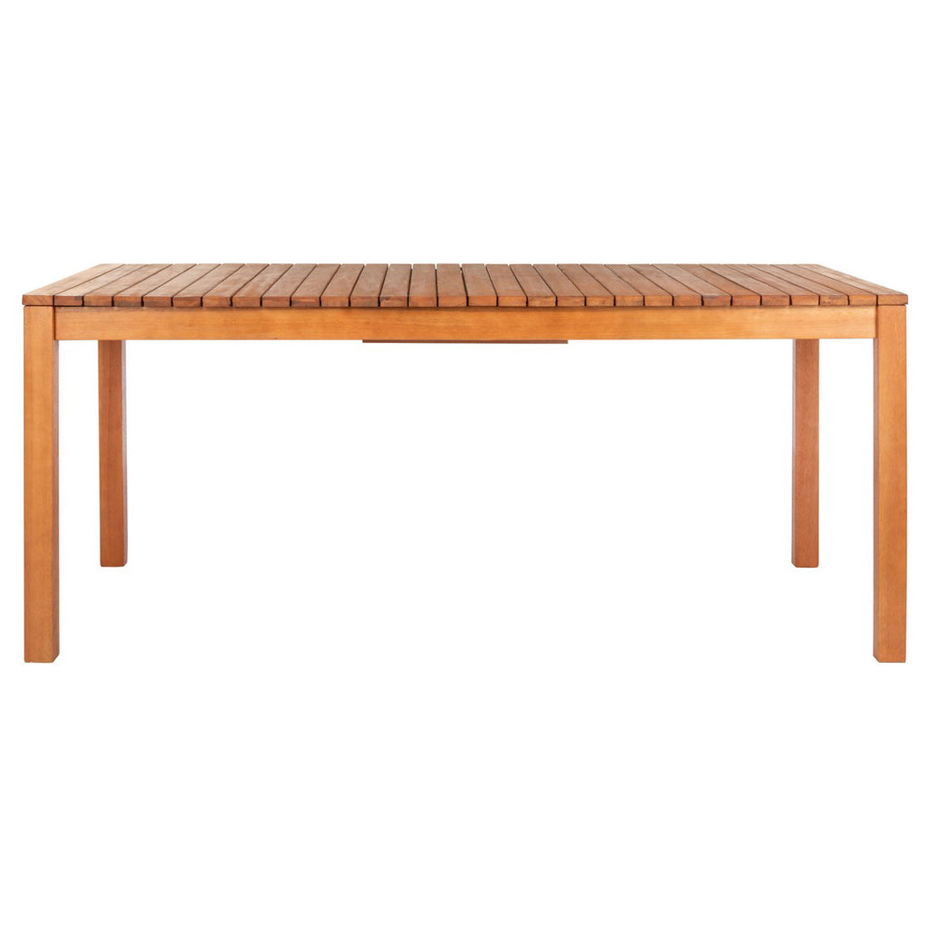 Bold and beautiful, this contemporary outdoor dining table was designed for entertaining with form and function. Perfect for hosting grand summer parties, an ample extra leaf can be instantly added to its expansive and durable natural eucalyptus wood top.