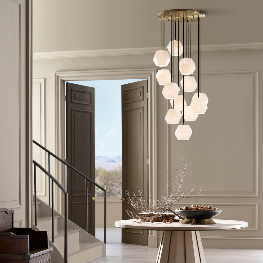 A study in form and beauty, The Indicus Chandelier is a sculptural statement. Glass geometry glows when illuminated to create a graceful light source and reflects natural light with subtlety and charm. The multi-drop elements suspend from height-adjustable cords for custom flexibility across a myriad of applications. (Each wire is 10.5ft long and can be adjusted to suit any space)