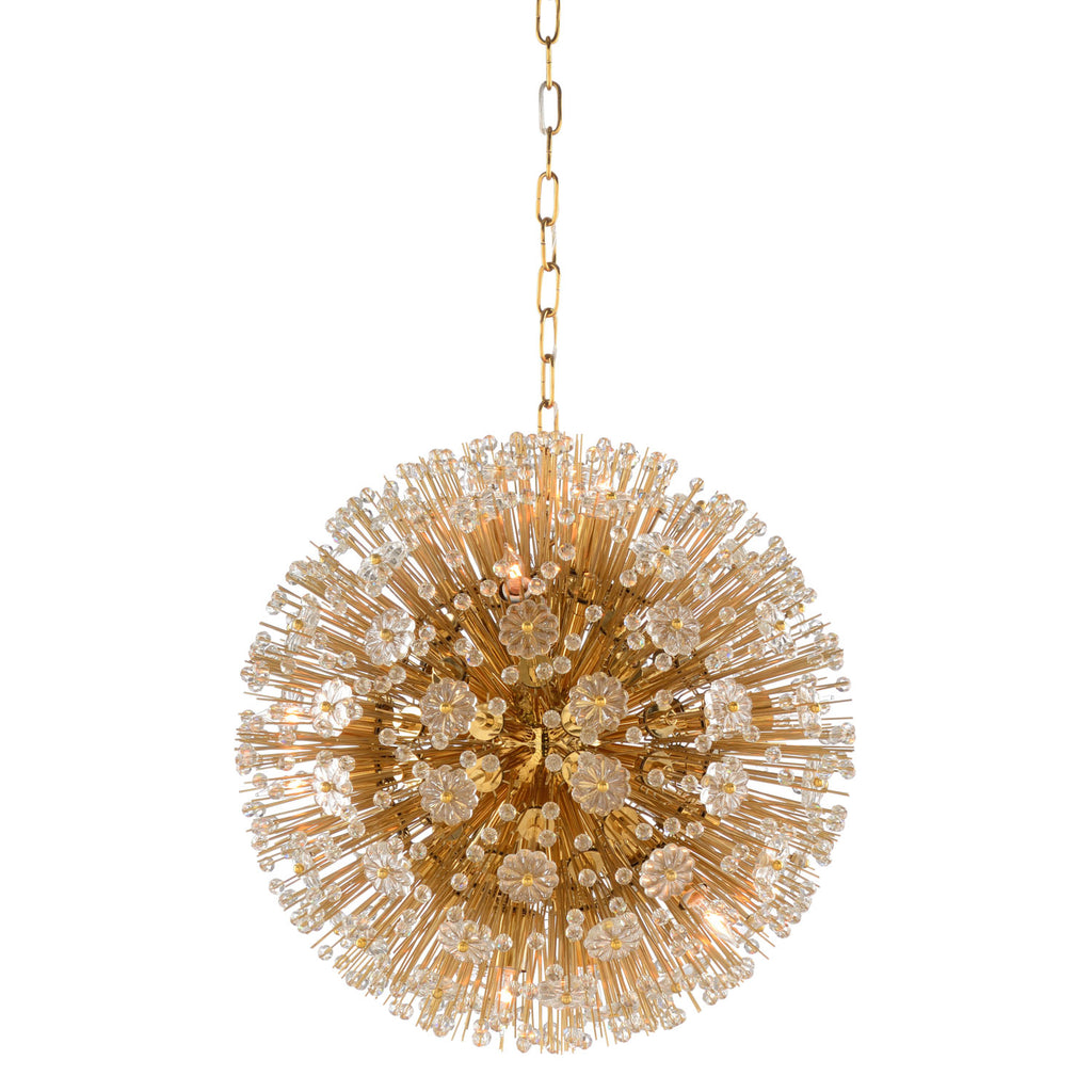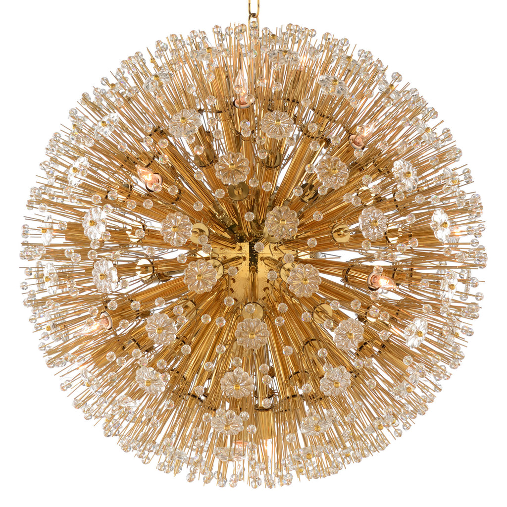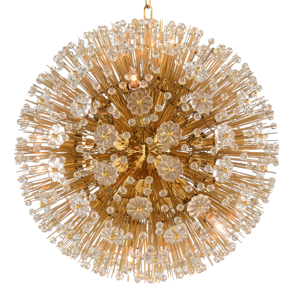 Illuminate your space with the soft glow from this luxurious chandelier from Wildwood. Lavish yet effortlessly beautiful, this lighting fixture captivates in any room. 1930's hollywood regency chandelier, sparkling crystal flowers & faceted beads burst from the center orb.