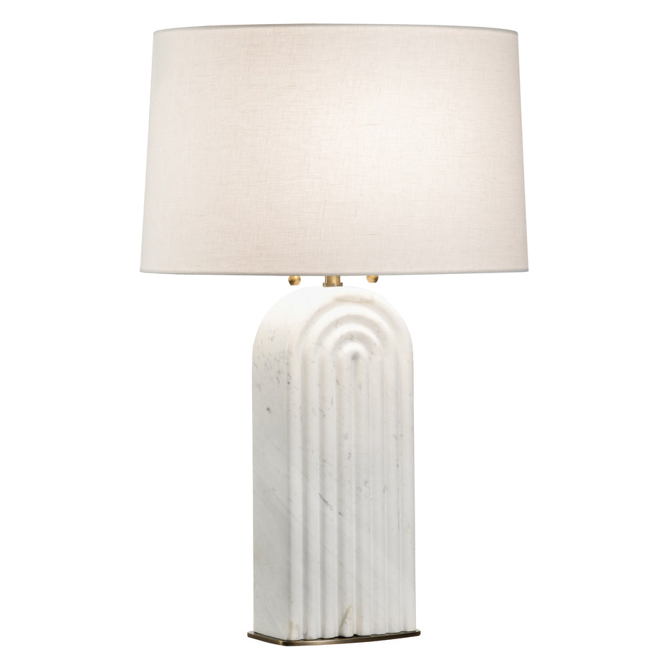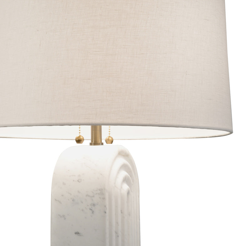 The Lyssy Table Lamp is a celebration of form, material, and Art Deco influence. The honed Carrera marble body is carved to create a delicate play of light and shadow.