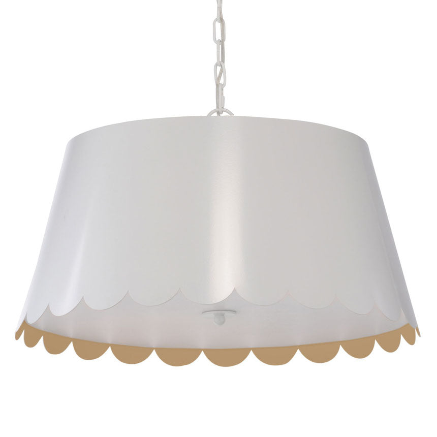Designed for Wildwood by Meg Braff Designs, this sleek pendant features a playful scalloped detailing suspended from a white chain. (Inside of shade is gold). Mirasol pendant will add a fun pop of color to a child's room, a breakfast nook or a small foyer. Comes with a 5in canopy and 6ft of chain.
