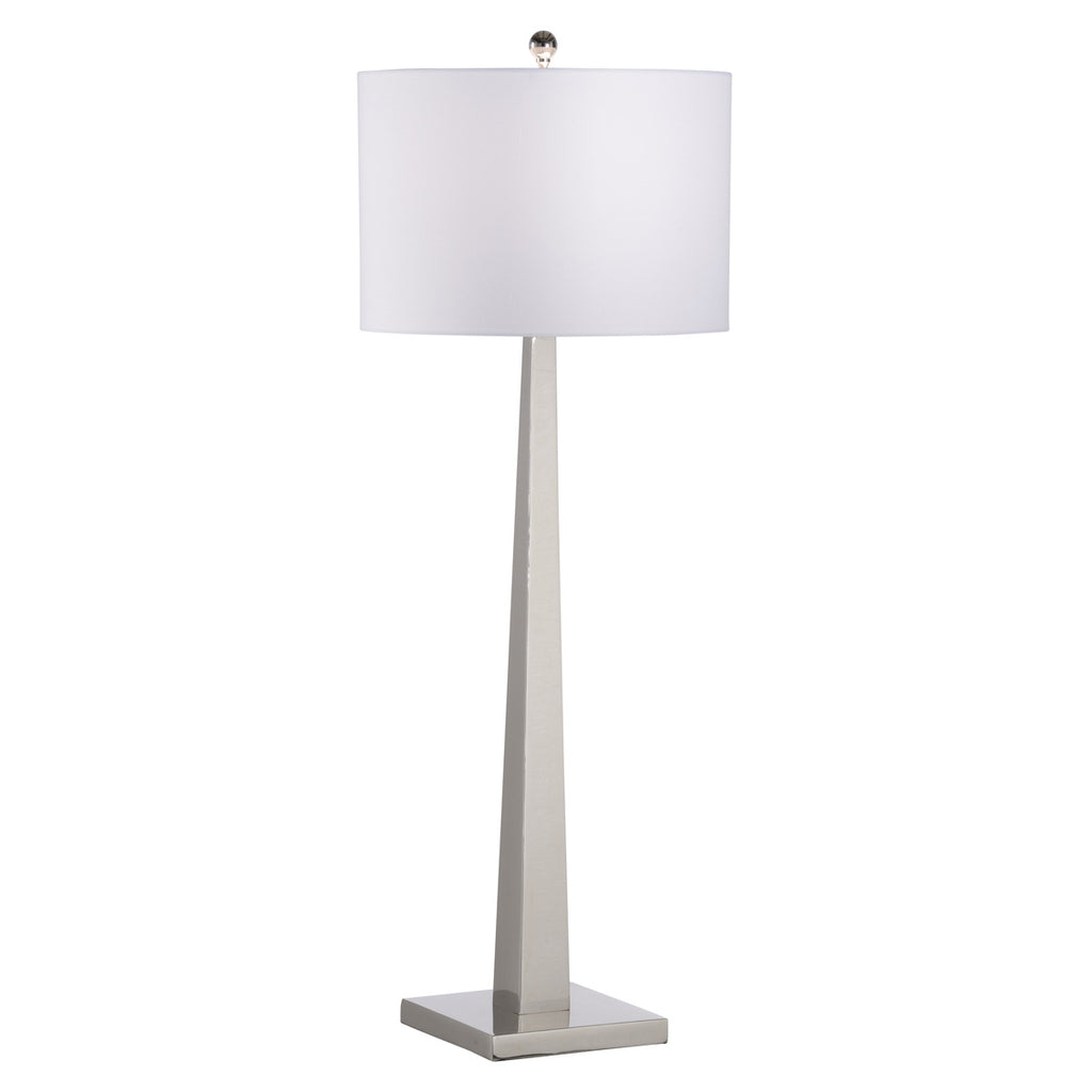 Illuminate your home or office with this transitional table lamp that offers a minimalist design yet provides maximun beauty and function. This 44" high gloss nickel lamp reflects light from under the elegant, white linen drum shade, filling the space in an open foyer, master suite or great room.