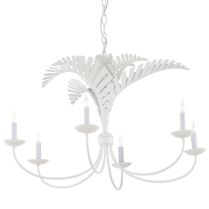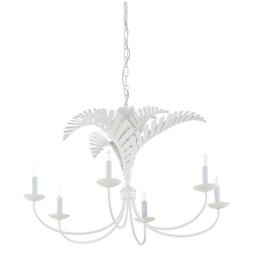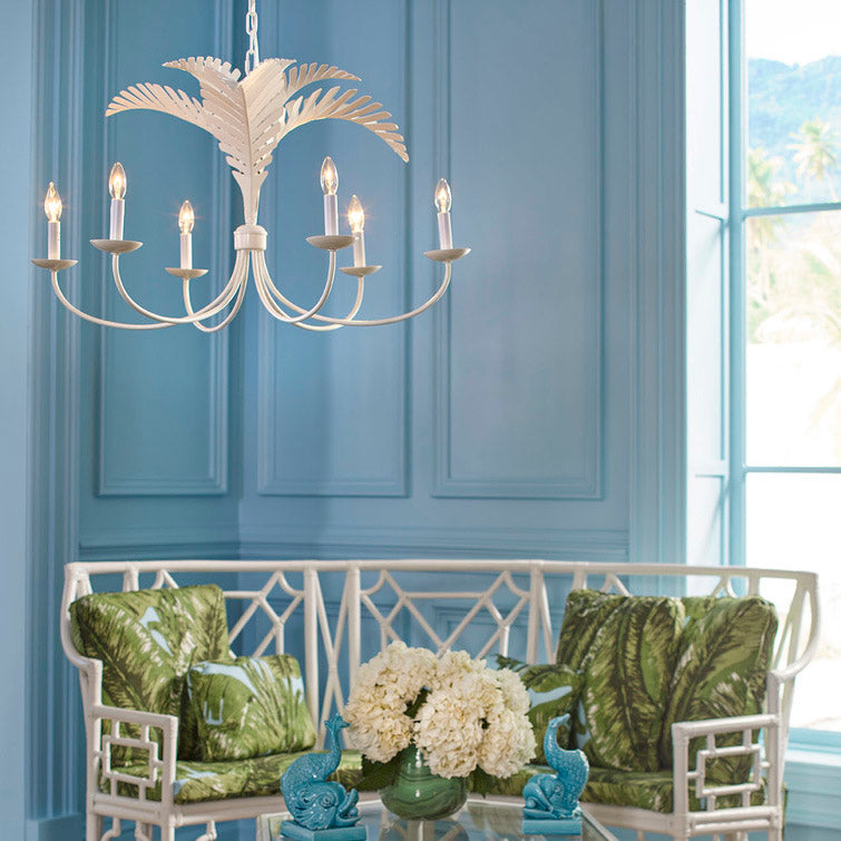 Designed for Wildwood by Meg Braff Designs, Royal Palm Chandelier is a slender tole six arm chandelier with palm frond details. This chandelier was inspired by the foliage of Palm Beach to complement your coastal decor. Comes with a 5in canopy and 6ft of chain.